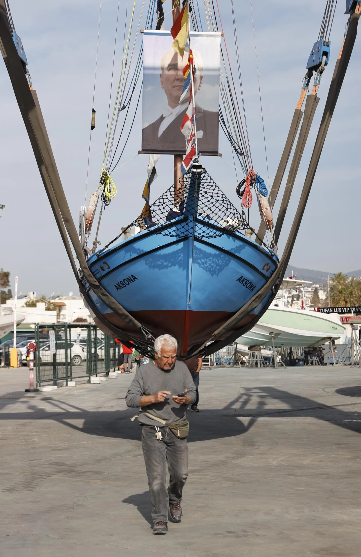 MUĞLA (AA) - Muğla'nın Bodrum ilçesinde "Aksona Mehmet" olarak anılan ve son sünger avcısı olarak kabul edilen 76 yaşındaki Mehmet Baş, 1962 yapımı "Aksona" isimli teknesini bakım çalışmasının ardından yeniden denizle buluşturdu.