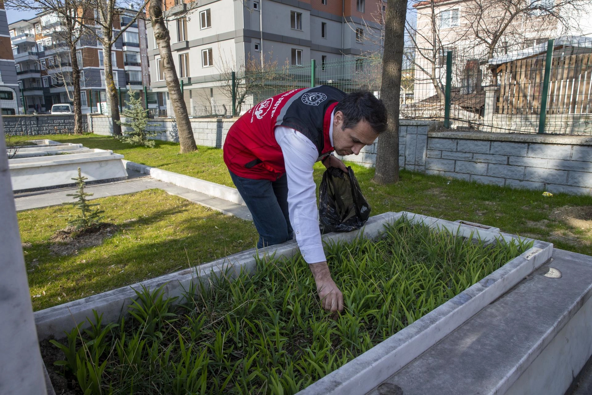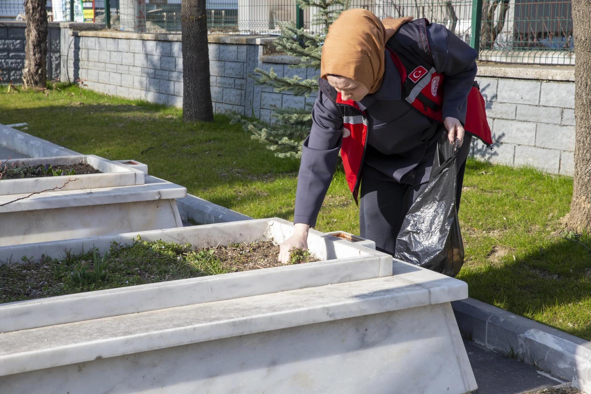 Şehitlikte çevre düzenlemesi ve temizlik yapan ekipler, mezarlardaki kuru ot ve yaprakları topladı.