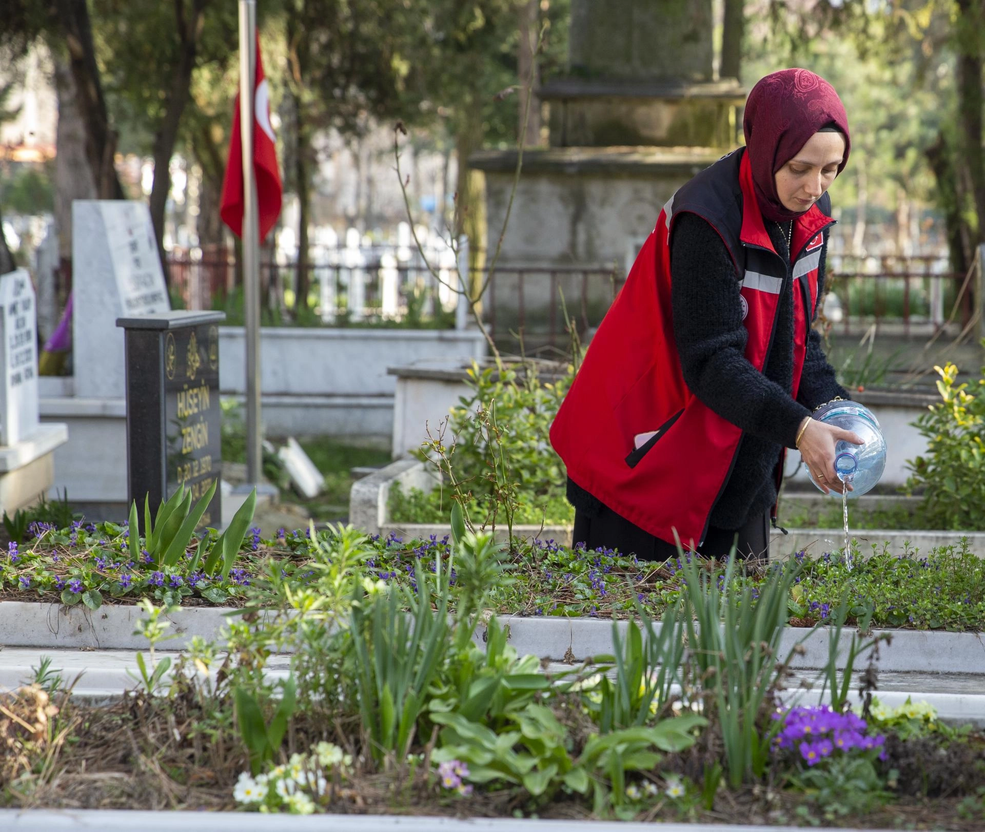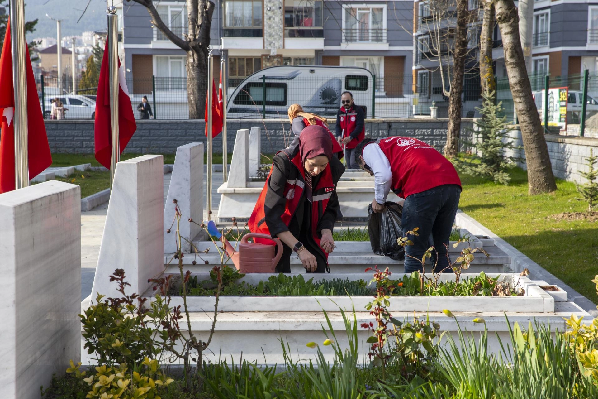 Mezar taşlarının üzerindeki tozları süpüren ekipler, çiçeklerin bakımını da yaparak kabirlere su döktü.