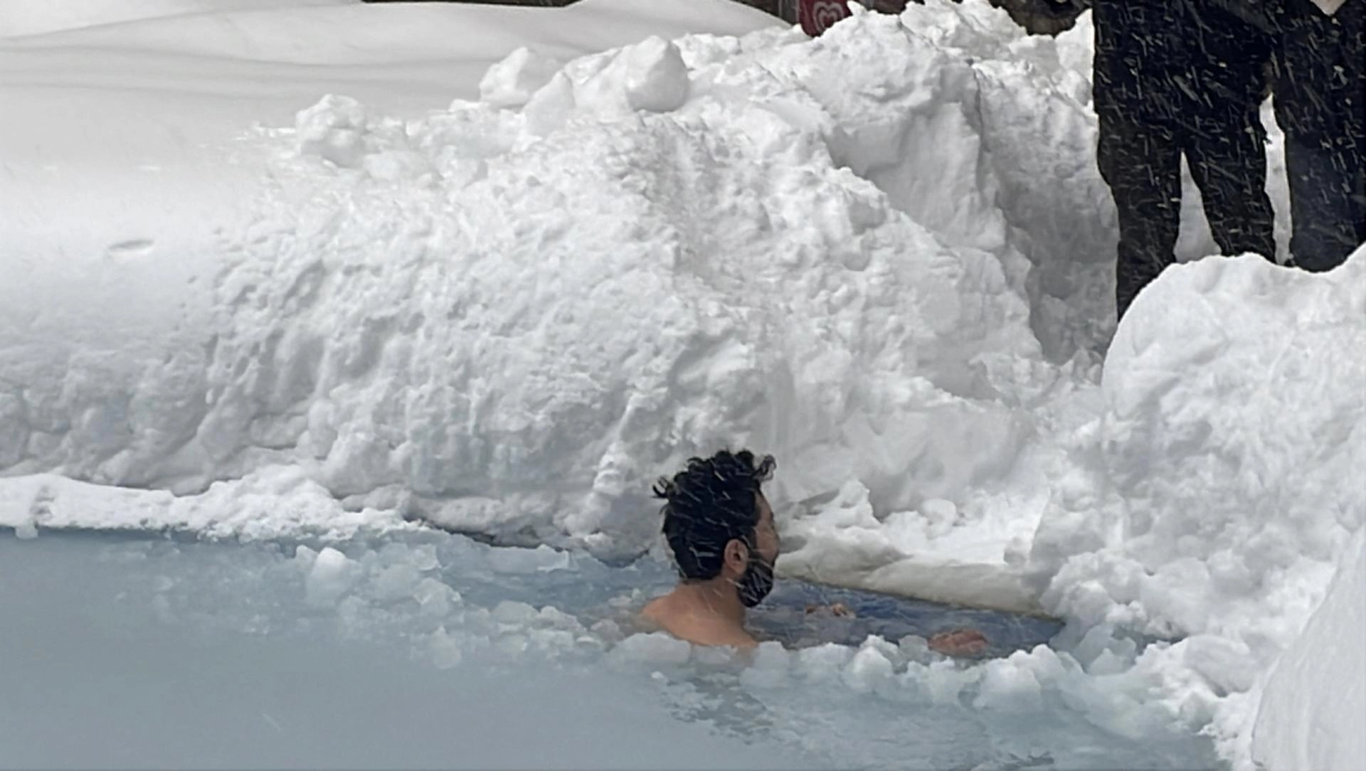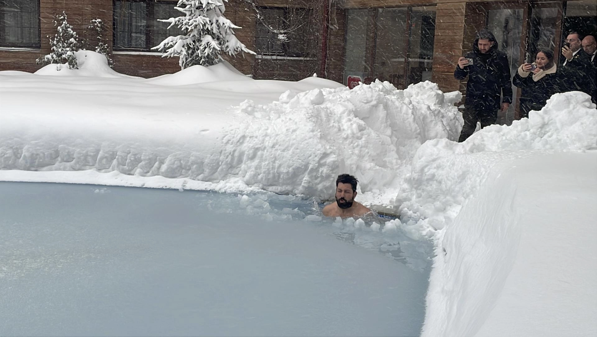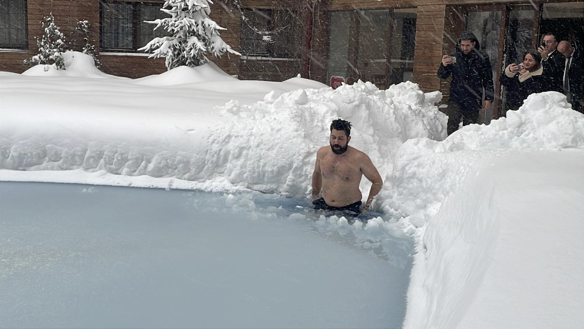 Havuzun yüzeyini kaplayan yaklaşık 10 santimetre kalınlığındaki buzun bir kısmı kürekle kırıldıktan sonra Biri, sıfırın altında 10 derecede havuza girdi.