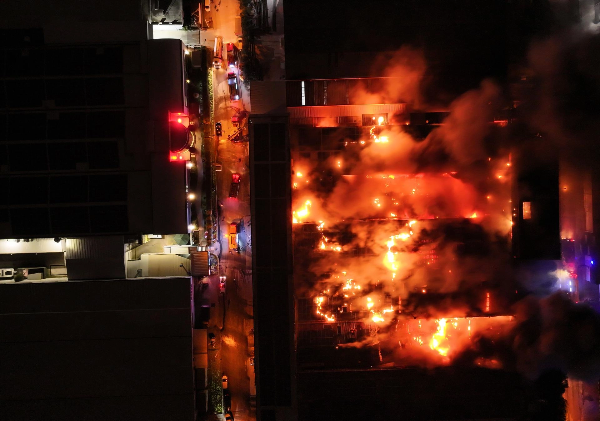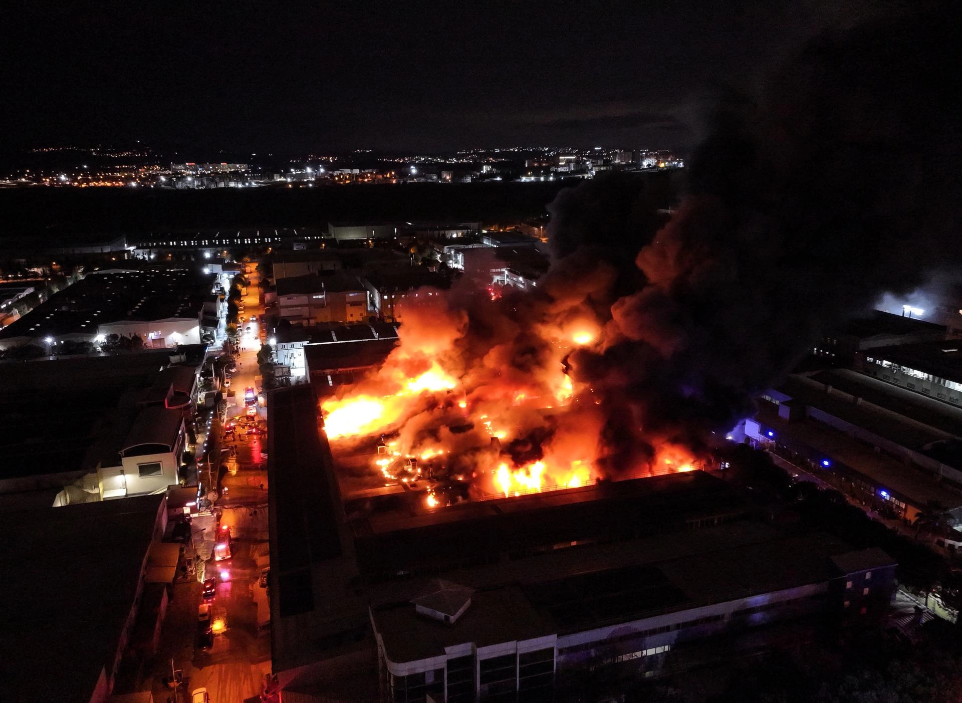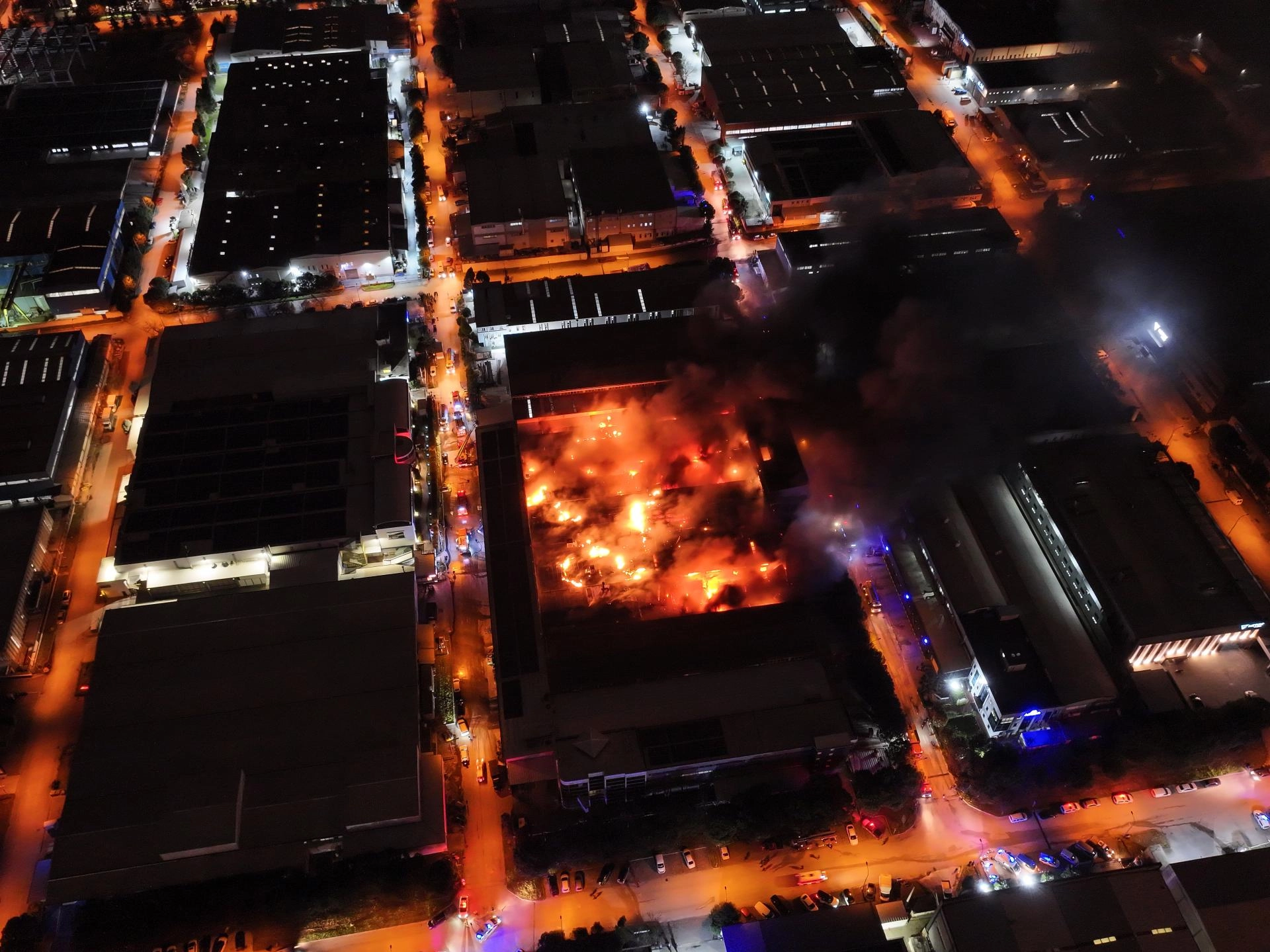 Polis ekipleri çevrede güvenlik önlemi alırken, itfaiye ekiplerinin yangına müdahalesi sürüyor.