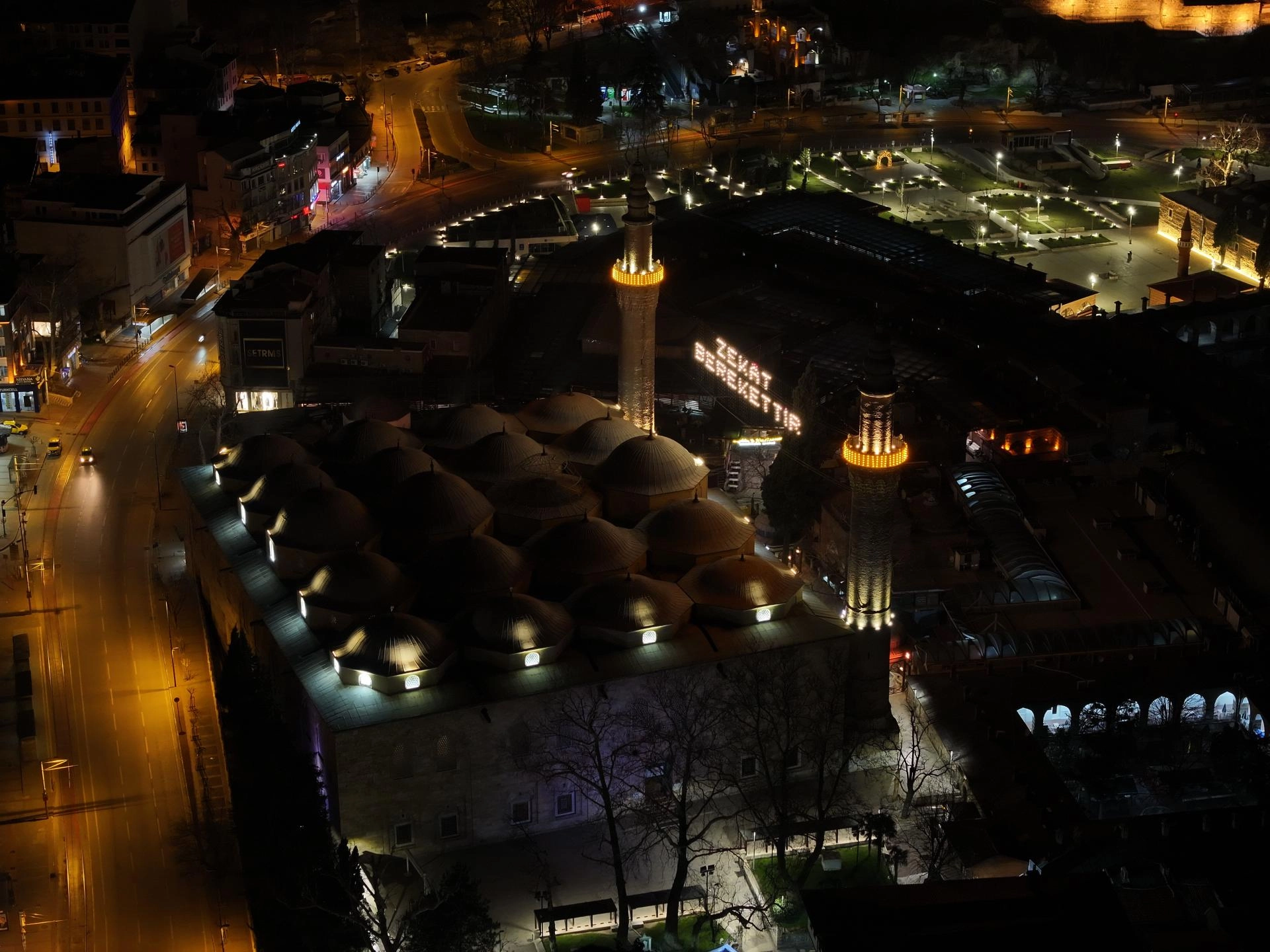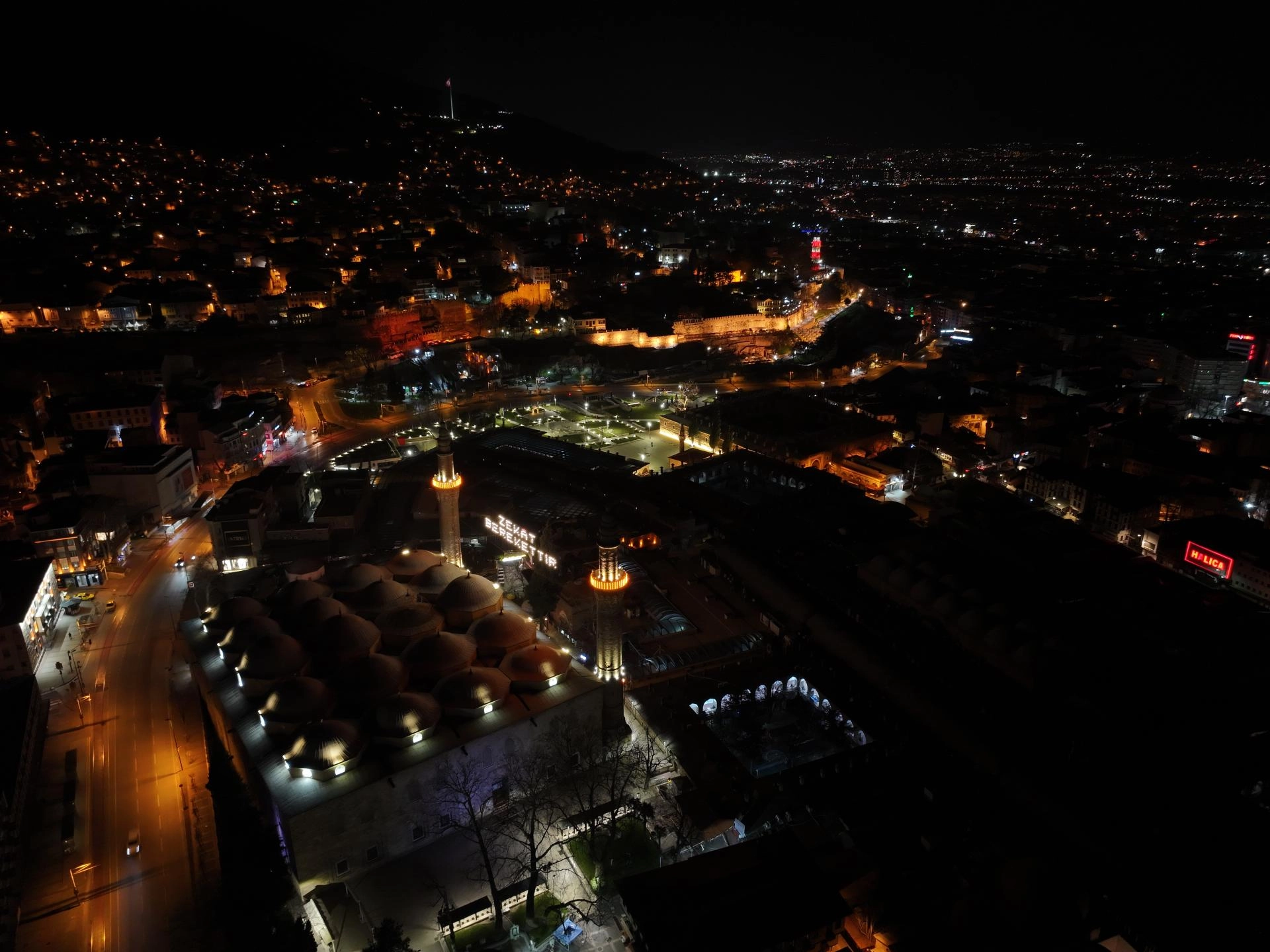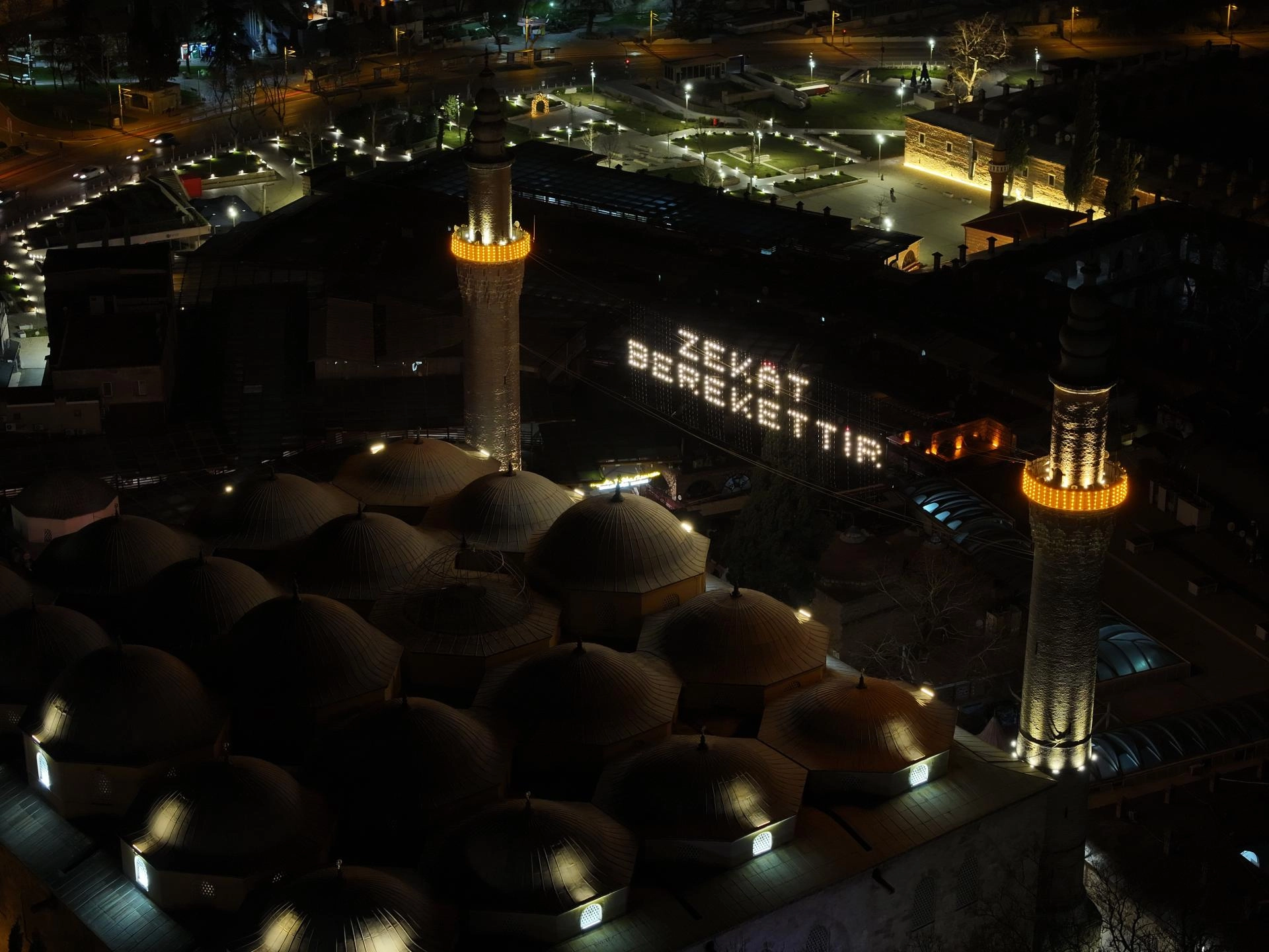 BURSA (AA) - Bursa'daki tarihi Ulu Cami'nin minareleri arasına "zekat berekettir" mahyası asılıyor.