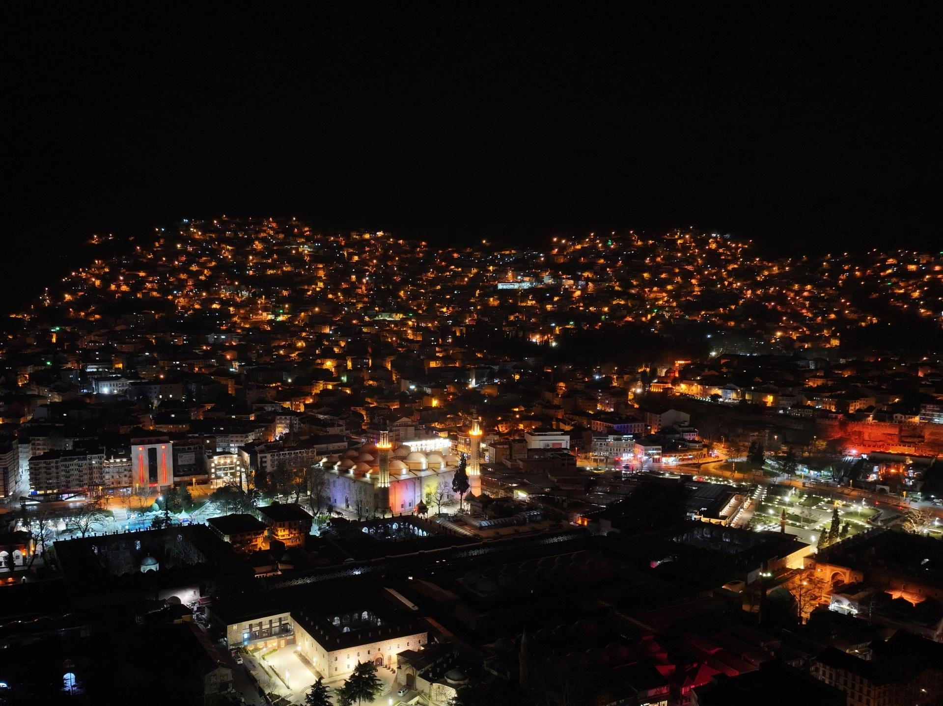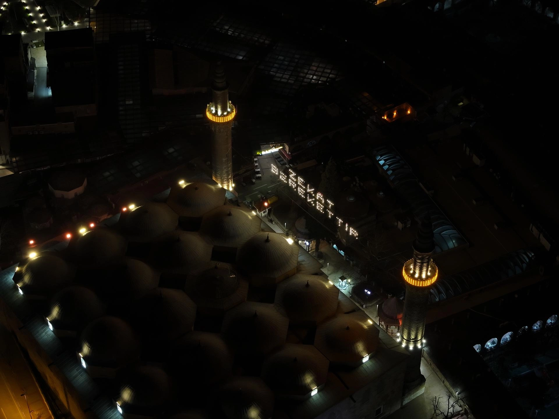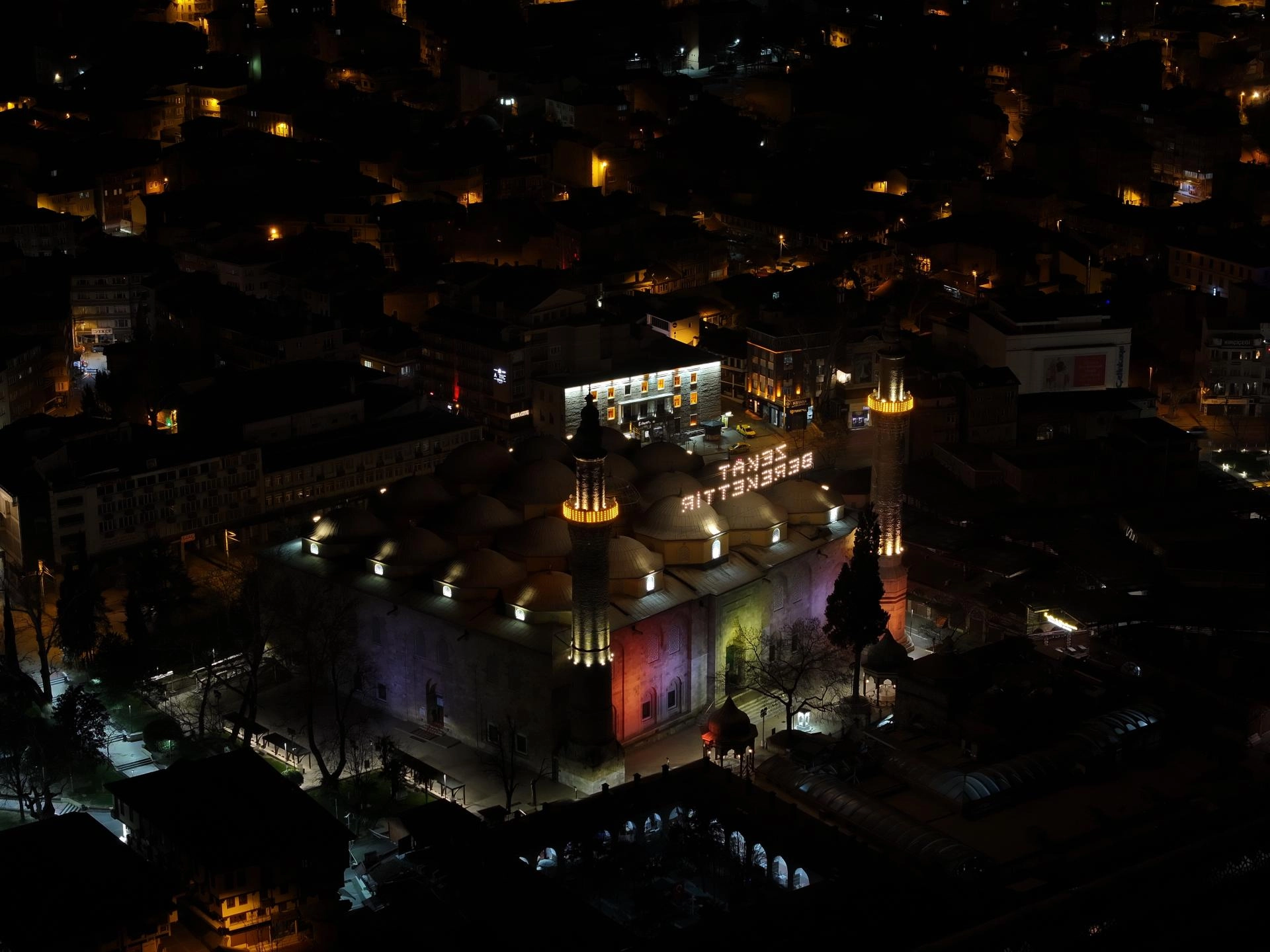 Tarihi Ulu Cami'ye Kültür ve Turizm Bakanlığı Bursa Vakıflar Bölge Müdürlüğü koordinasyonunda Osmanlı'nın son mahyacısı Hacı Ali Ceyhan'ın çırağı Kahraman Yıldız'ın başında olduğu ekip tarafından hazırlanan mahya asılıyor.