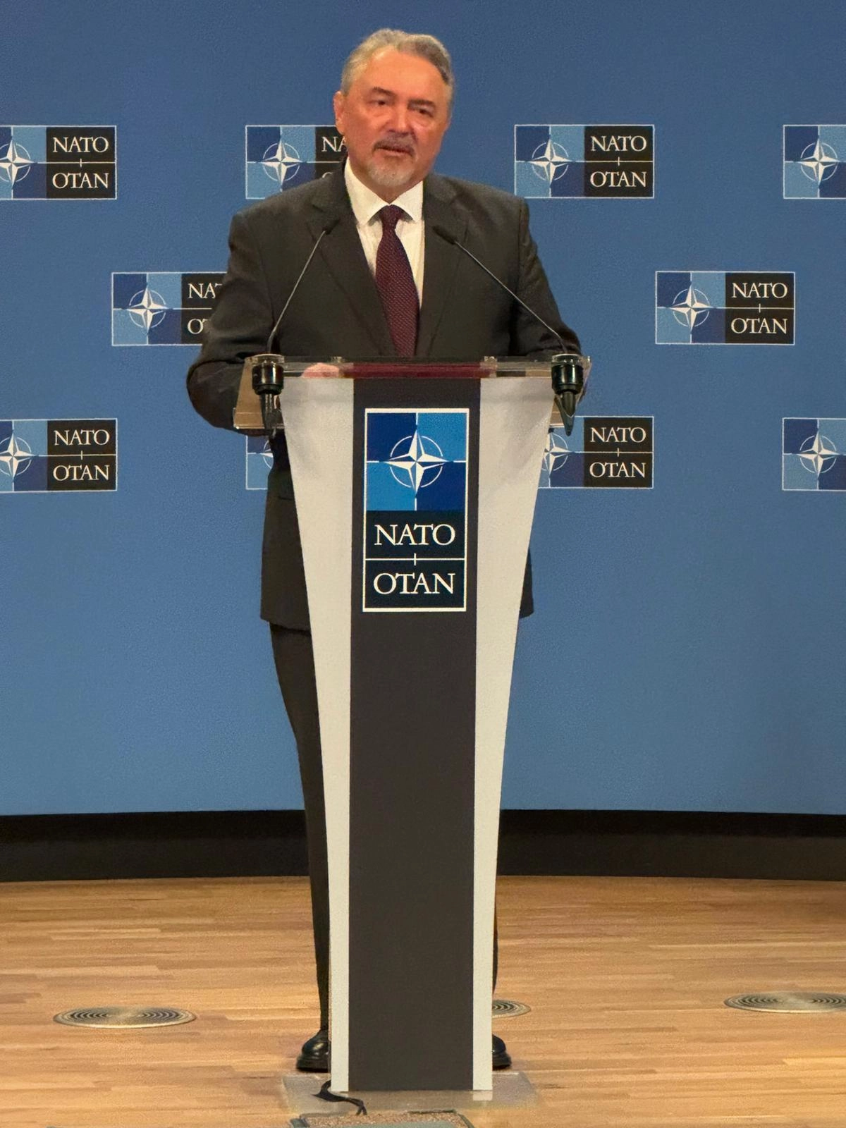 Brüksel'deki NATO karargahında düzenlenen törende, İstiklal Marşı okundu ve saygı duruşunda bulunuldu.
