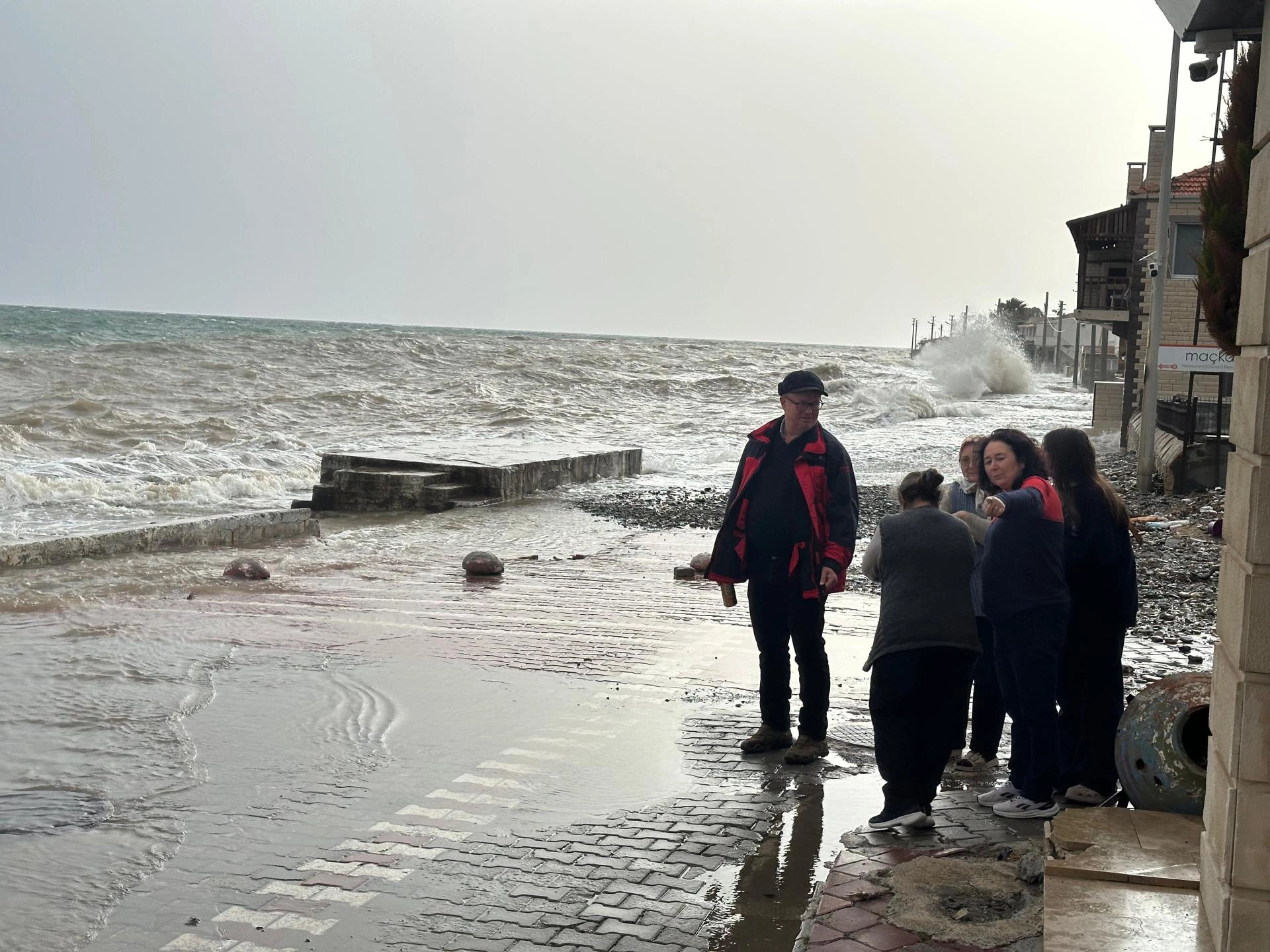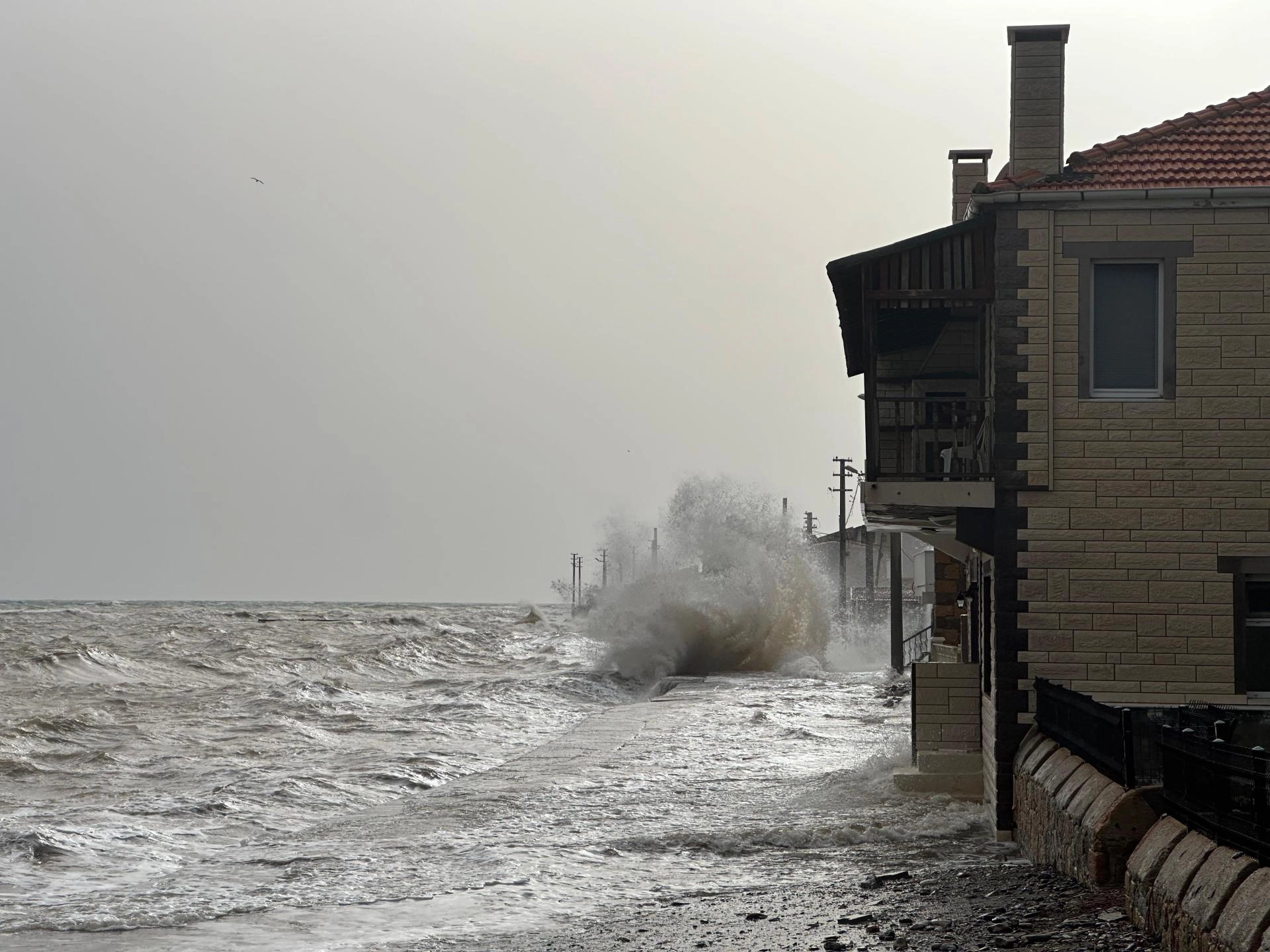 Ayvacık'ın Küçükkuyu beldesinde Sahil Mahallesi'ndeki kordon, deniz seviyesinin yükselmesi nedeniyle sular altında kaldı. Denizdeki bir tekne de dalgalarla birlikte karaya çıktı.
