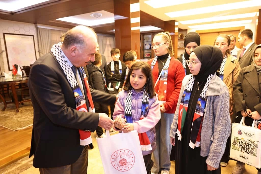 Öğrenciler, Çorum Valisi Ali Çalgan'ı makamında ziyaret ederek, kitabı hediye etti.