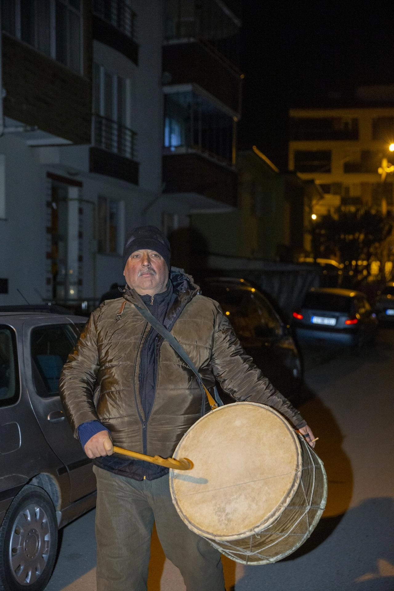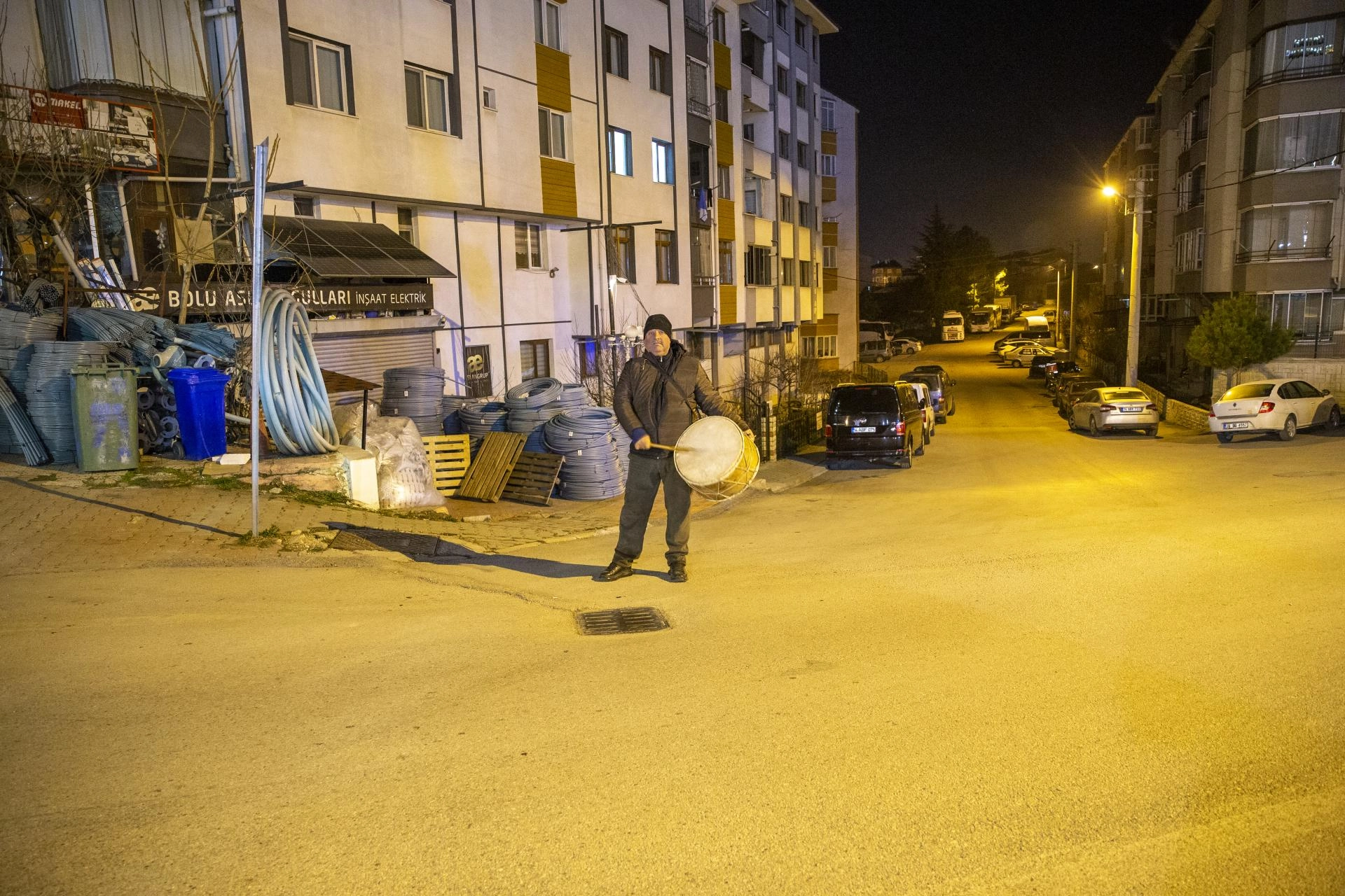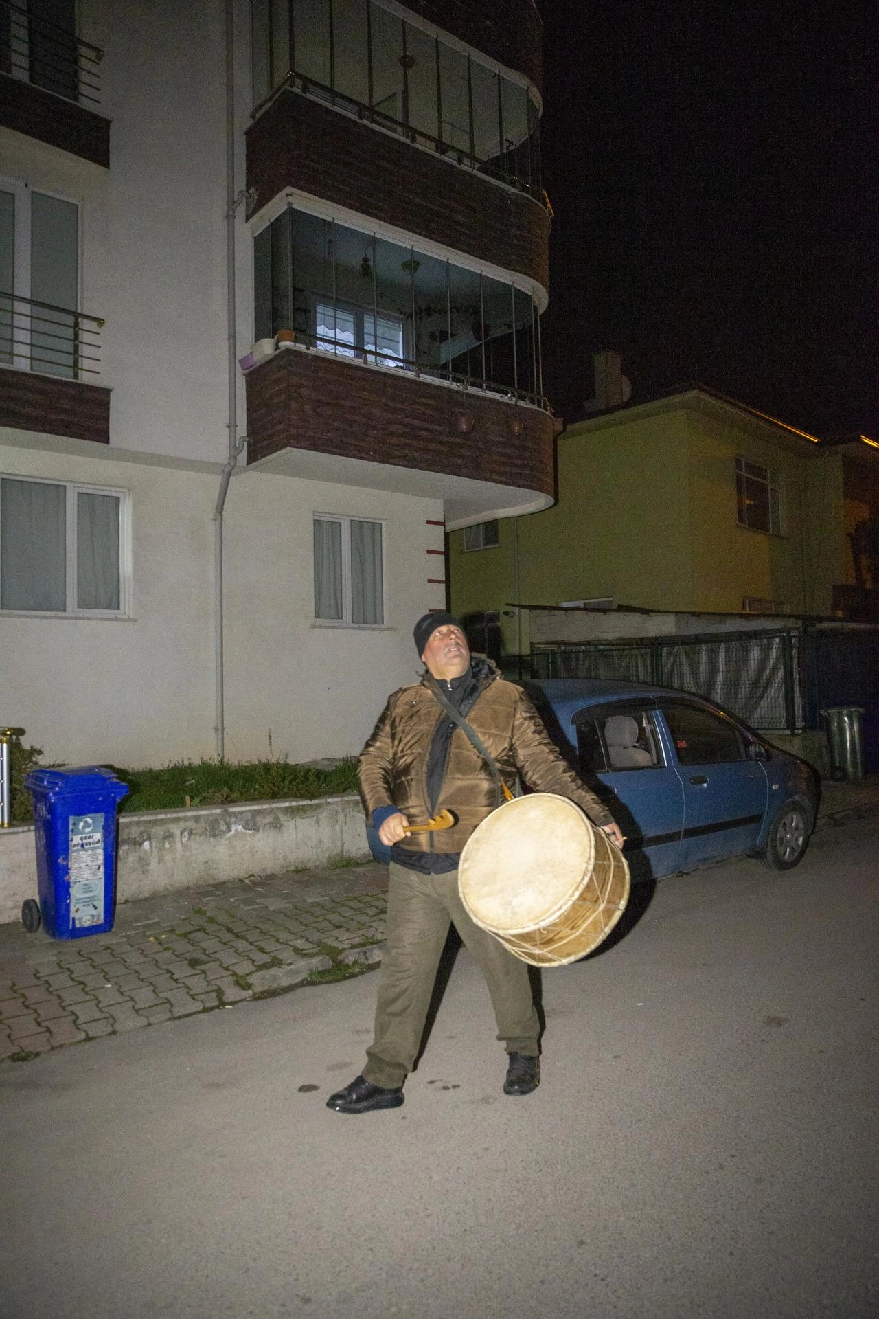 Gece karanlığında sokaklara çıkan baba oğul, oruç ibadetini yerine getirmek isteyenleri davul sesiyle sahura kaldırıyor.