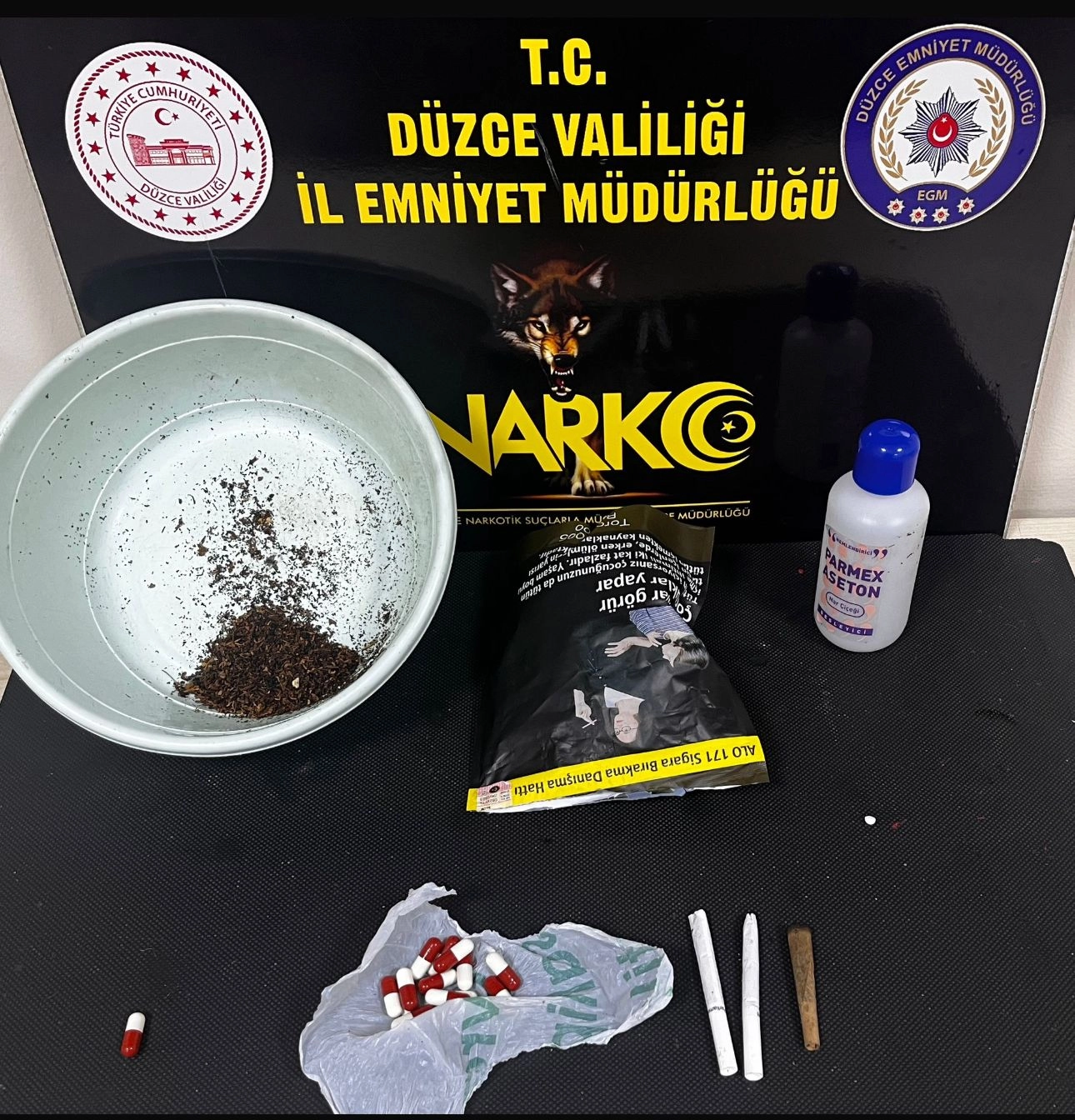 Düzce Üniversitesi Bölgesi Şehit Murat Demir Mahallesi'nde belirlenen adreslere eş zamanlı düzenlenen operasyonda, 292 gram sentetik uyuşturucu ve 15 uyuşturucu hap ele geçirildi.