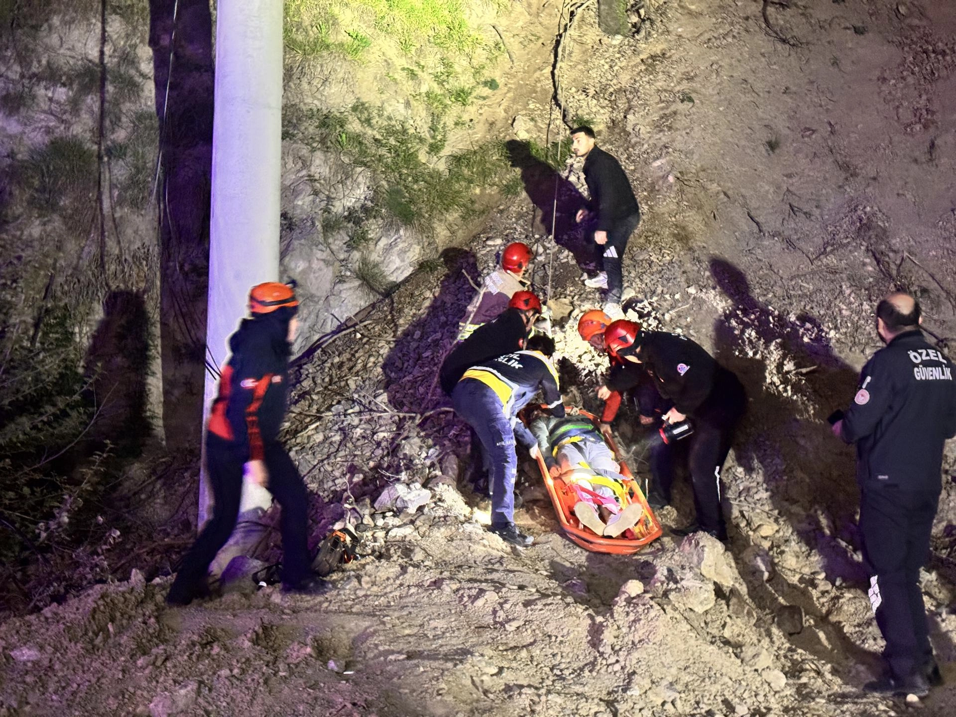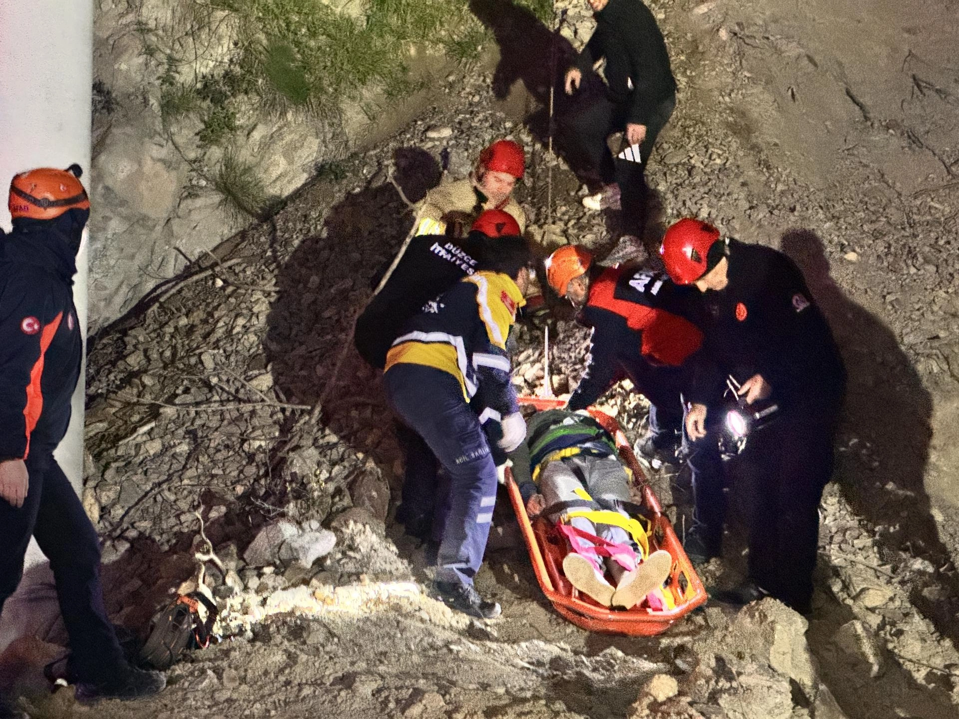 Yamaca çıkan AFAD ve itfaiye ekipleri, halata bağladıkları sedyeyle mahsur kalanları aşağıya indirdi.