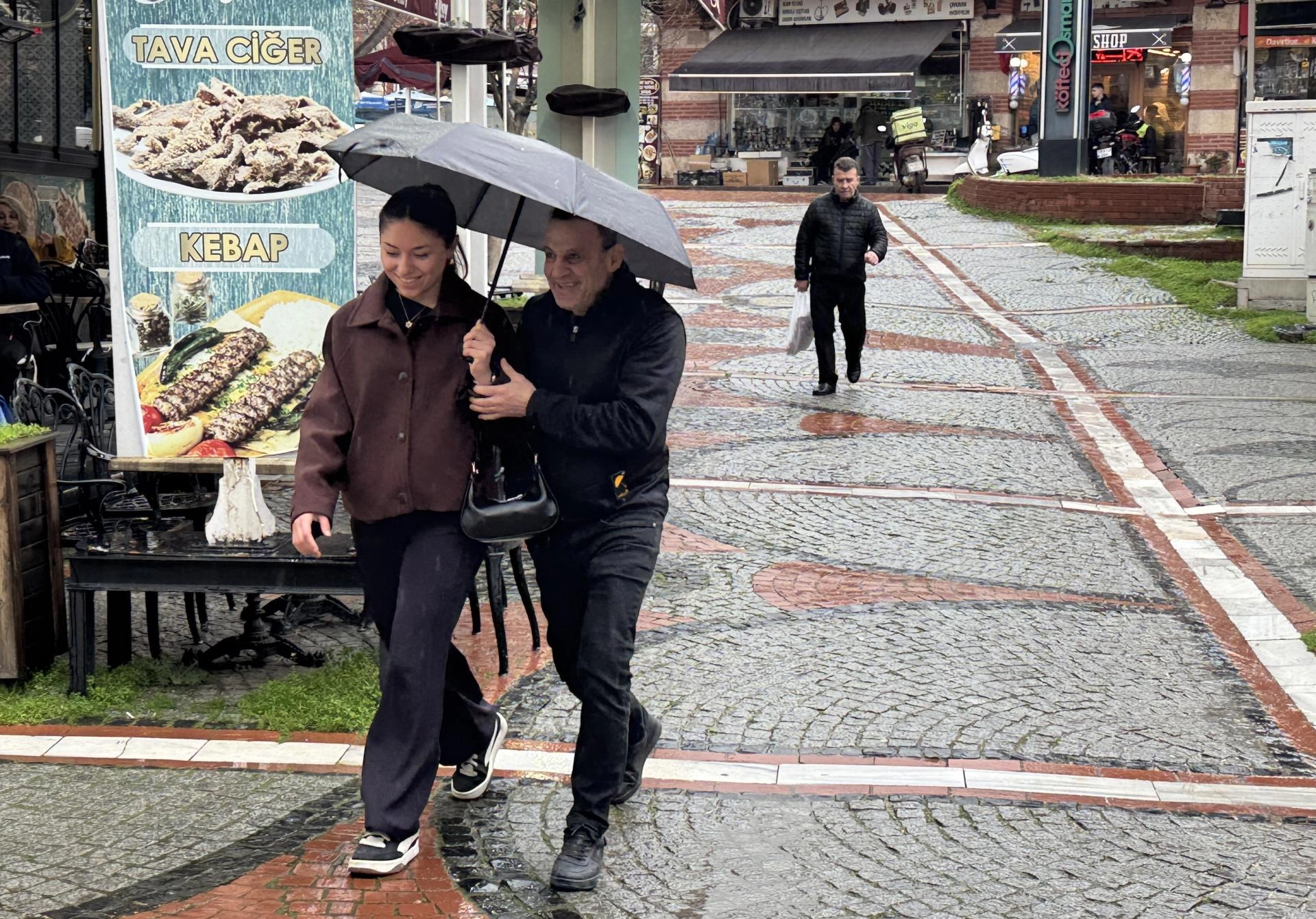 Bazı vatandaşlar şemsiyeleriyle yağmurdan korunmaya çalışırken bazıları da iş yeri tentelerinin altına sığındı.