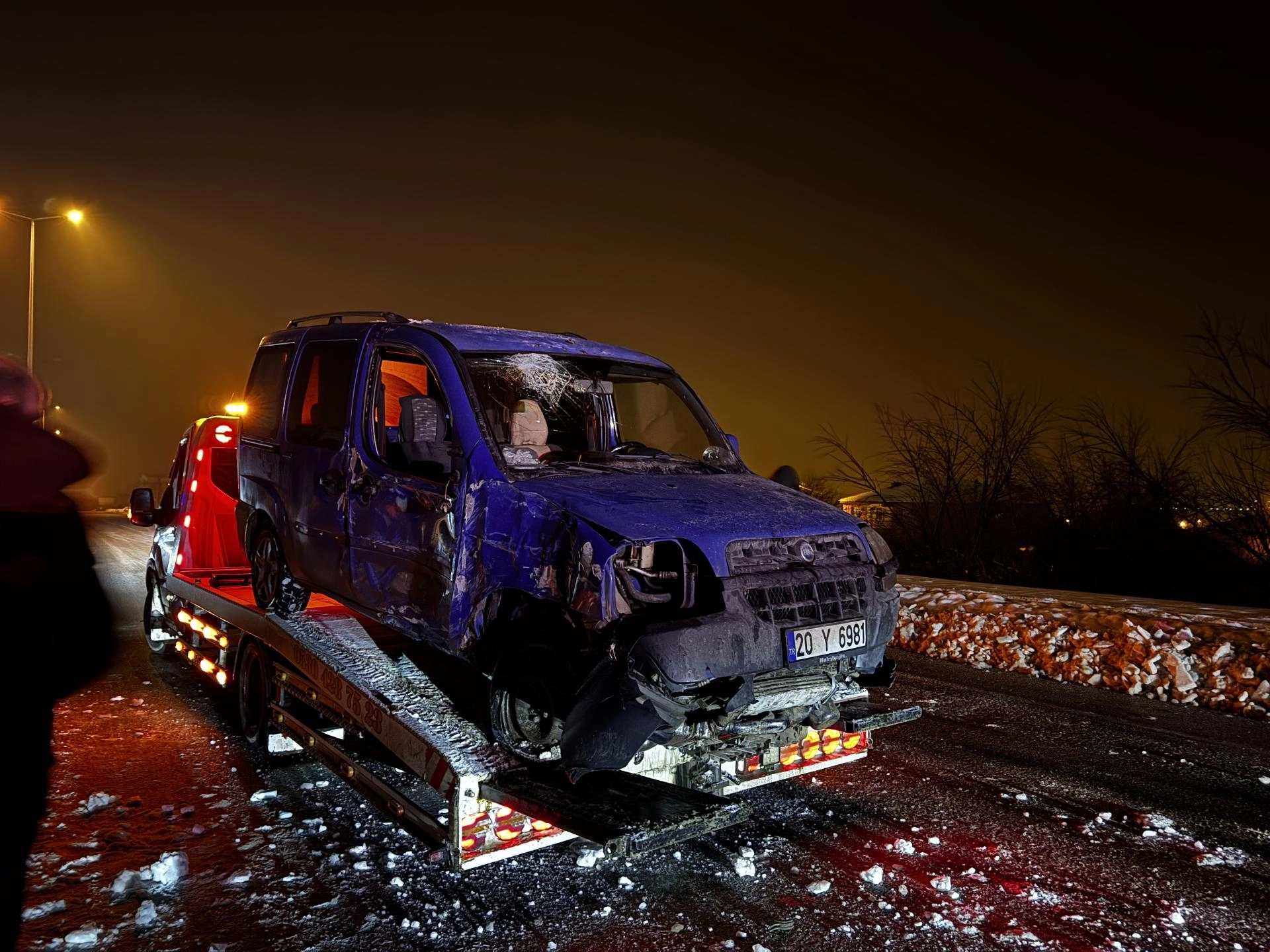 Yurtbaşı beldesi yolunda sürücüsünün kimliği henüz öğrenilemeyen 20 Y 6981 plakalı hafif ticari araç, buzlanmanın etkili olduğu yolda refüjdeki aydınlatma direğine çarptı.