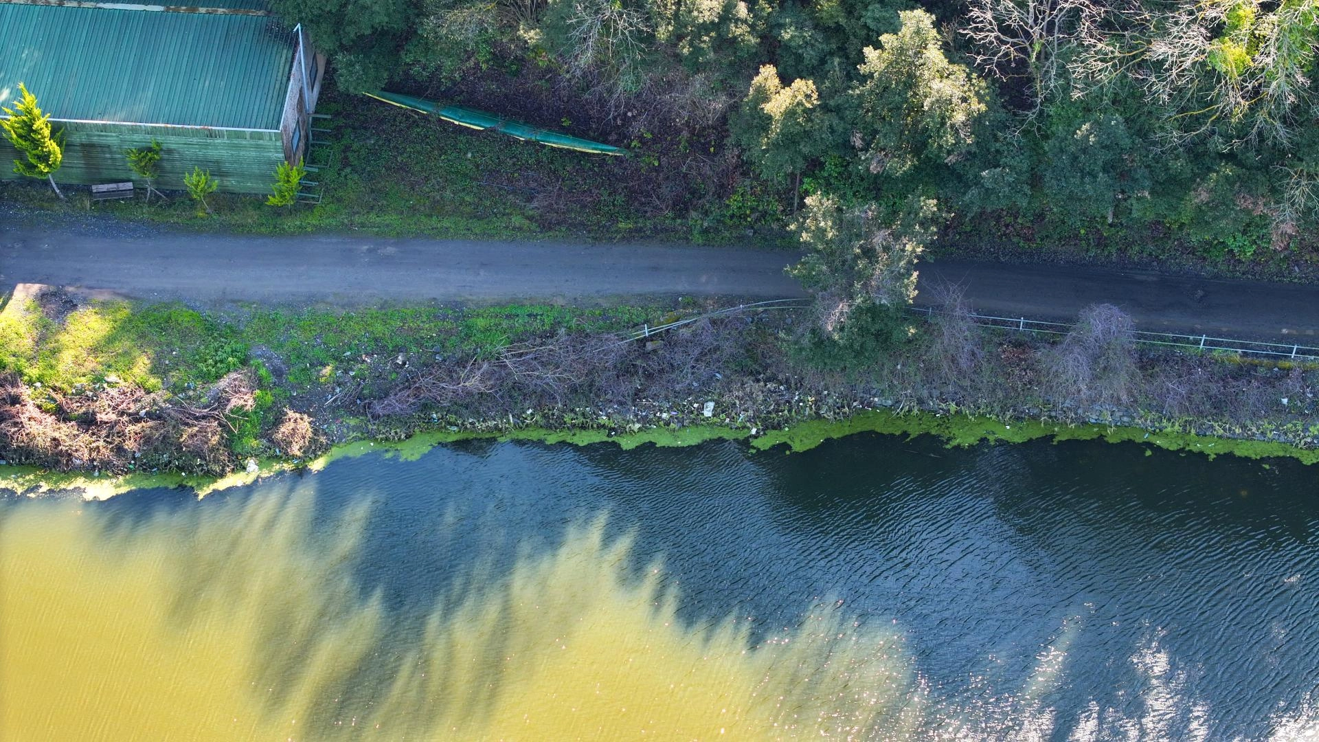Barajın kıyısındaki kirlilik, havadan dronla görüntülendi.