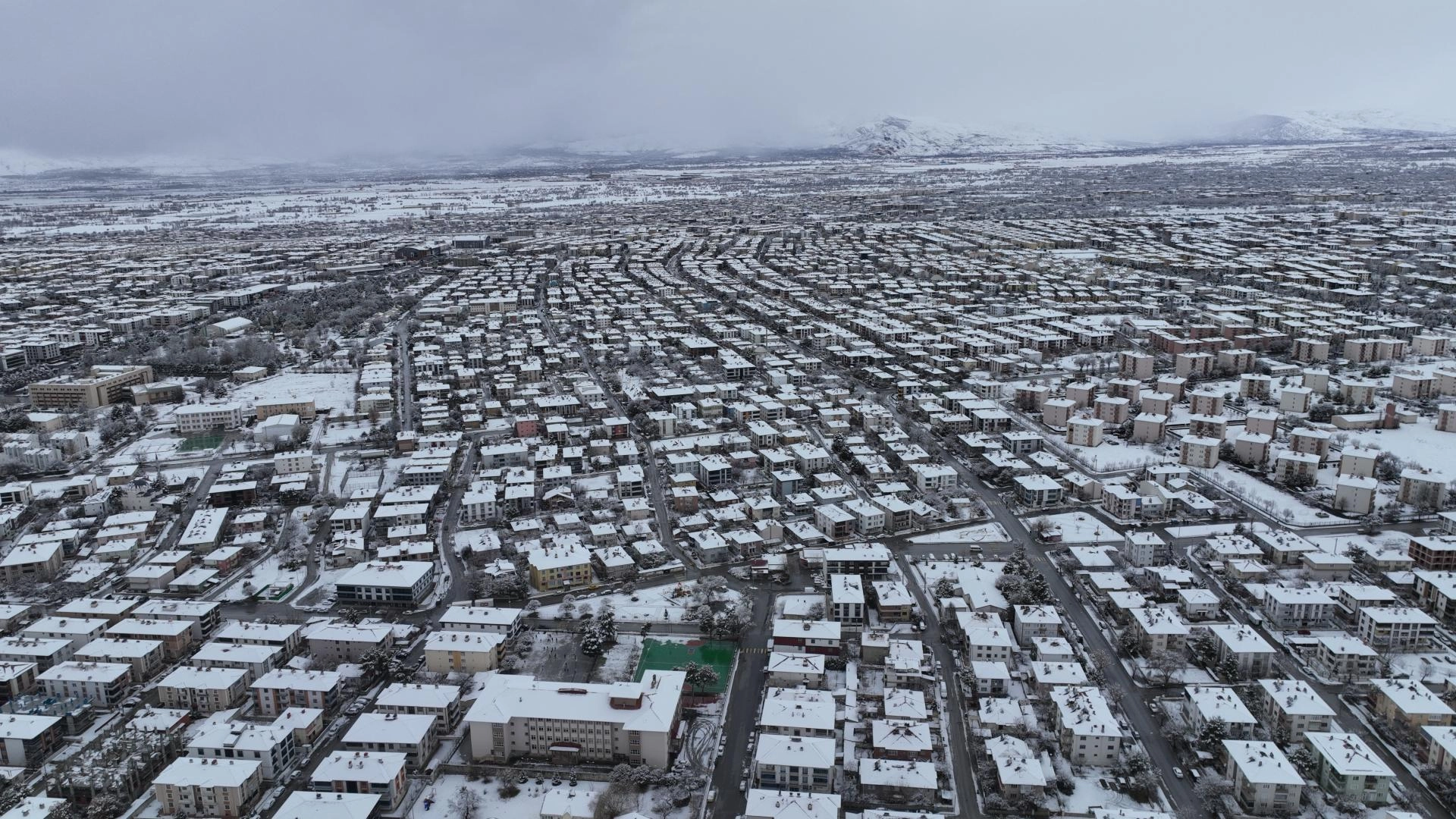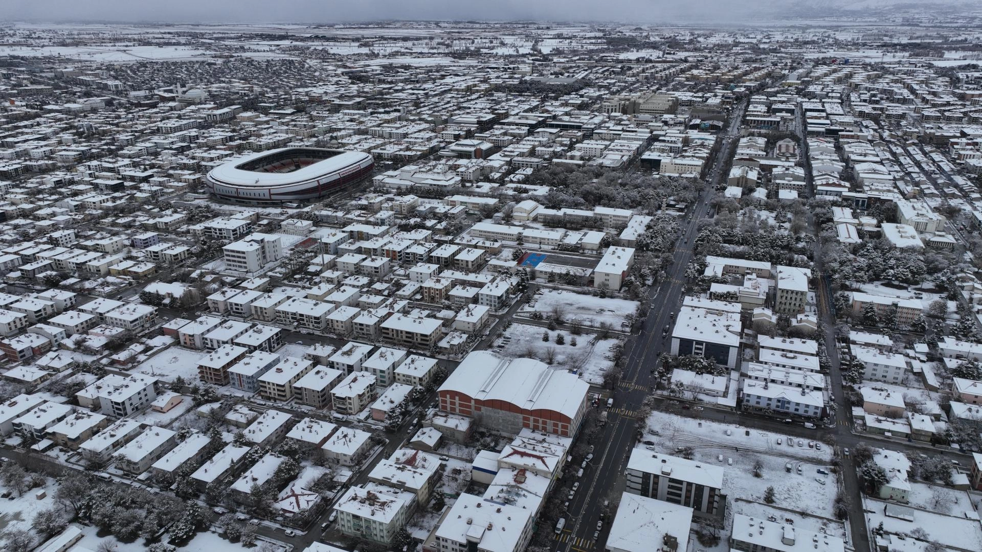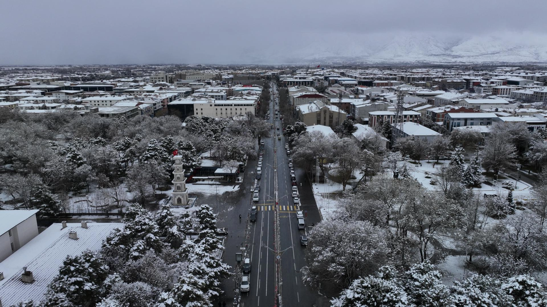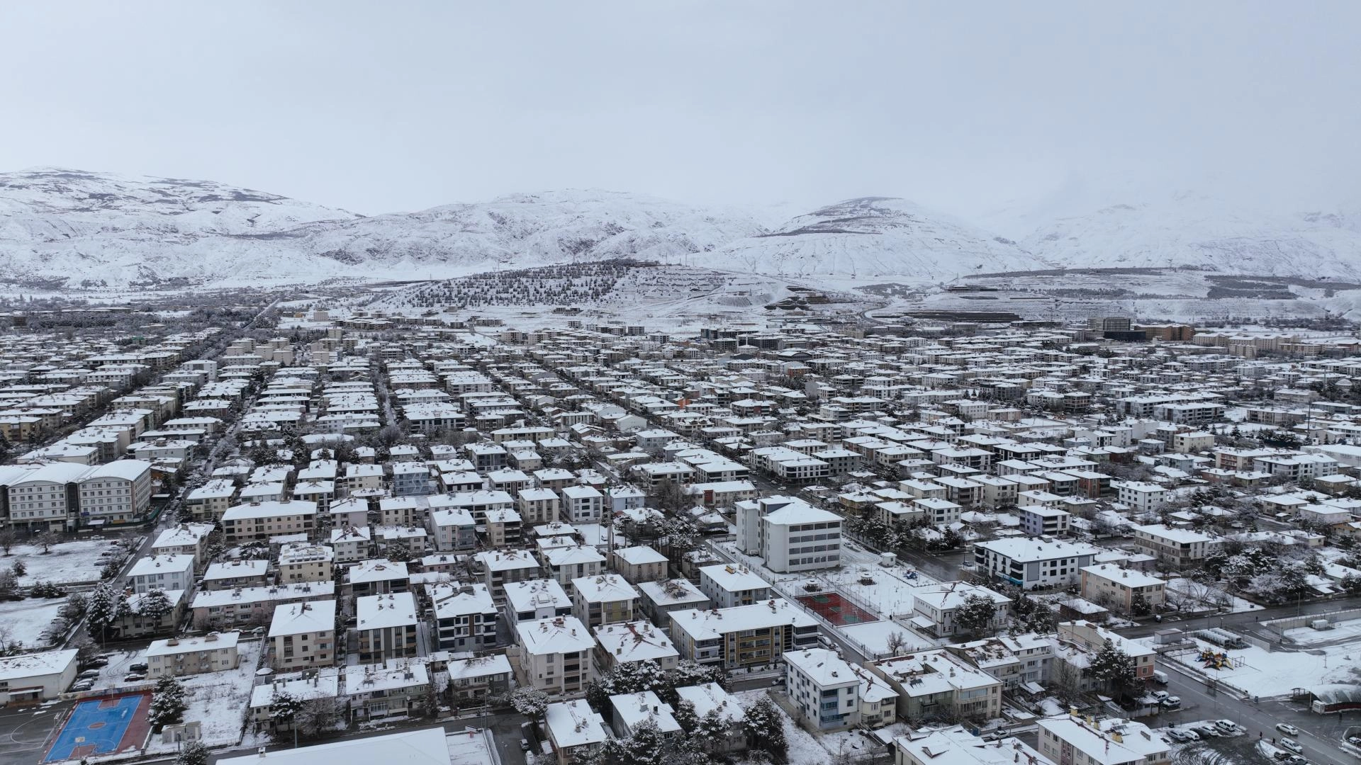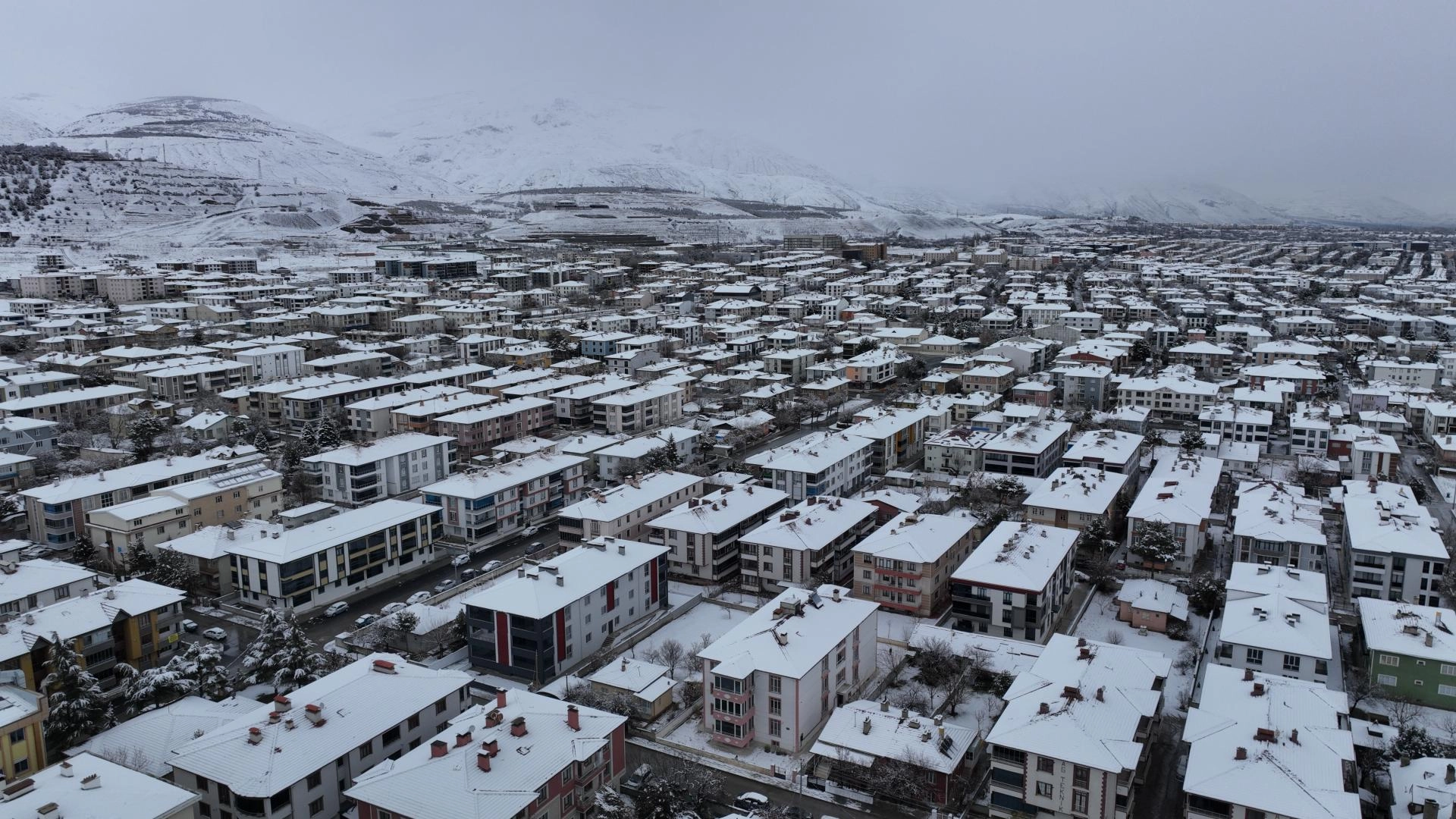 Kar yağışıyla beyaza bürünen kent dronla görüntülendi.