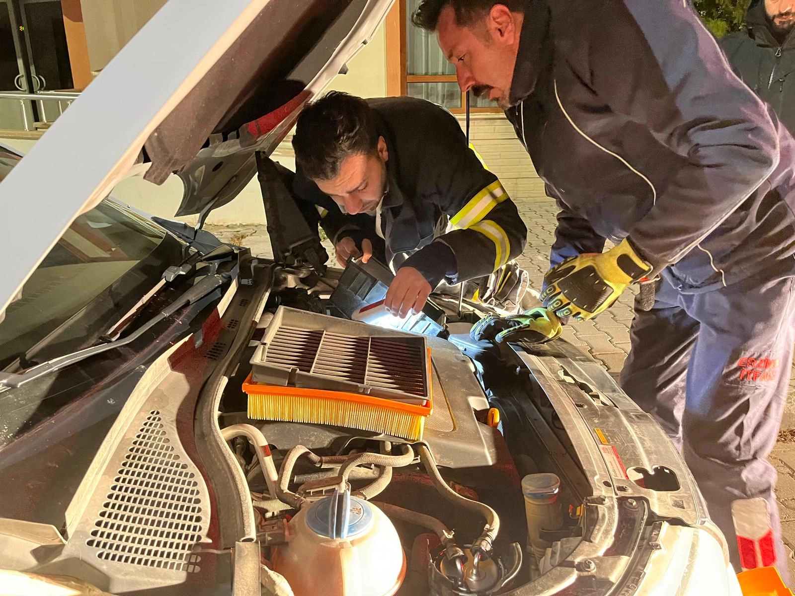 İhbar üzerine olay yerine gelen ekipler, aracın motor kısmında sıkışan kediyi dikkatli bir çalışmayla kurtardı.