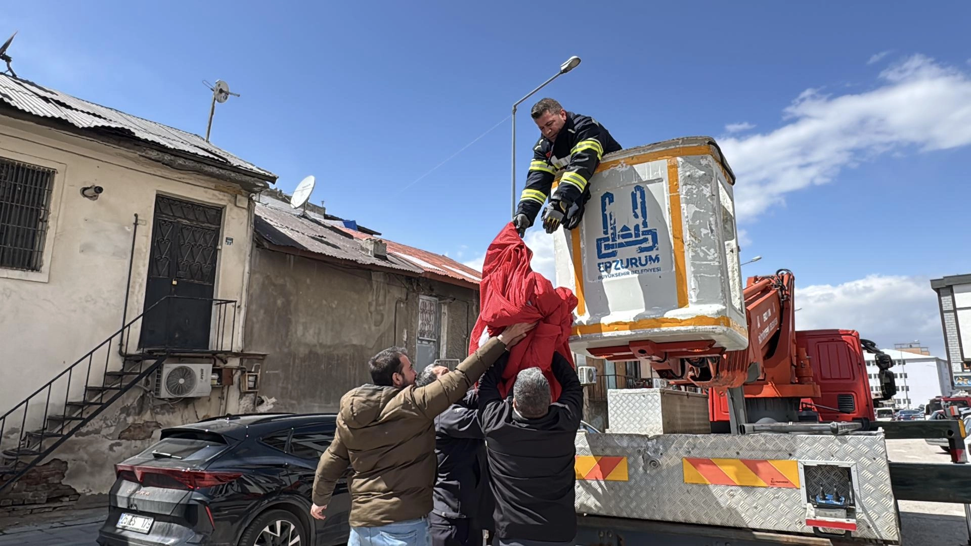 Erzurum'da çatıya savrulan Türk bayrağının yere düşmemesi için seferber oldular