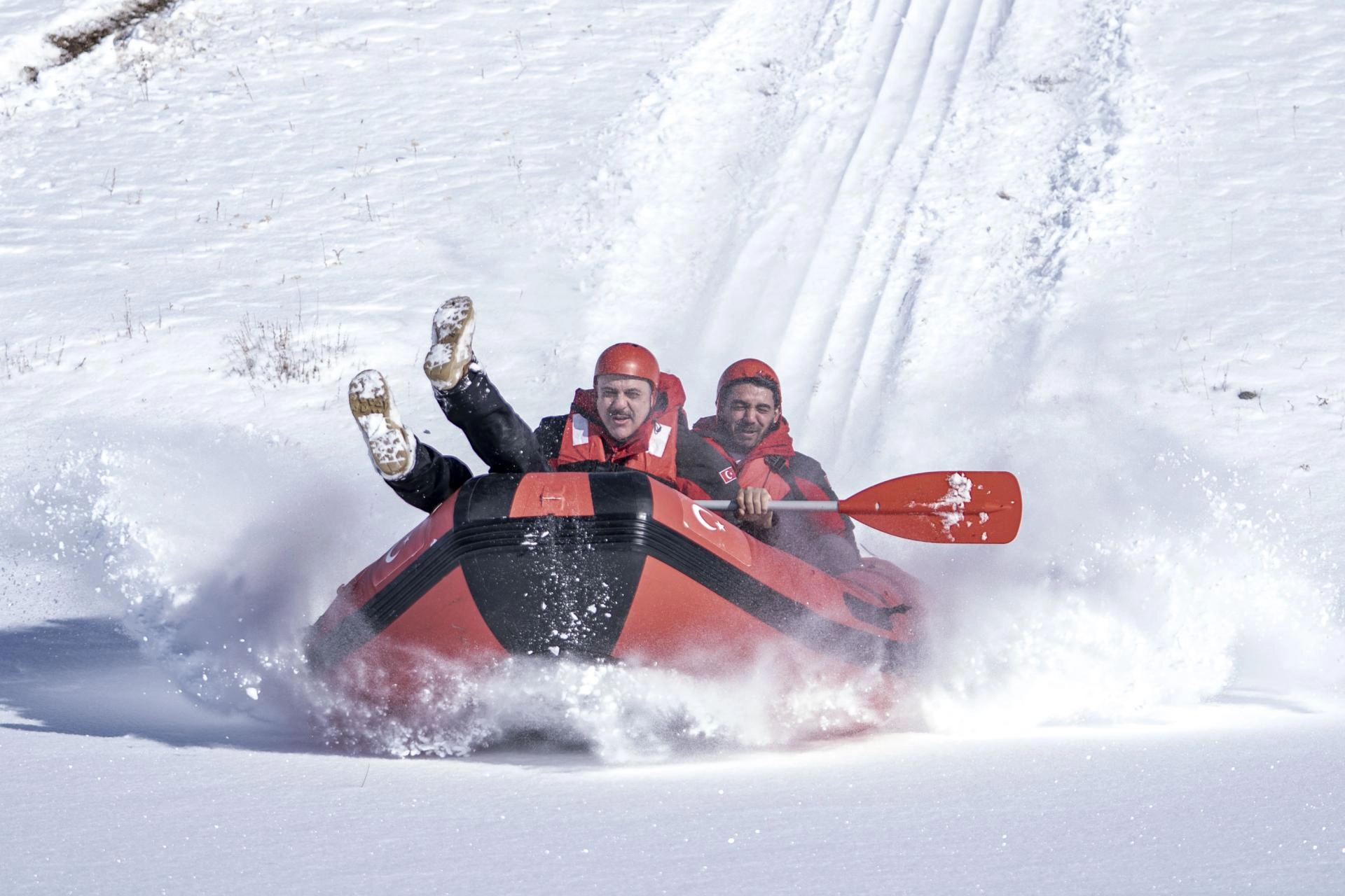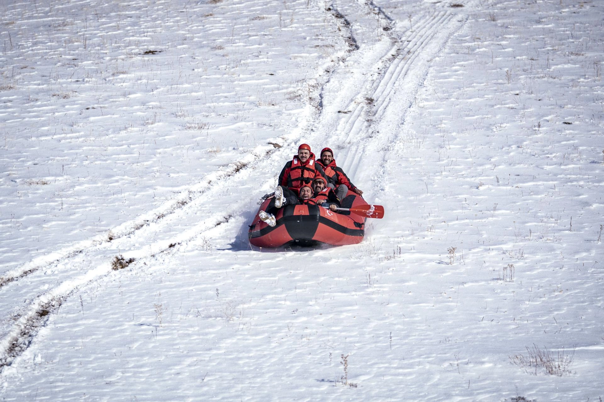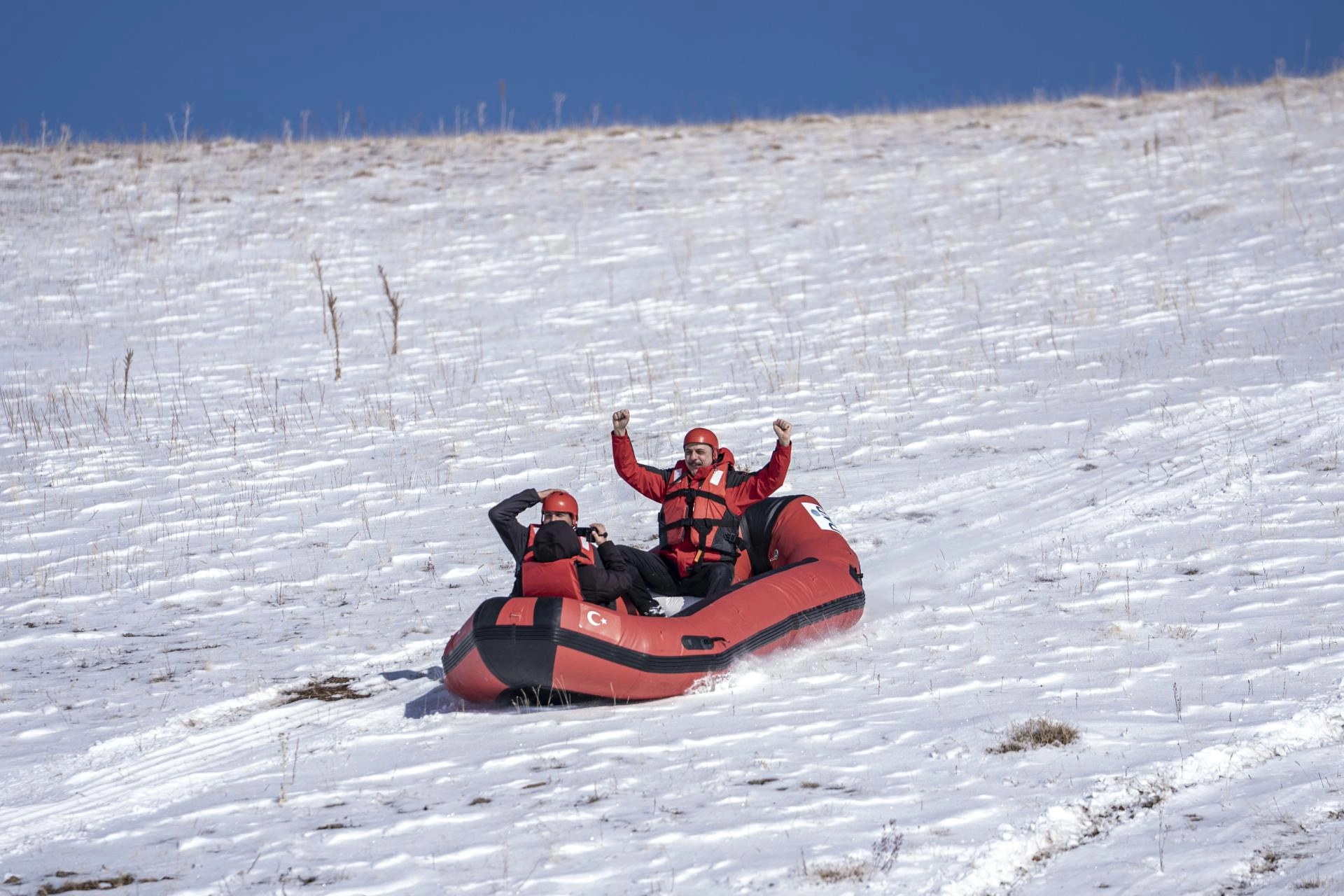 "Burada botlarla tepeye çıkıyoruz. Ardından botla buz tutmuş göl yüzeyine doğru kar raftingi yapıyoruz. Amacımızı Erzurum'da sadece kayak sporunun değil, her türlü kış sporunun yapılabildiğini göstermek. Doğada keyifli güzel bir gün geçirmek istedik. Böylece ilimizin tanıtımına katkıda bulunmak istiyoruz."