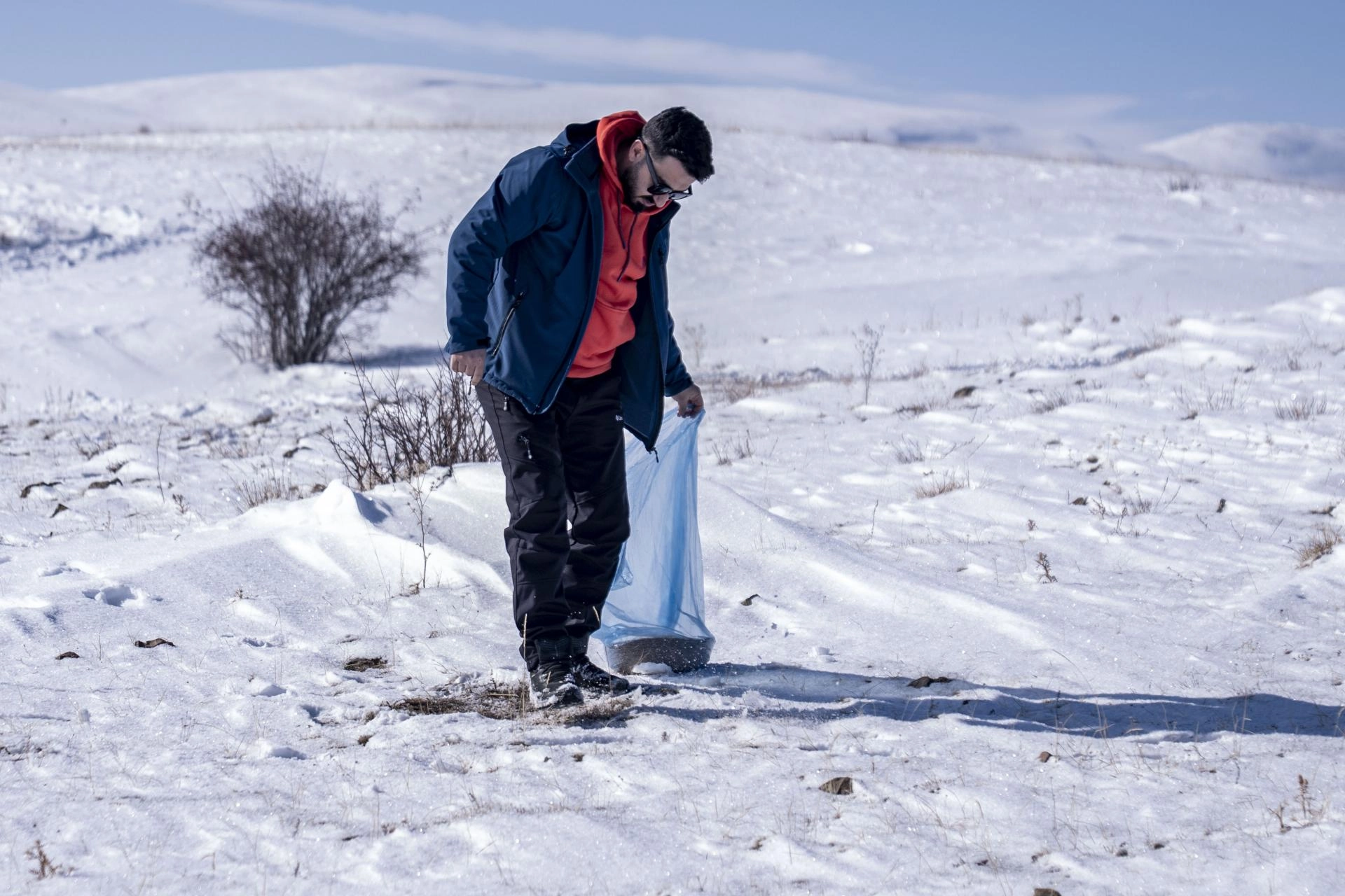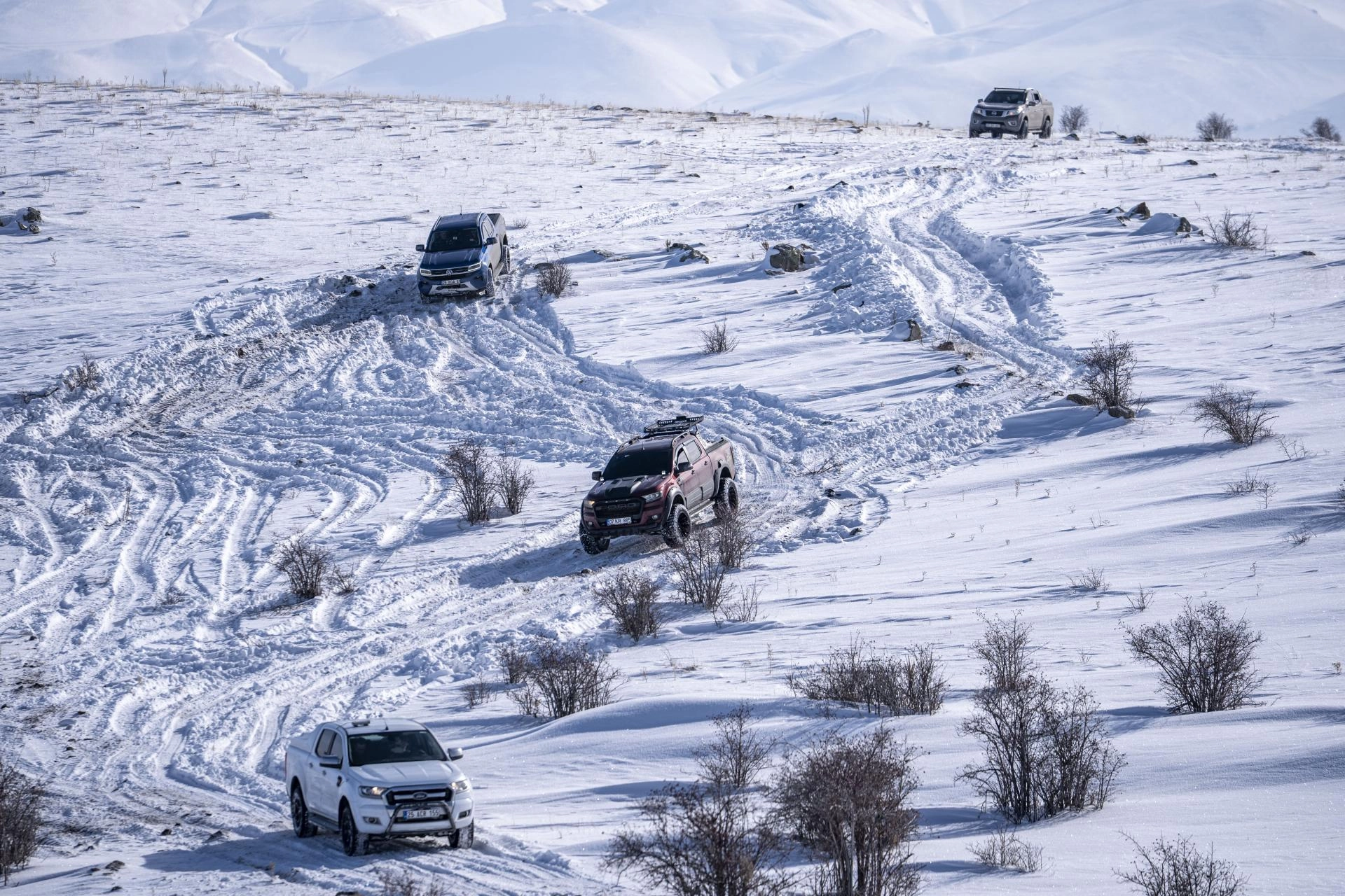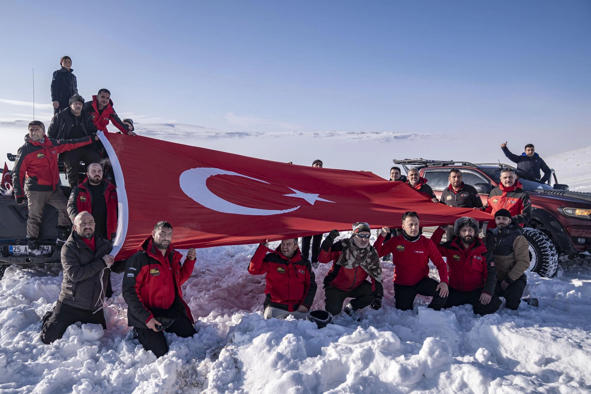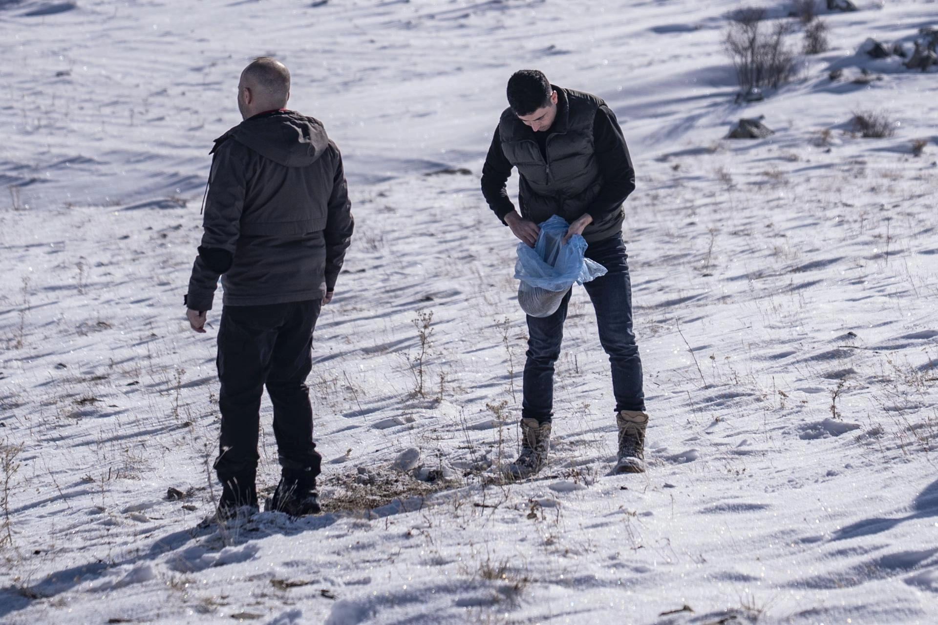 Zaman zaman kara saplanan 4x4 araçlarıyla karlı dağları aşan macera tutkunları ile Vali Çiftçi, doğada zor şartlarda yaşam mücadelesi veren hayvanlar için yanlarında getirdikleri yemleri toprağa bıraktı.