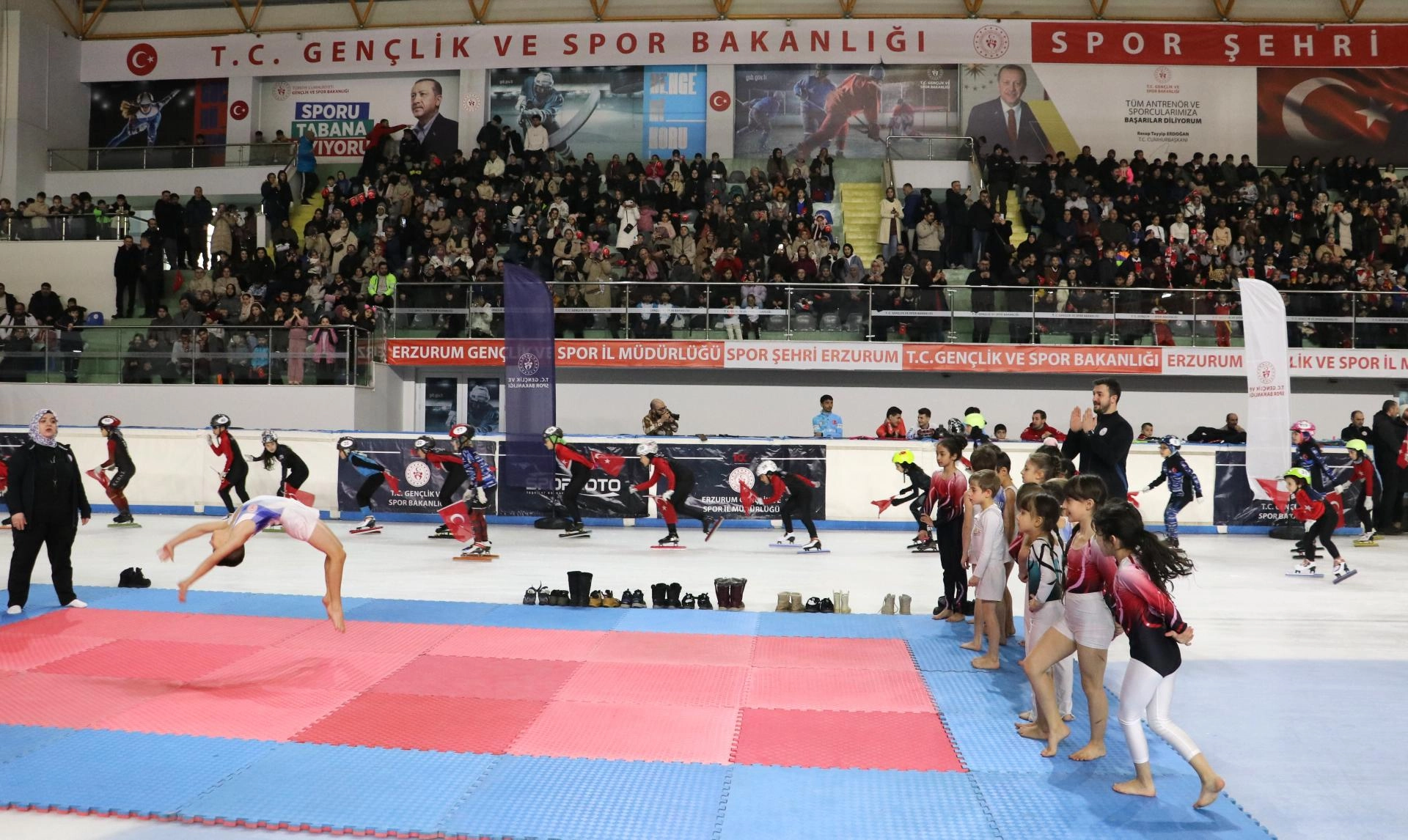 Programda buz üzerine konulan tatamiye çıkan sporcular karate, badminton, jimnastik gibi birçok branşta gösteri yaptı.