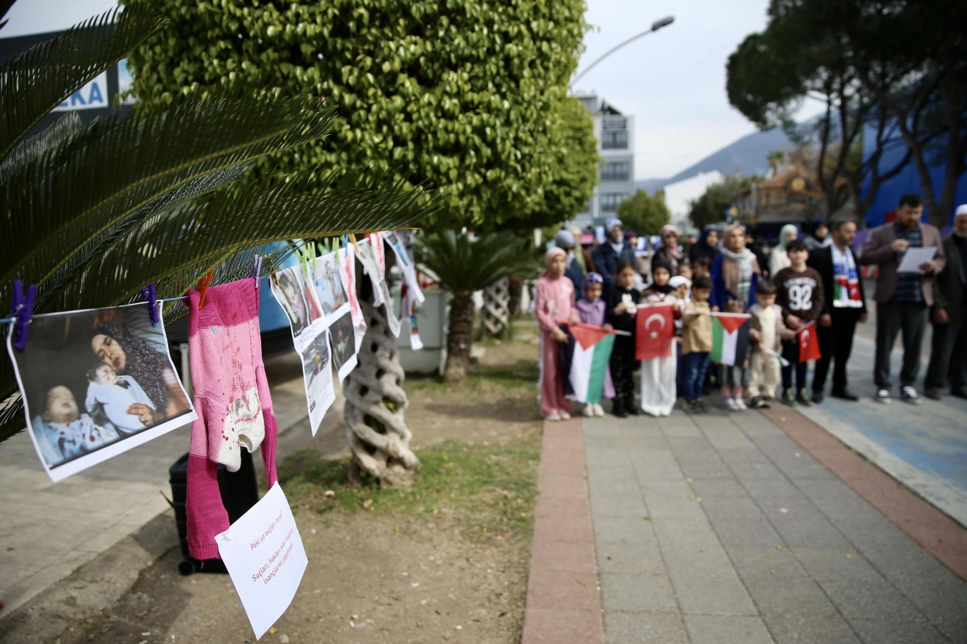 Meydana, Filistin ve İran'da ölen çocukların giydiği elbiseleri temsilen kanlı elbiseler ile kefen bırakıldı.
