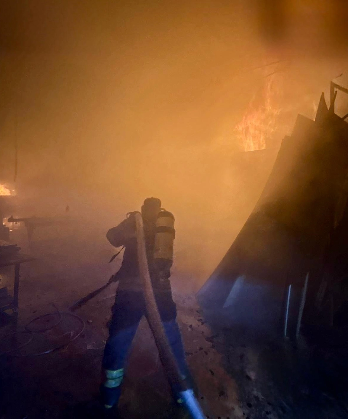 Yangın nedeniyle marangoz atölyesi ile depo büyük çapta hasar gördü.