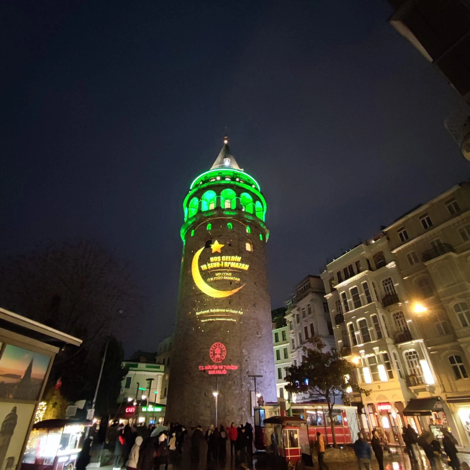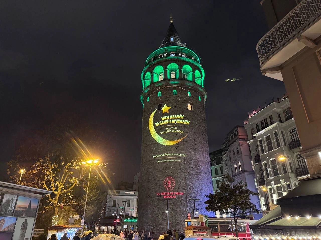 Görselle birlikte kuleye yansıtılan "Hoş Geldin Ya Şehr-i Ramazan" ve "Merhamet, Bağışlanma ve Huzur Ayı" yazıları ile İngilizce tercümeleri ilk gününde ilgi gördü.