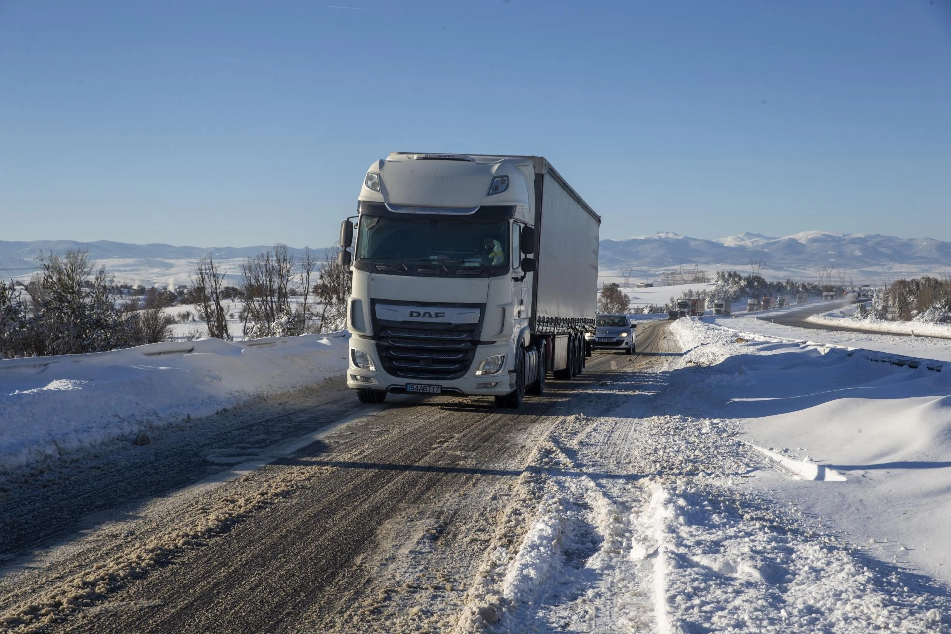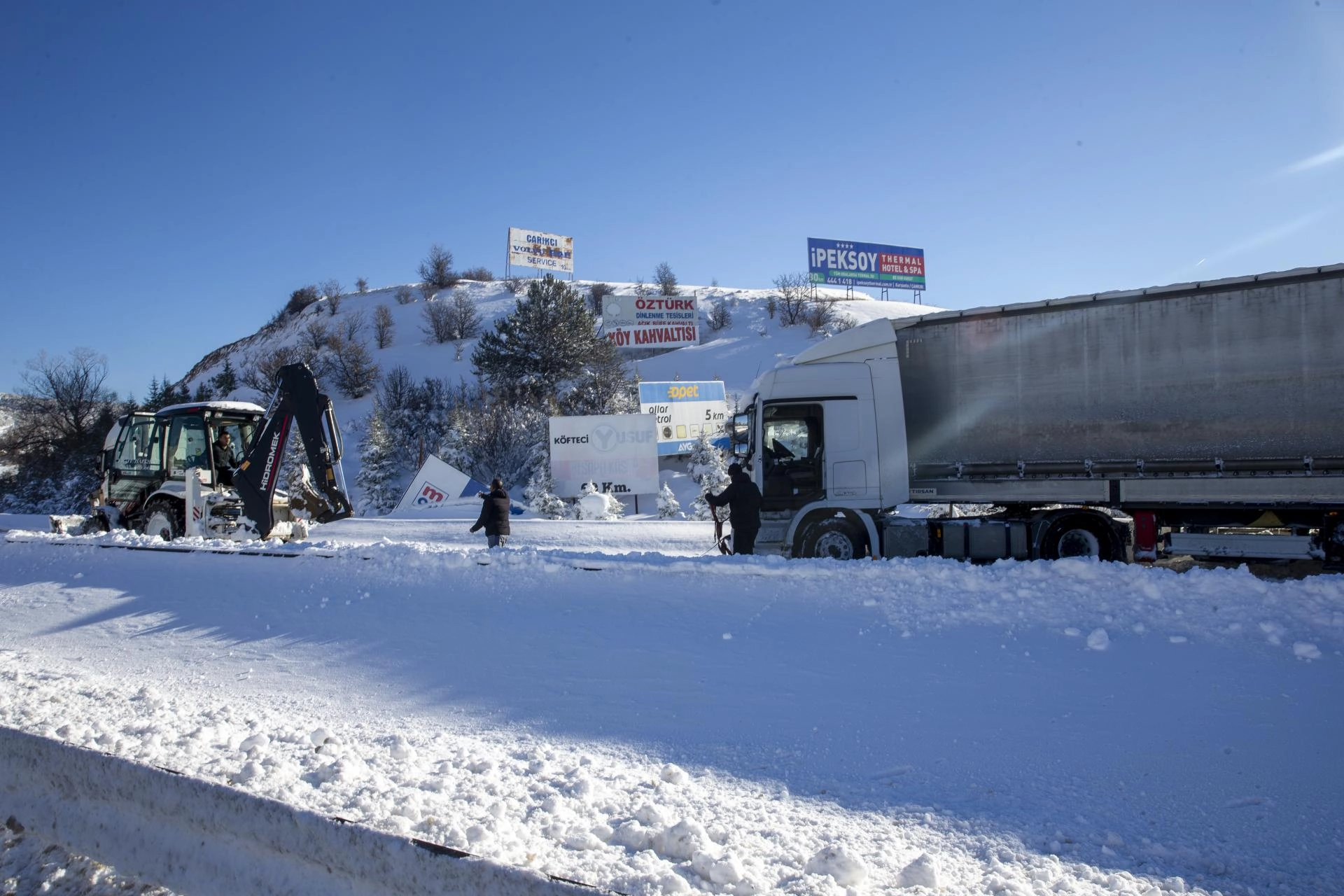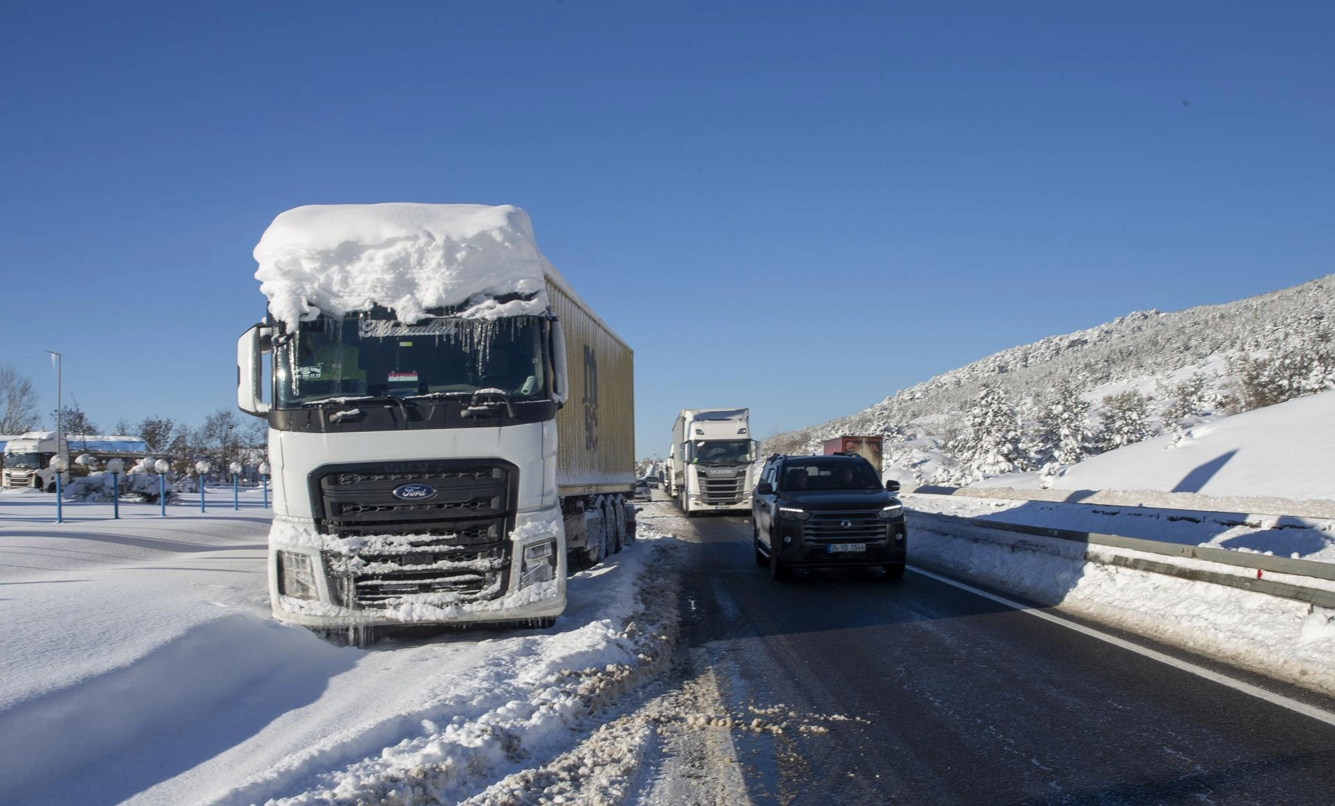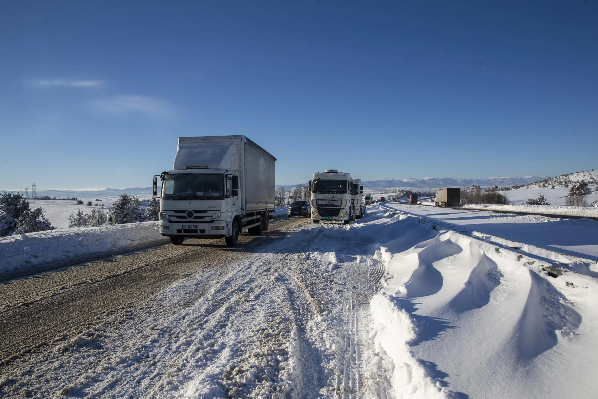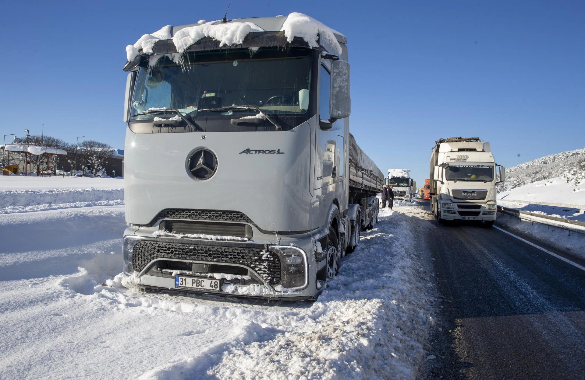 Gece boyunca yol kenarında bekleyen tır ve kamyonlardan bazıları yeniden yola çıkmayı başaramayınca sürücüler, çekici, kepçe ve diğer tırlardan yardım istedi.