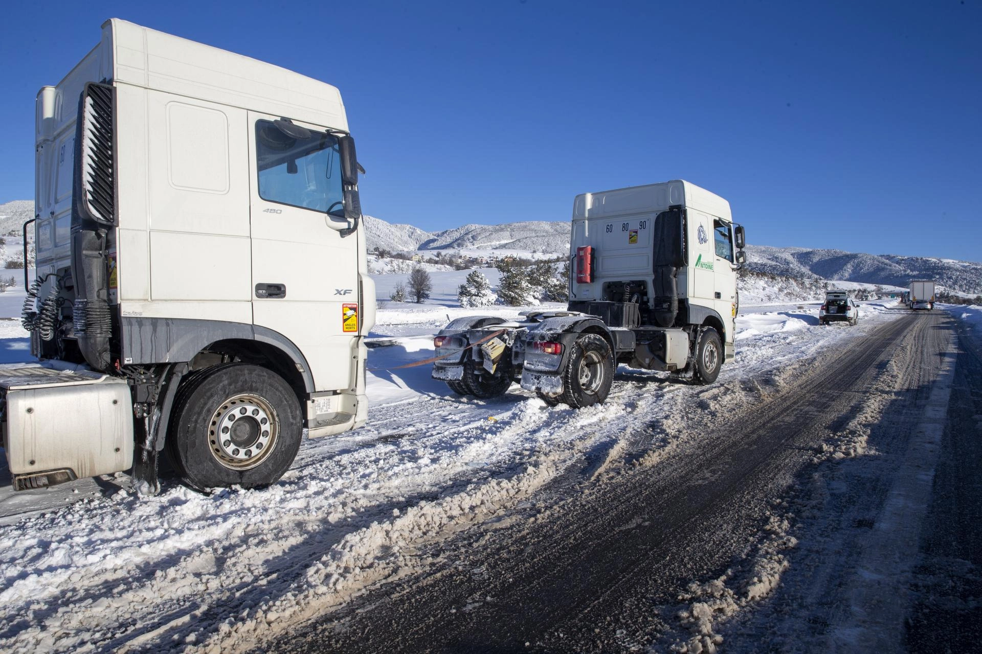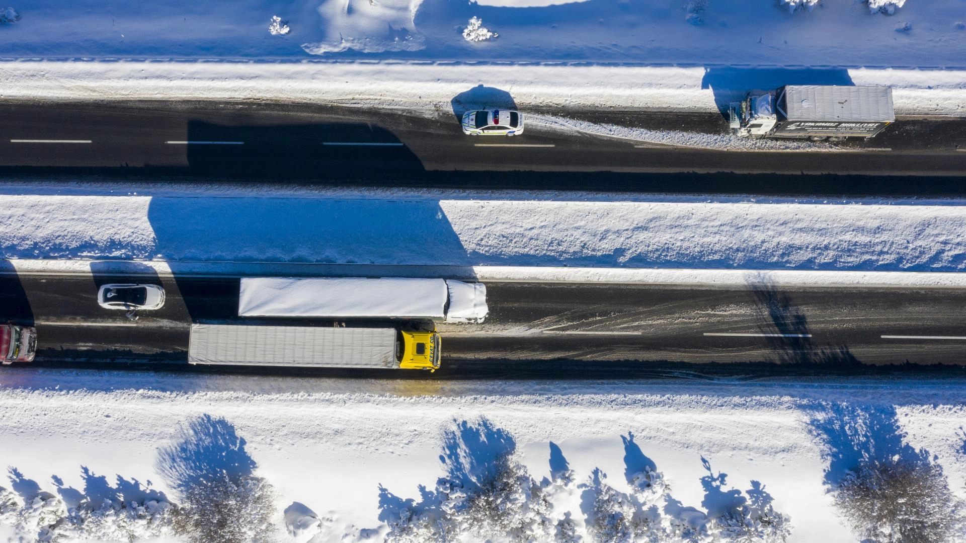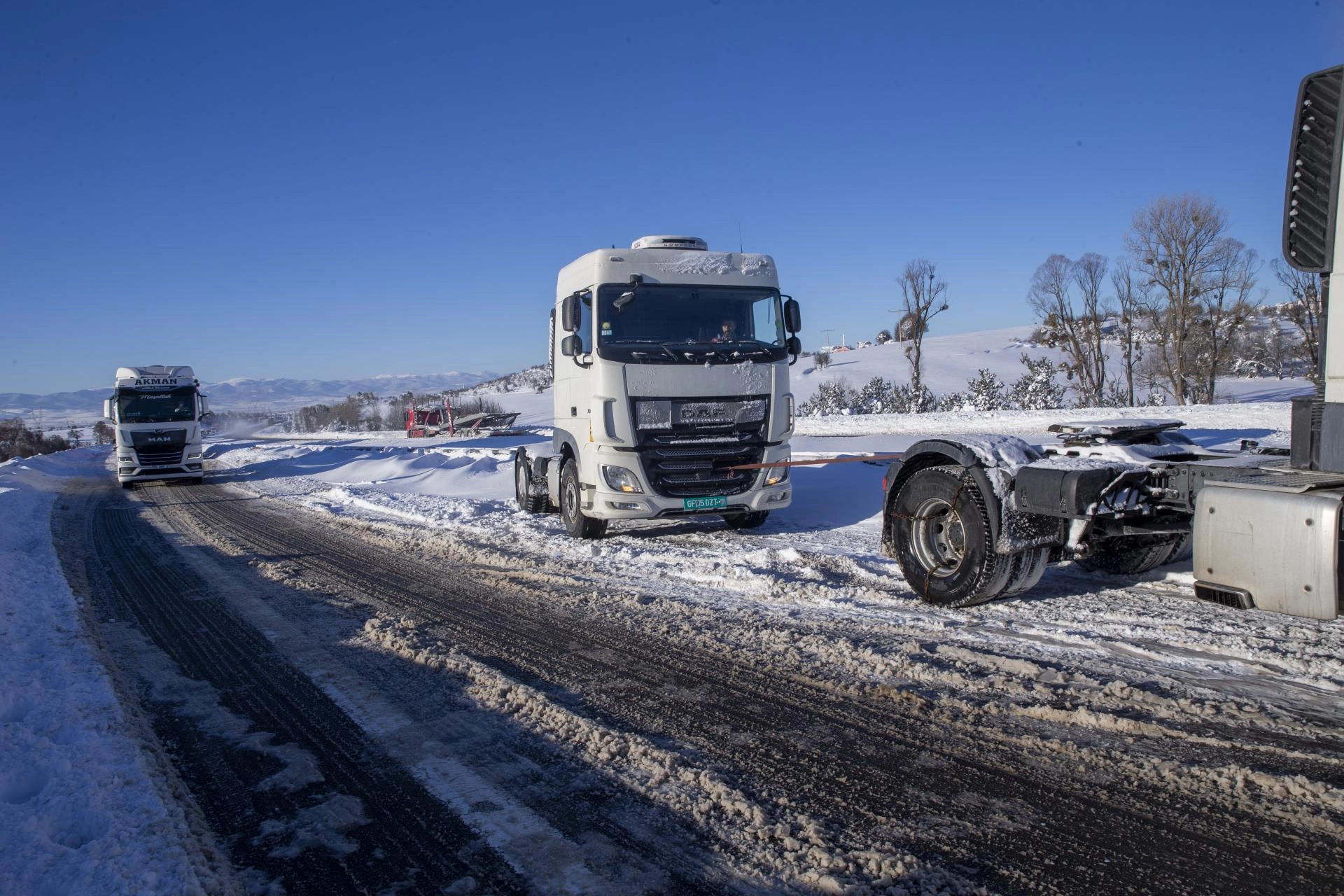 Tır ve kamyonlar diğer araçlarla ve kepçelerle çekilmeye çalışıldı. Araçların yeniden yola çıkabilmesi için yapılan çalışma esnasında trafik zaman zaman durdu.