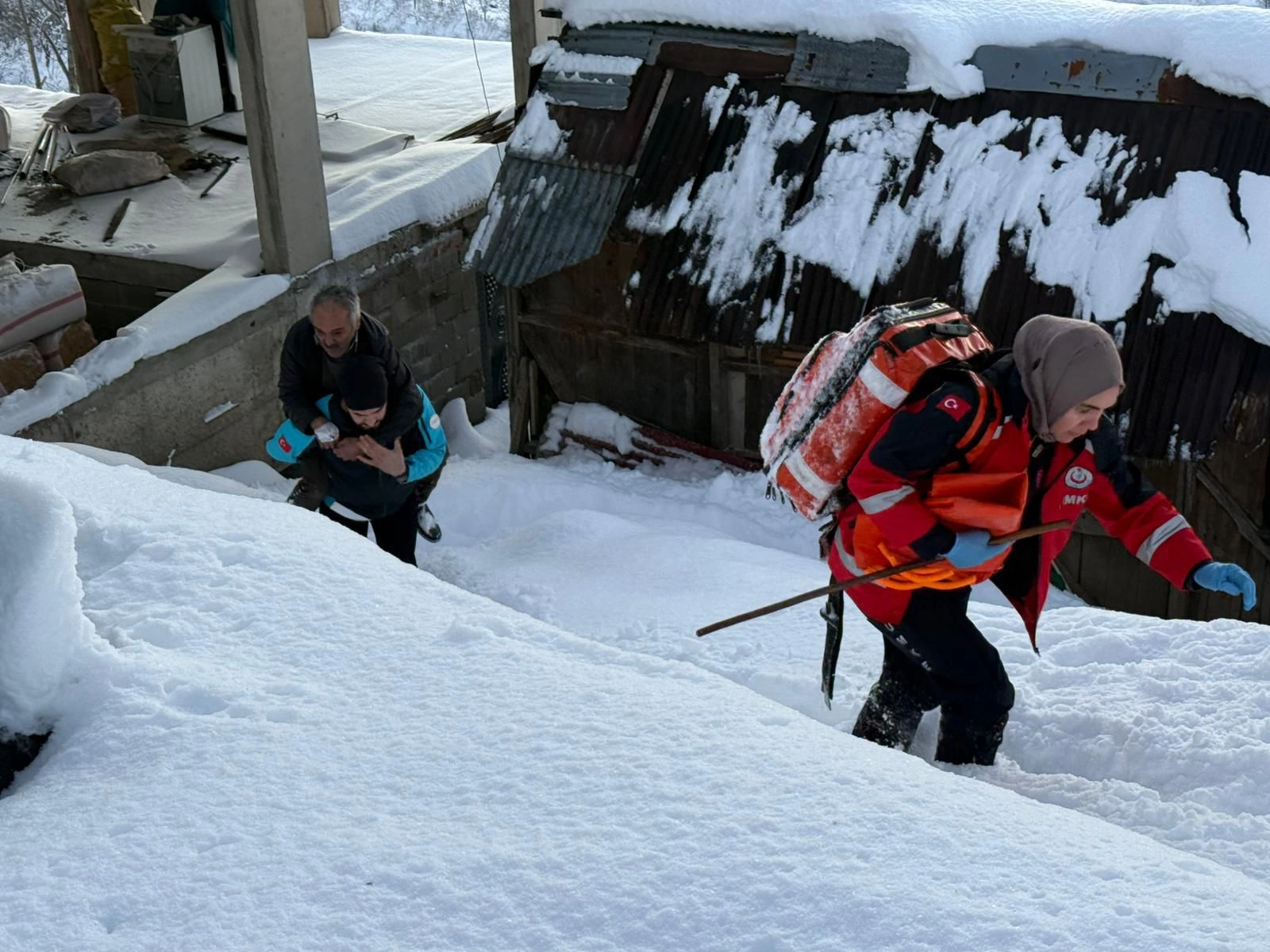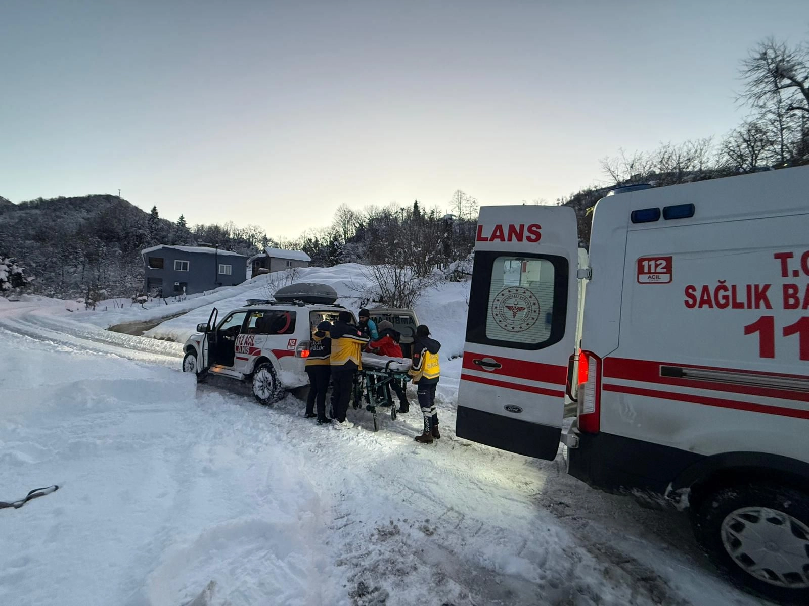Kar yağışının ardından yolun ulaşıma kapalı olması nedeniyle bölgeye arazi tipi ambulans ve UMKE ekipleri yönlendirildi.
