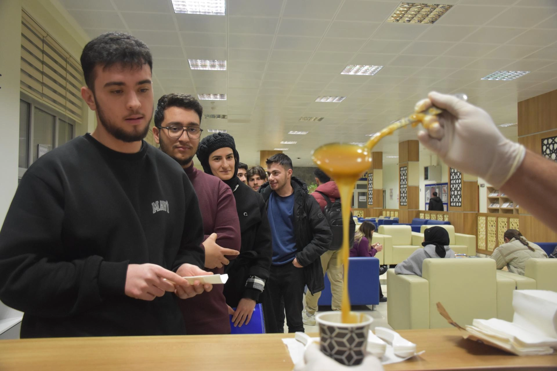 Ömer Hamza Ayhan da kütüphanede ders çalıştıklarını belirterek, "Rektör hocamız da bize herle ikram etti. Bu soğukta içimizi ısıttı." diye konuştu.
