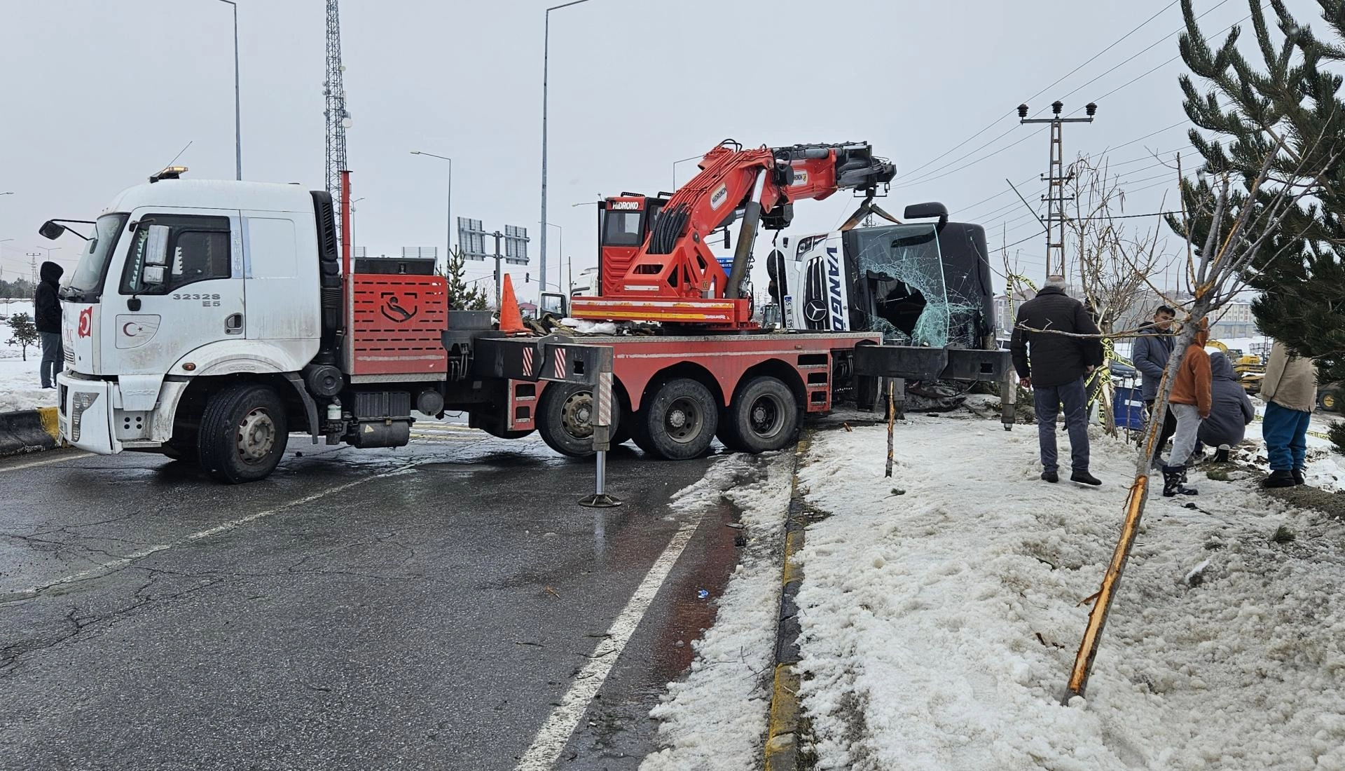 Otobüs, vinç ve iş makineleriyle yapılan yaklaşık 3 saatlik çalışmanın ardından alandan kaldırıldı.