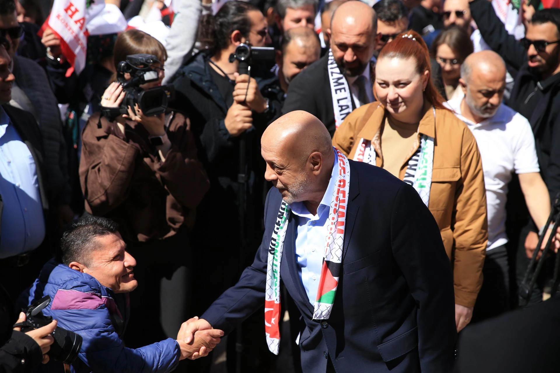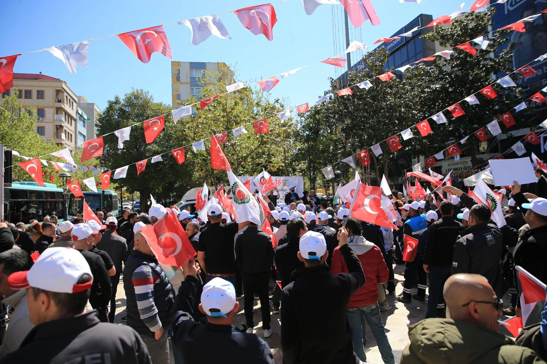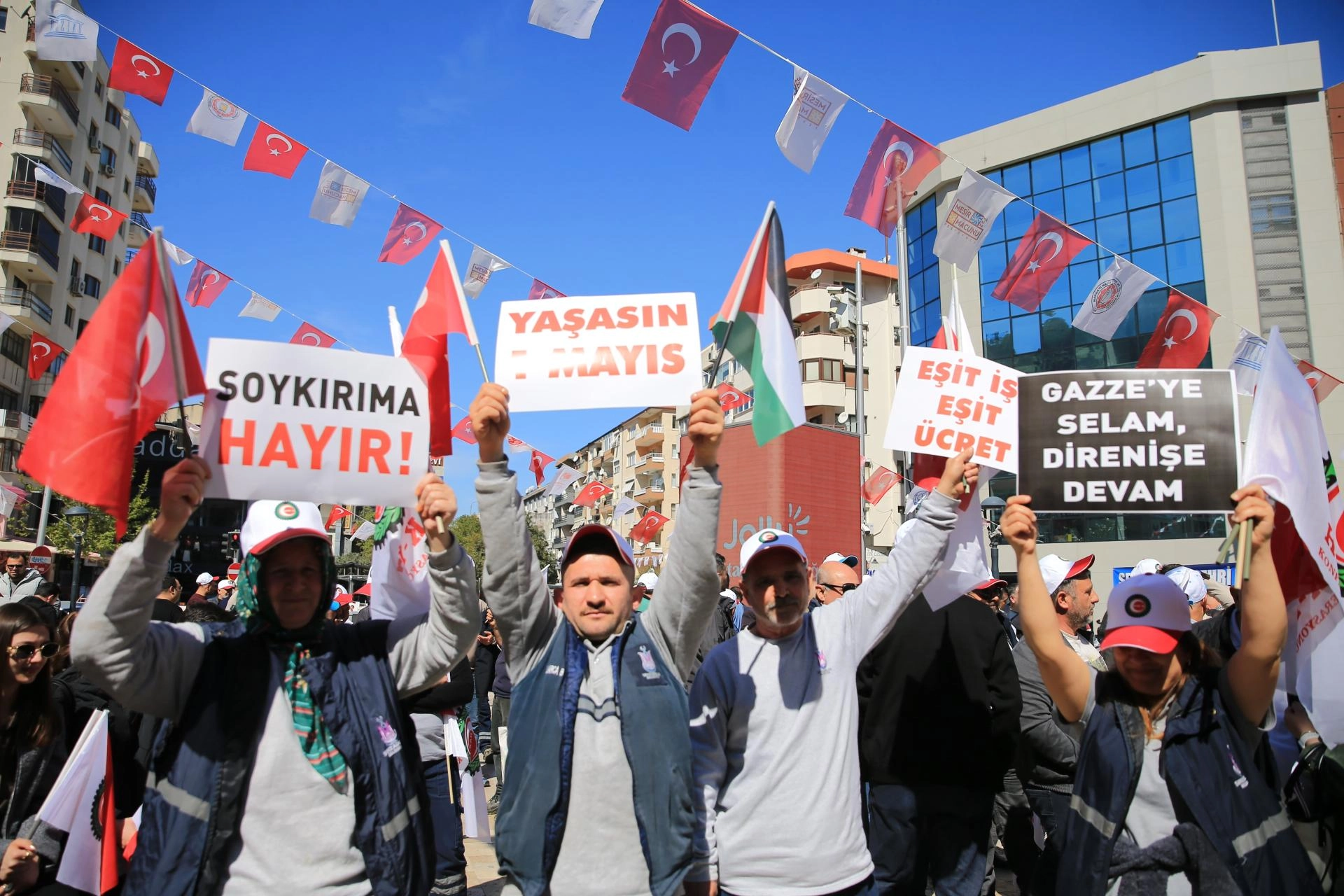 Program öncesi meydanda toplanan sendika üyeleri ellerinde Türk ve Filistin bayraklarıyla "Gazze'ye selam direnişe devam", "Yaşasın 1 Mayıs", "Eşit iş eşit ücret" yazılı dövizler taşıdı.