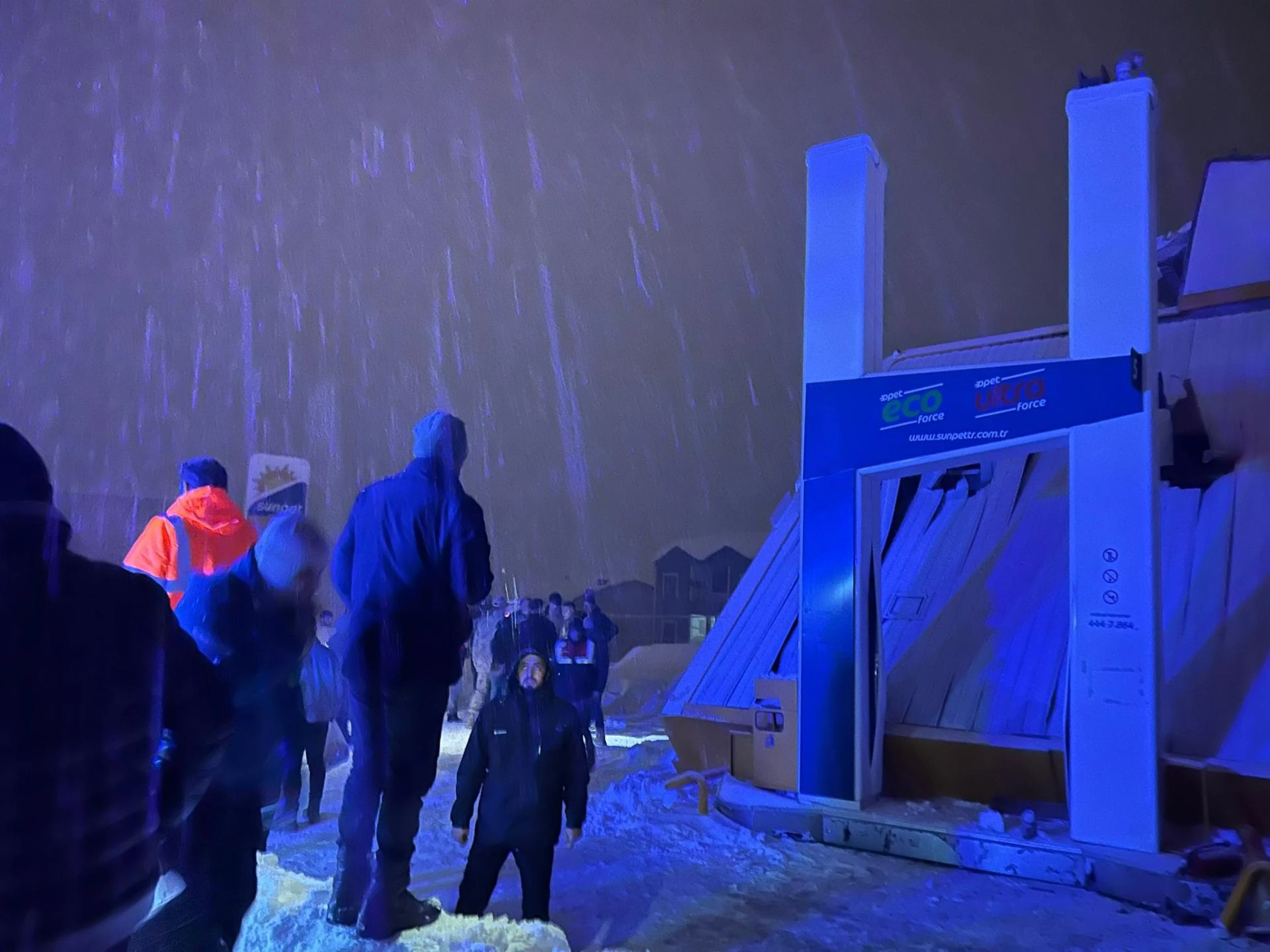İlçenin Merkez Mahallesi'ndeki bir akaryakıt istasyonunda pompaların bulunduğu bölümün çatısı, yoğun kar nedeniyle çöktü.