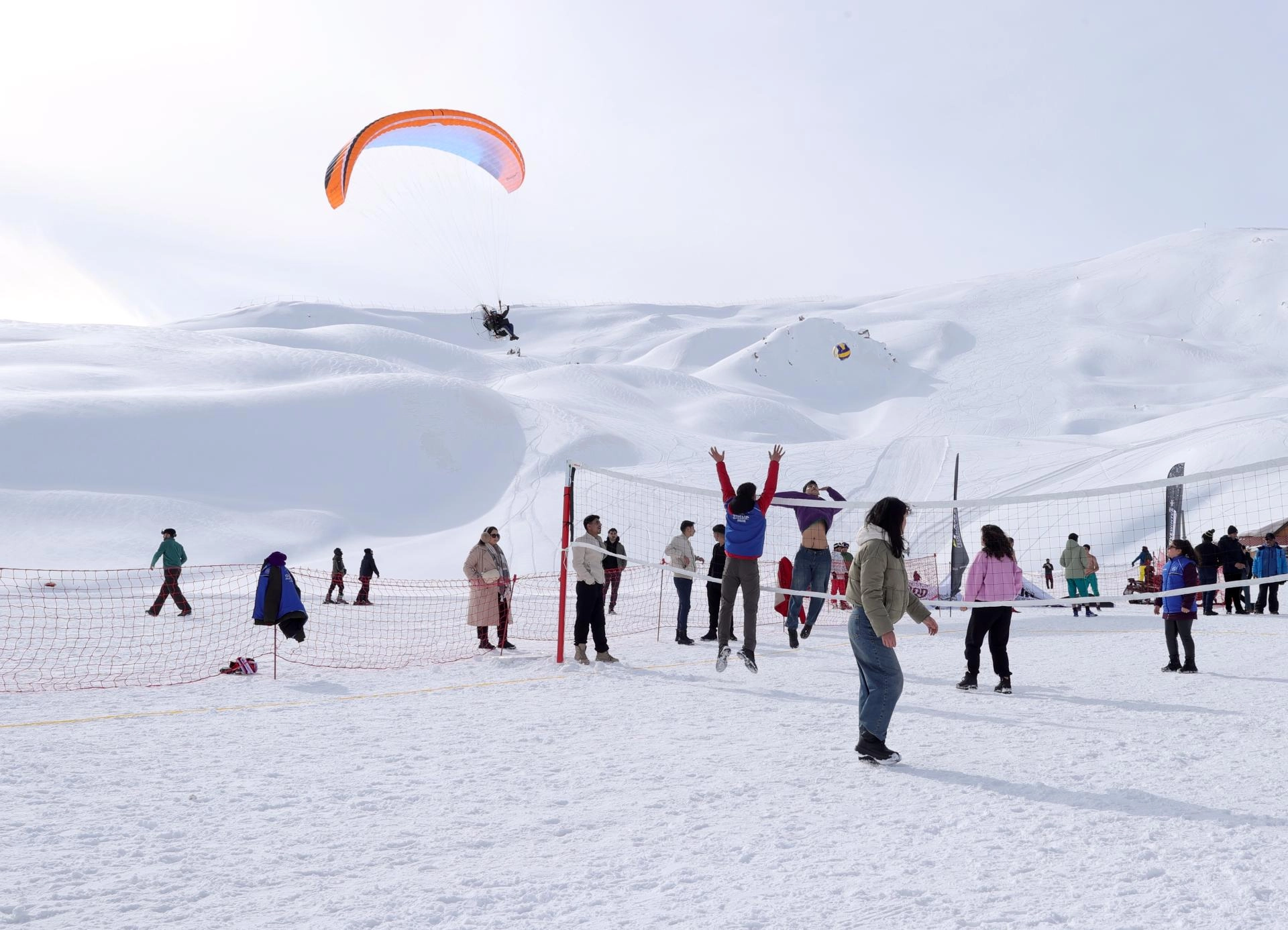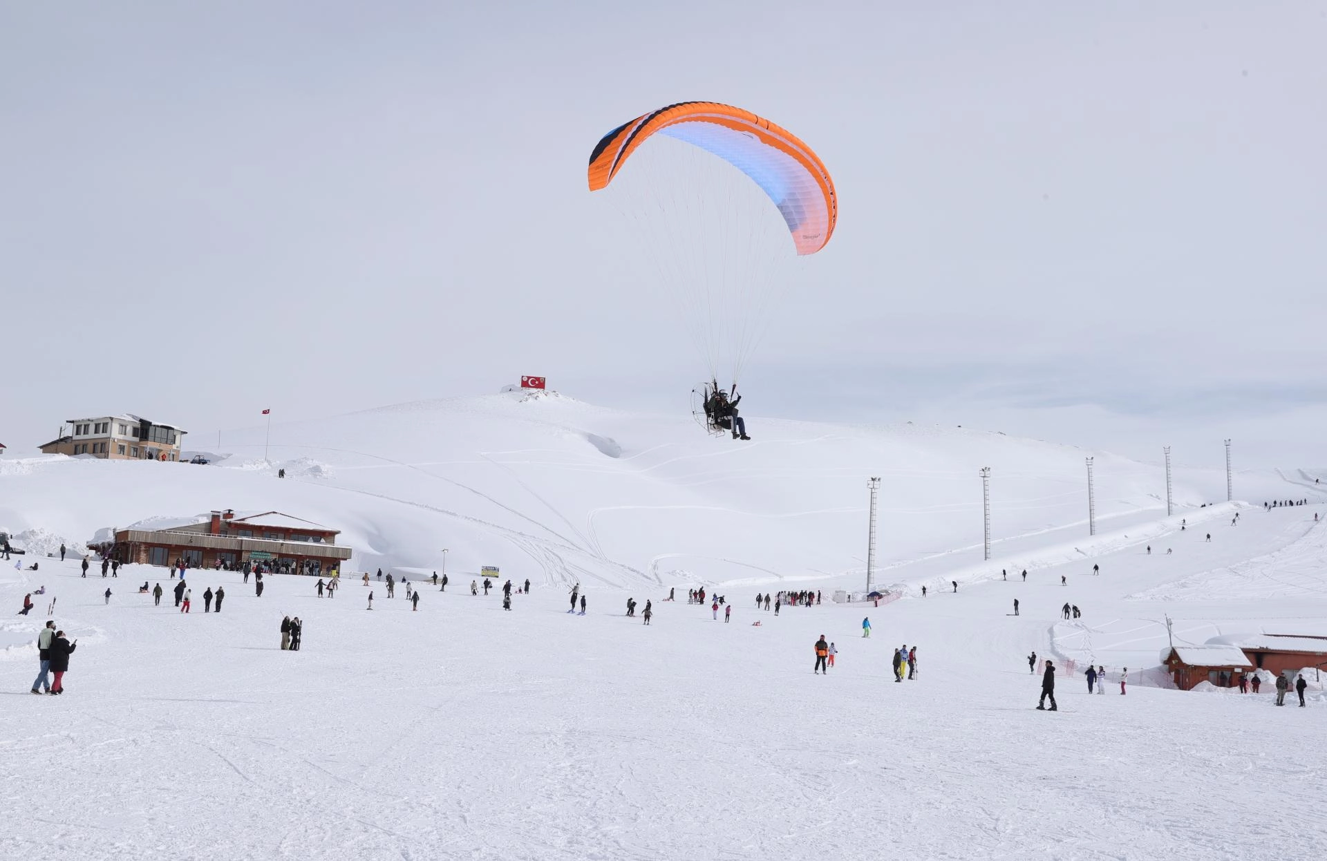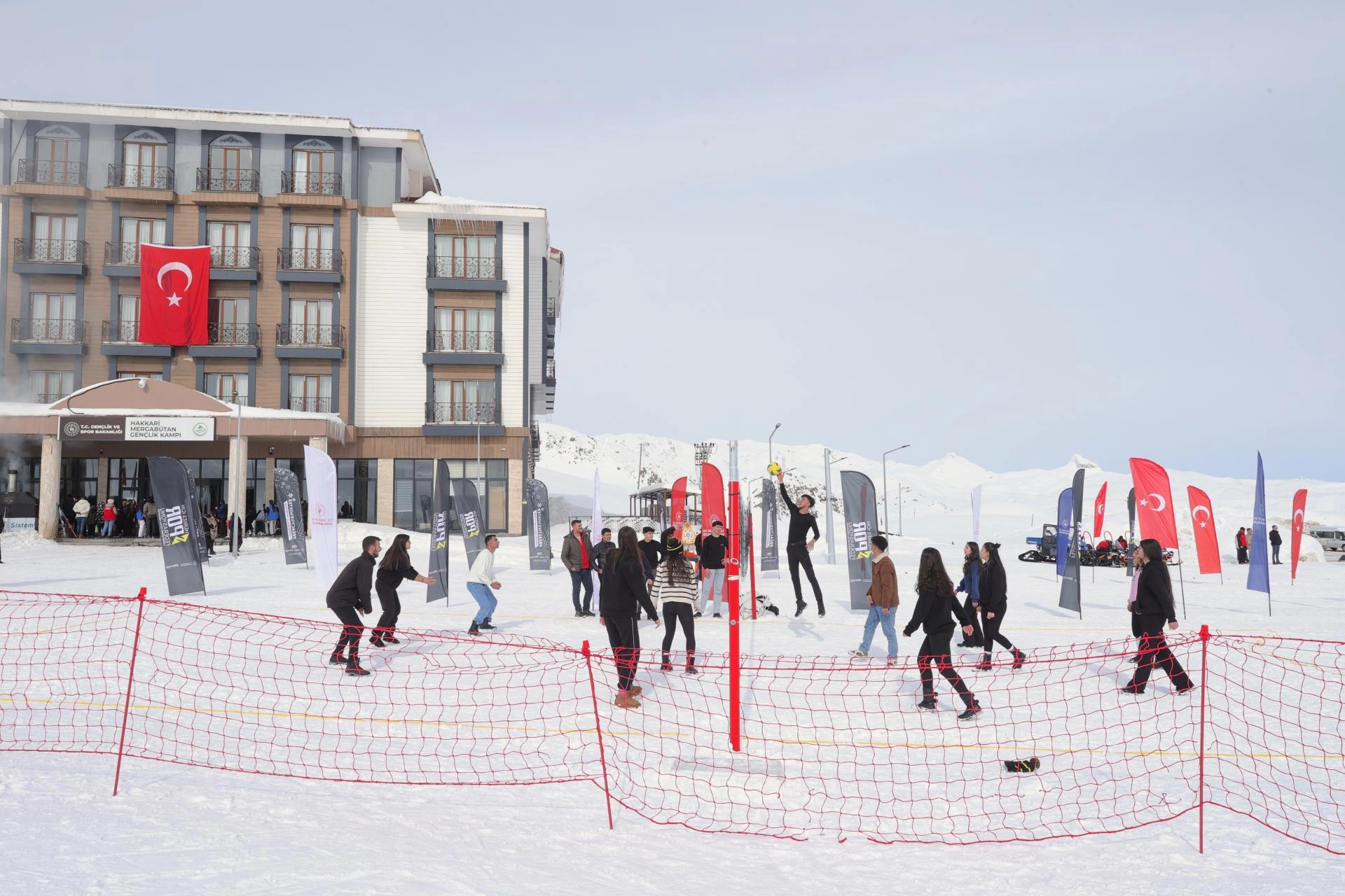 Öğretmen pilot Hasan Tur'un paramotor gösterisi sunduğu programda sporcular, karda güreş yaptı, voleybol oynadı, pistte botla kaydı.