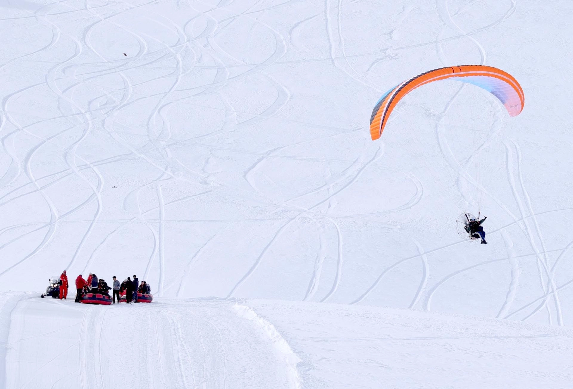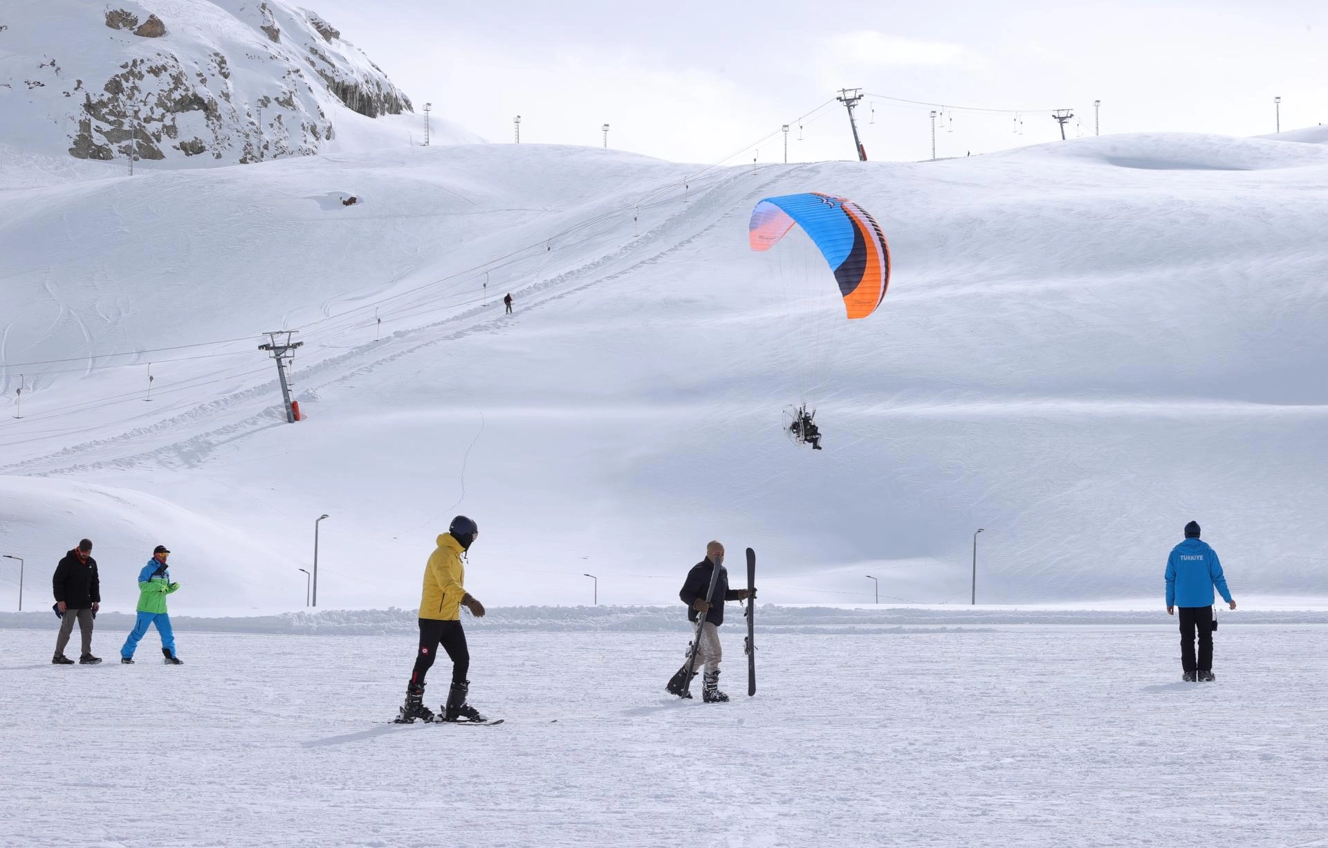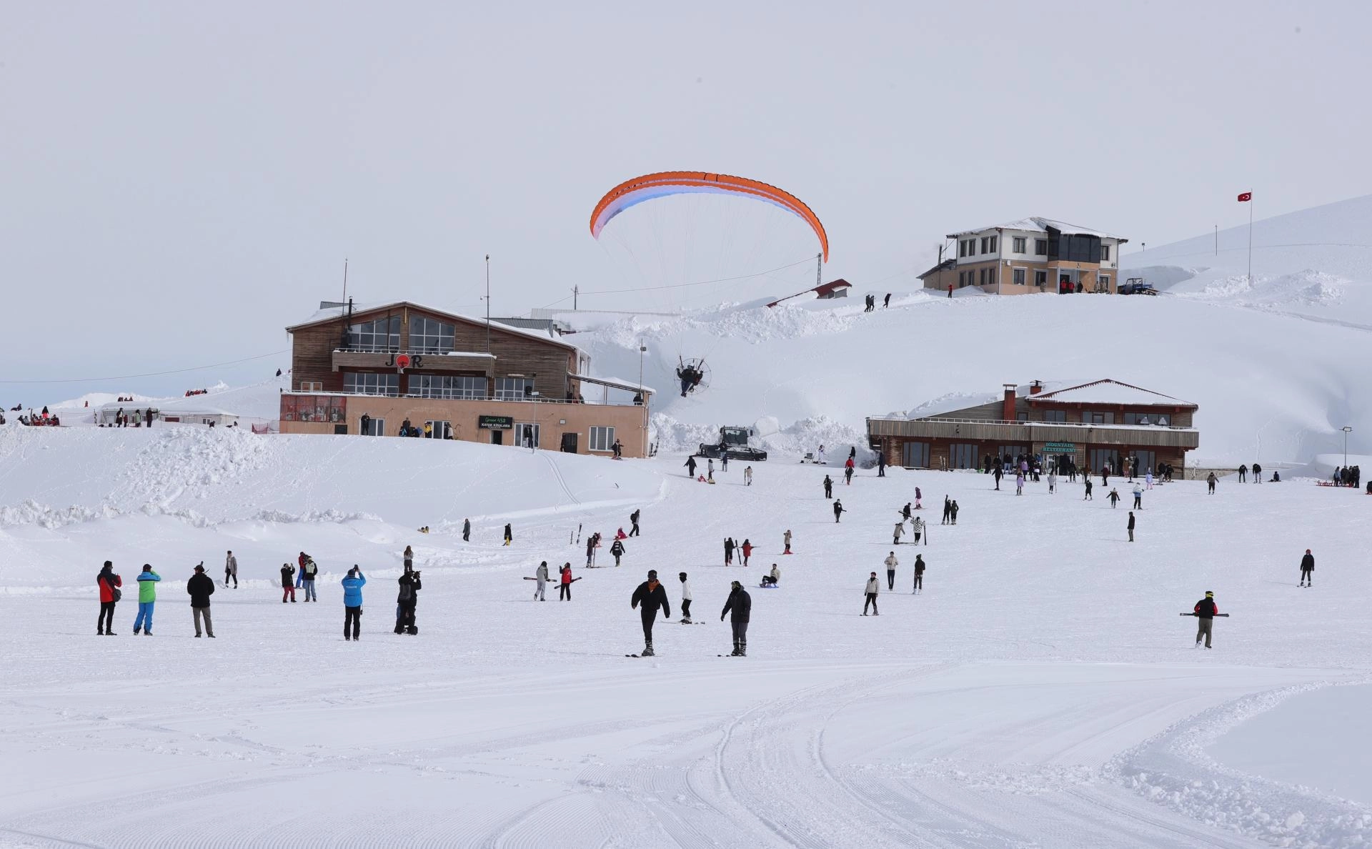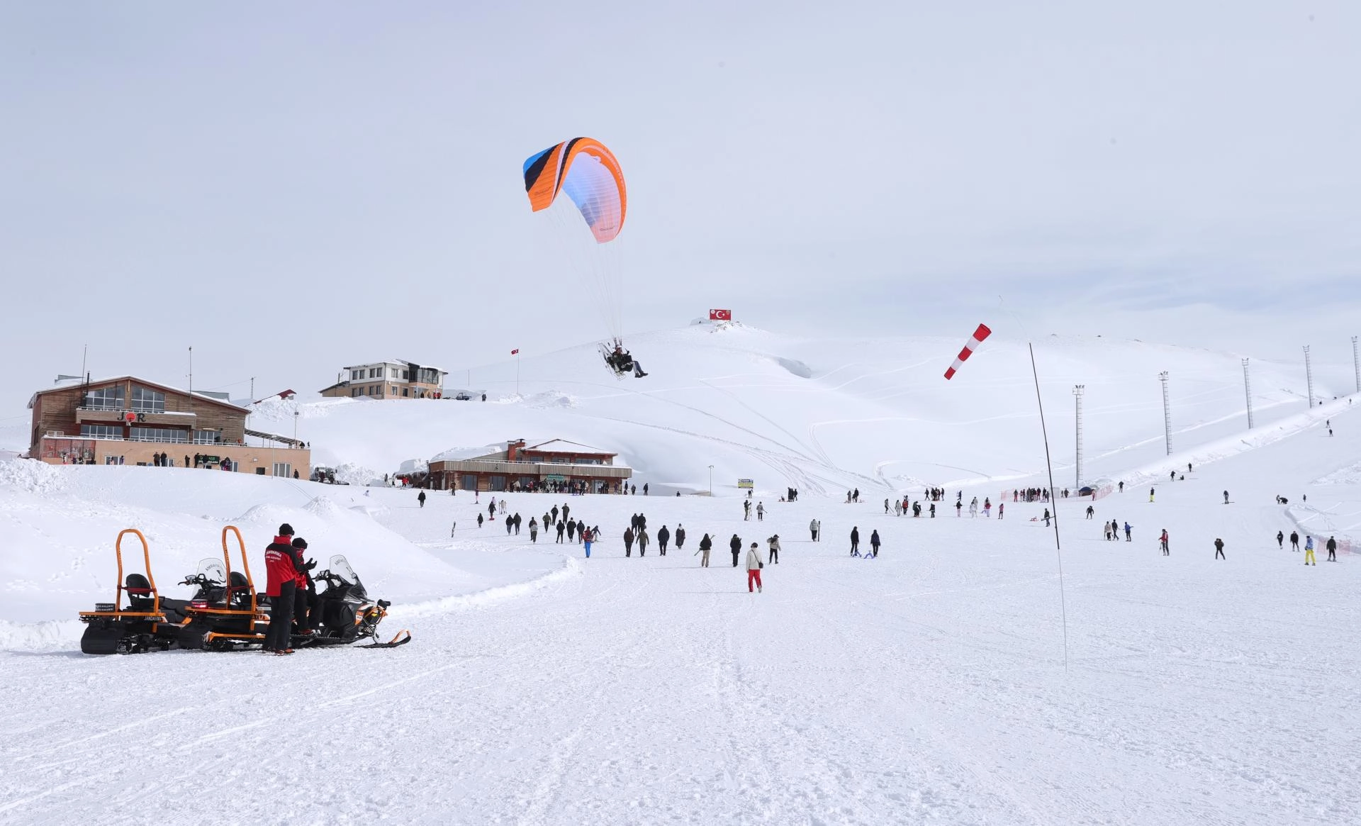 Öğretmen pilot Hasan Tur'un paramotor gösterisi sunduğu programda sporcular, karda güreş yaptı, voleybol oynadı, pistte botla kaydı.