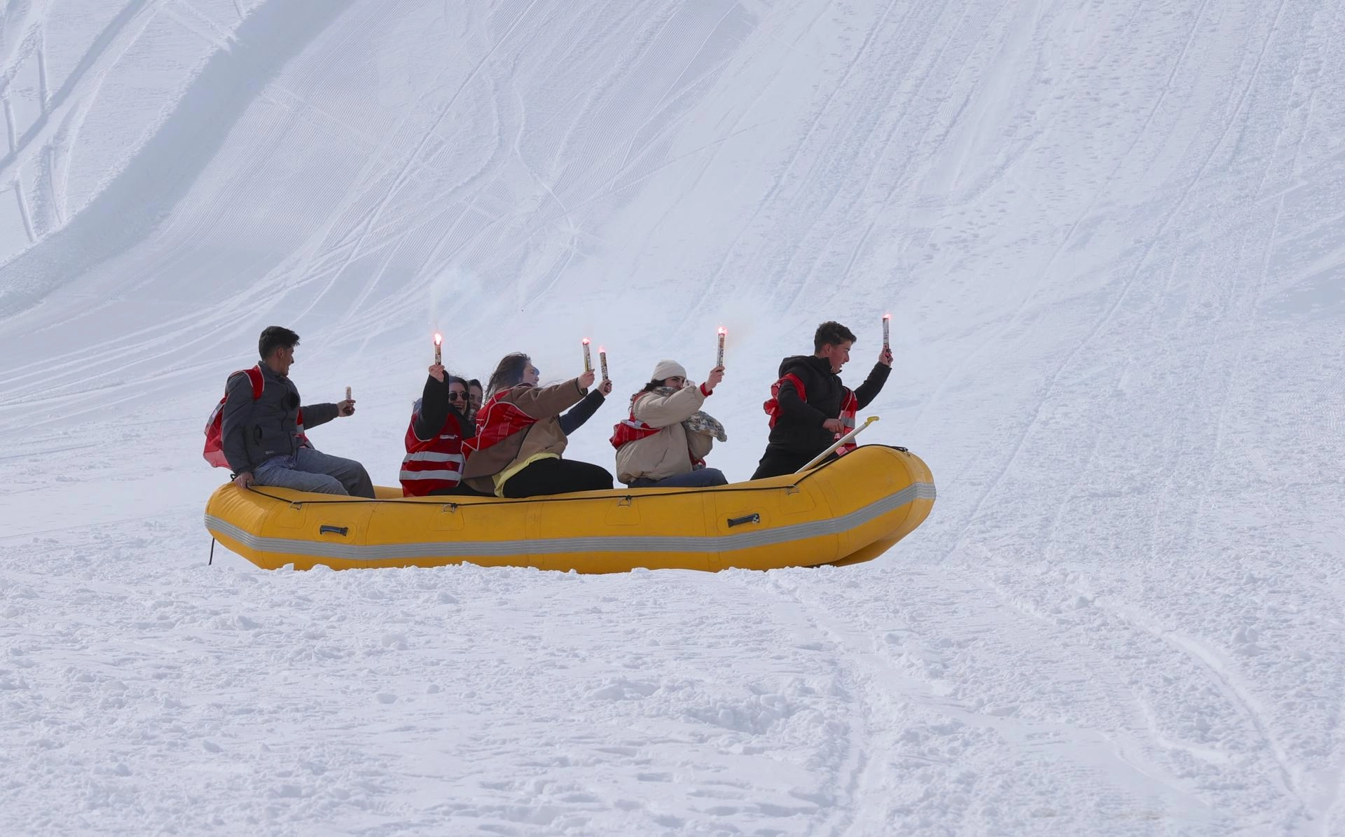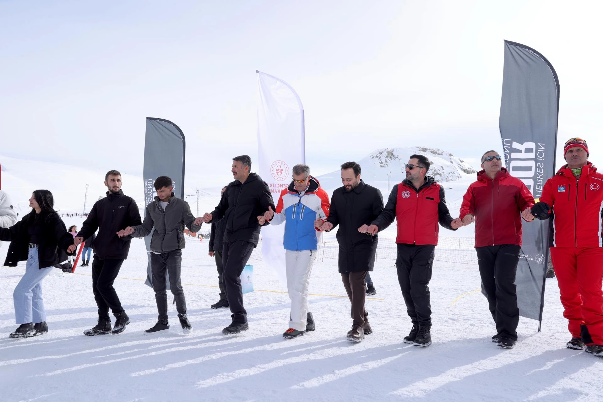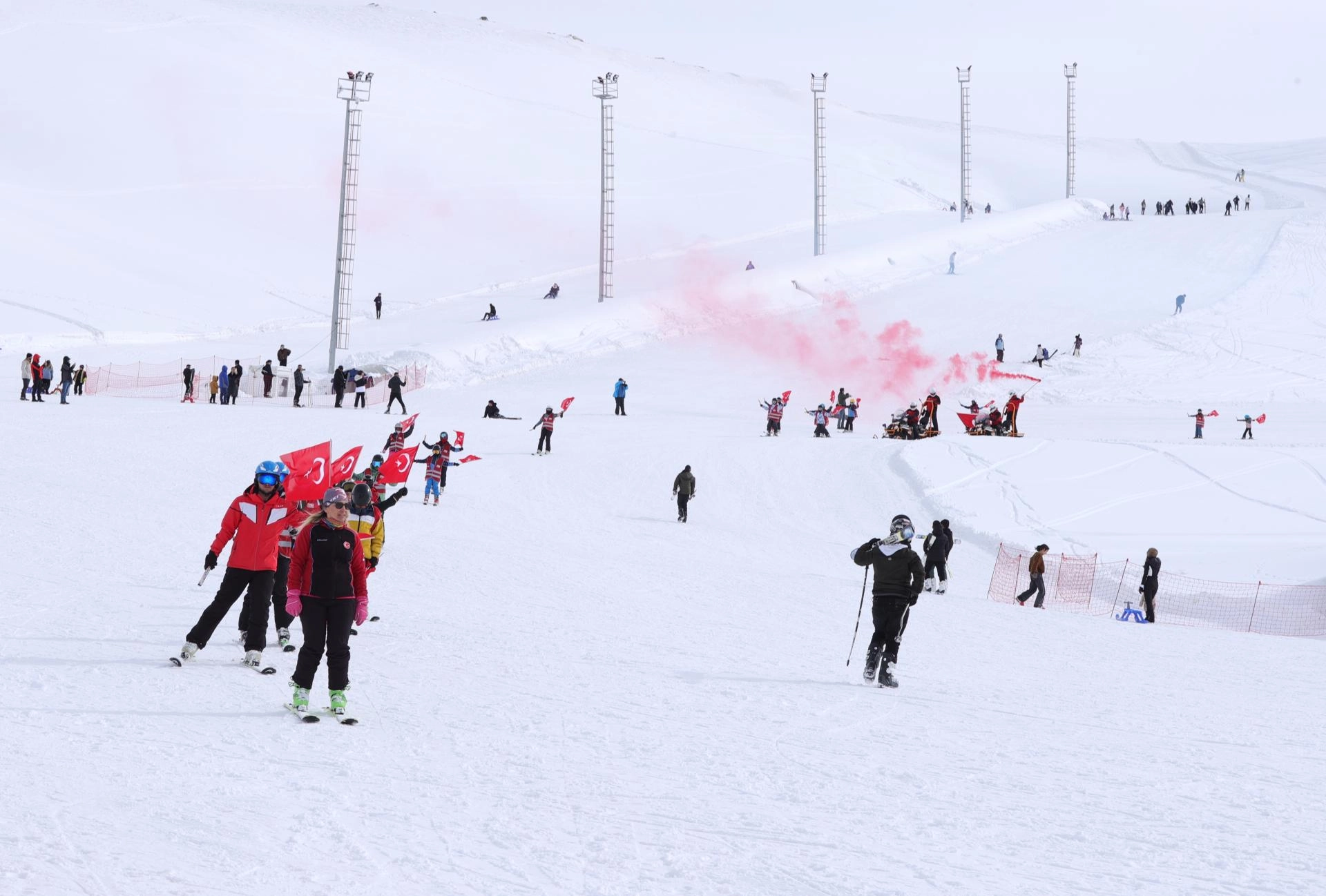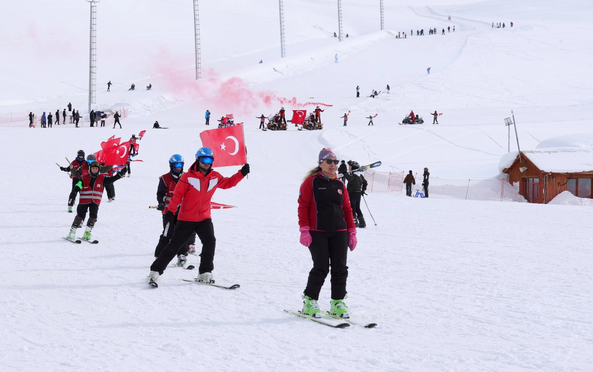 Kent merkezine 12 kilometre uzaklıktaki Mergabütan Kayak Merkezi'nde düzenlenen programda, sporcular tarafından bayraklı ve maşaleli kayak gösterisi yapıldı.
