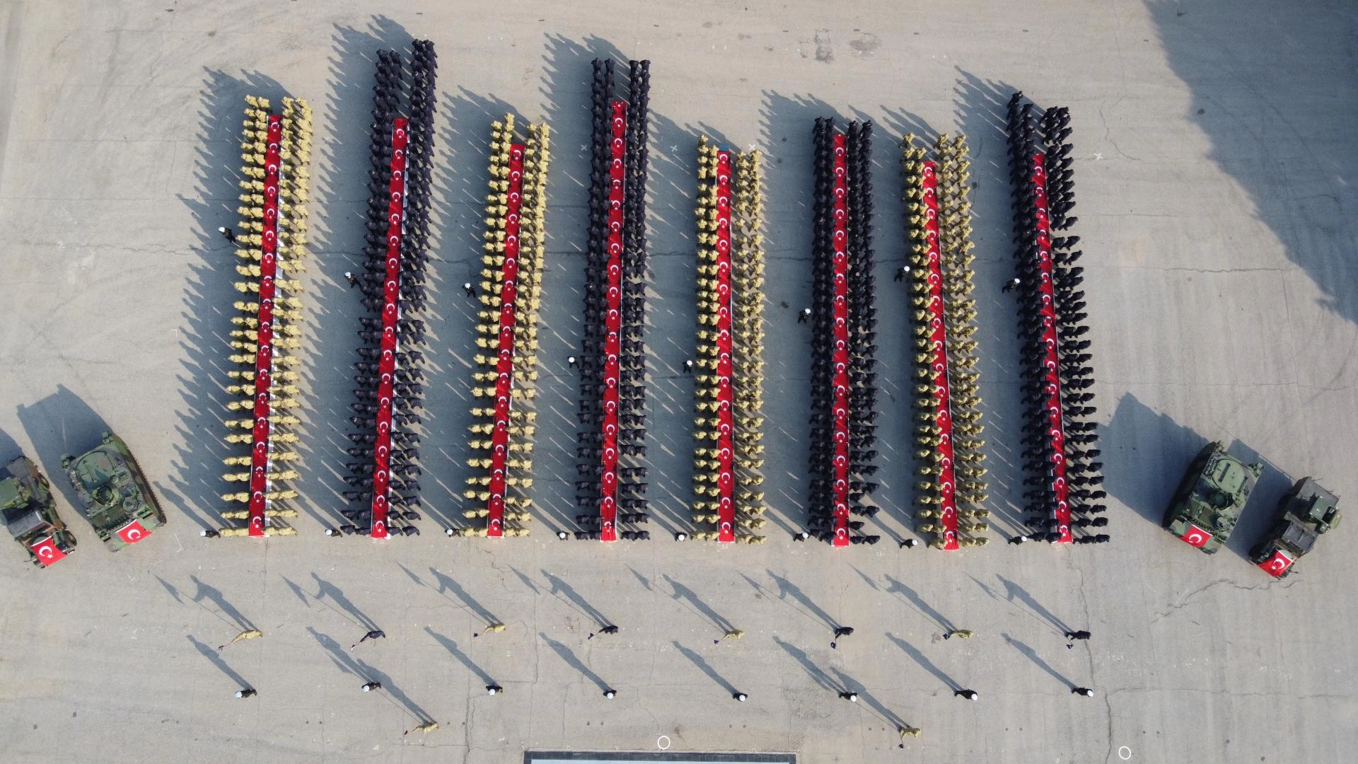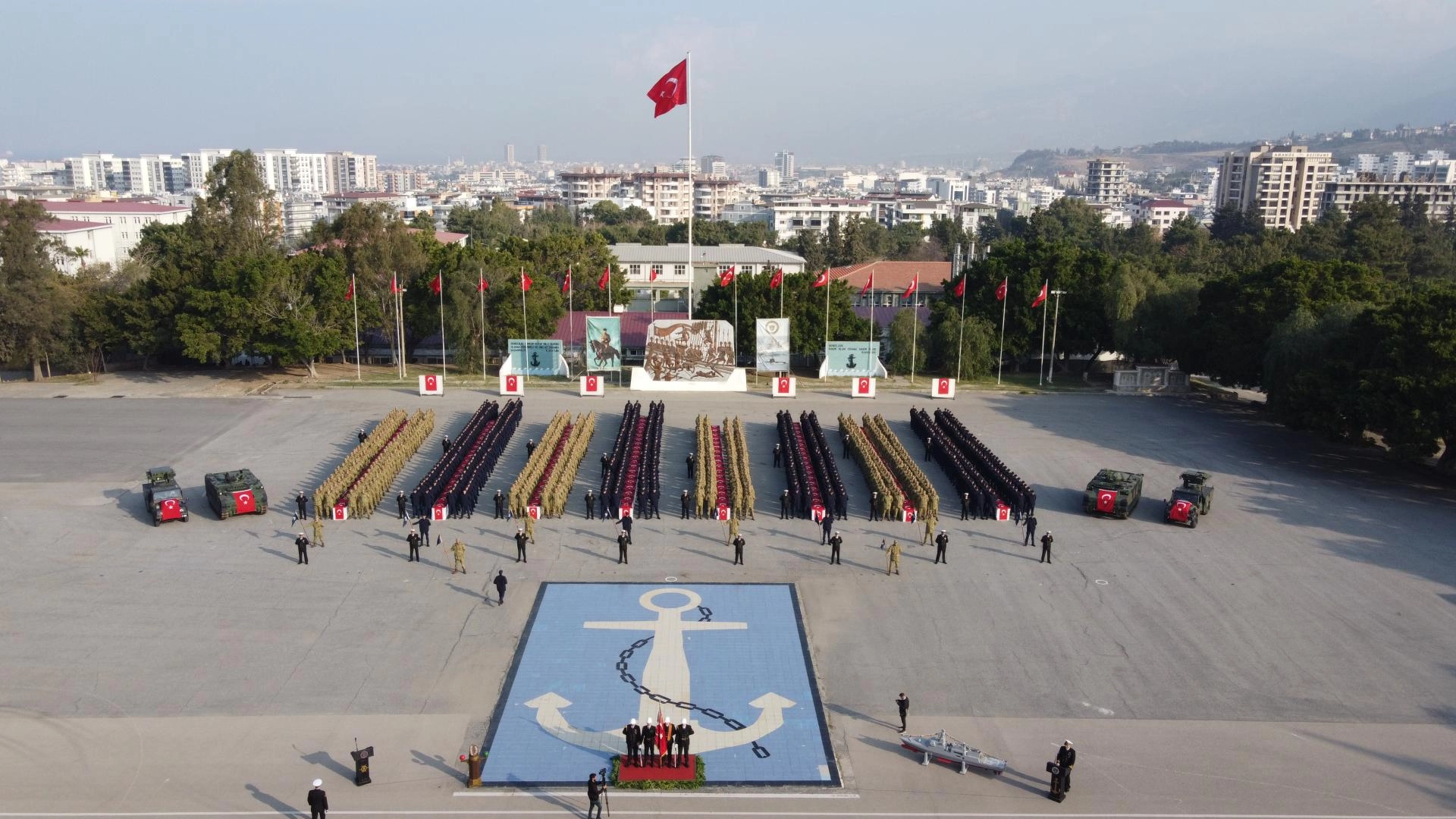 Akdeniz Bölge Komutanı Tuğamiral Soner Kazankaya'nın askerleri ve ailelerini selamlamasının ardından katılımcılar saygı duruşunda bulundu, İstiklal Marşı'nı okudu.