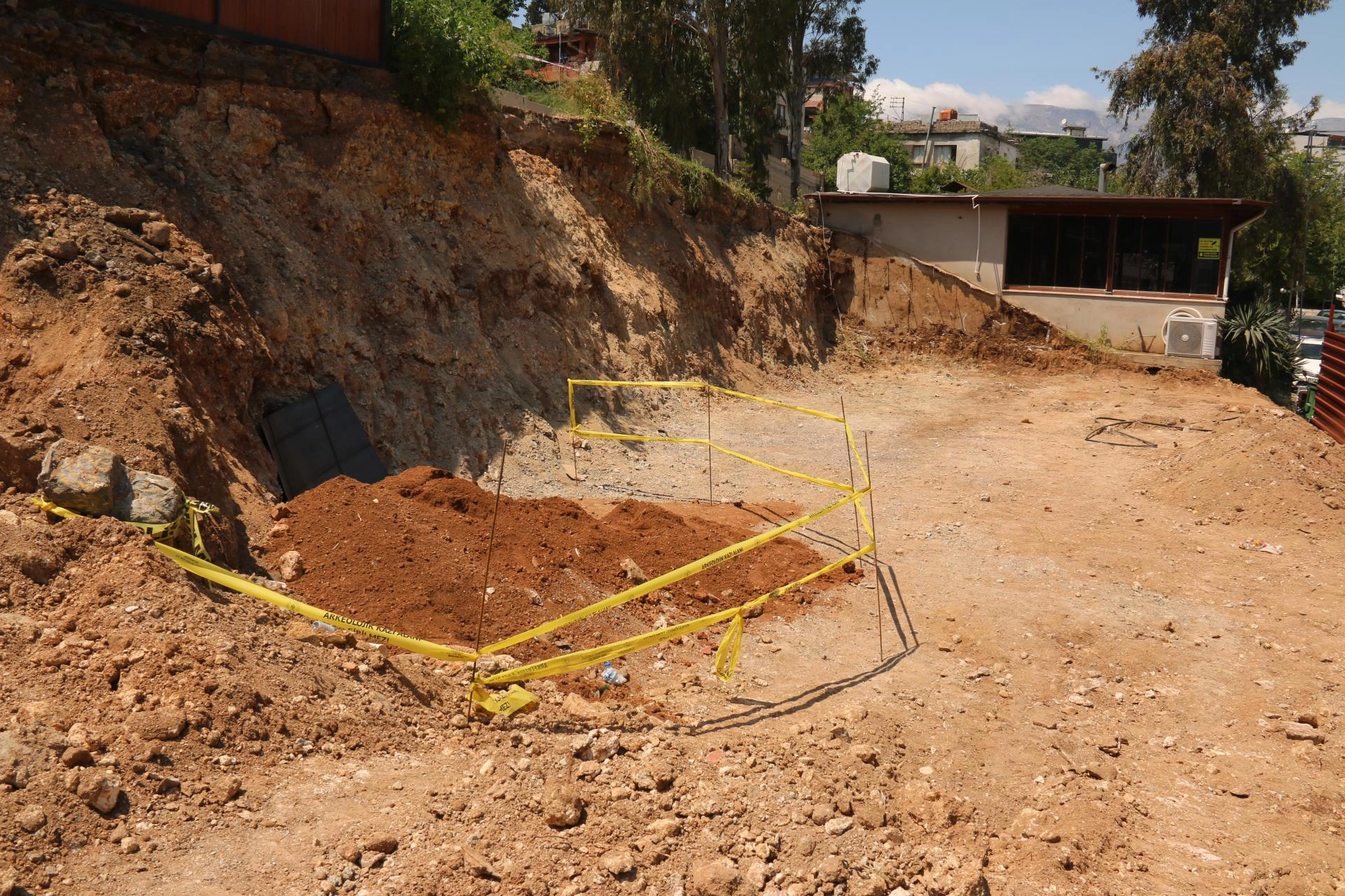 HATAY (AA) - Hatay'ın Kırıkhan ilçesinde belediye tarafından yürütülen sosyal tesis inşaatının temel kazısı sırasında tarihi kalıntılara rastlanılması üzerine çalışmalara ara verildi.