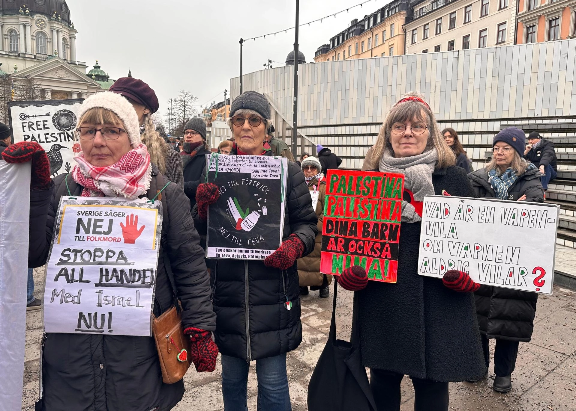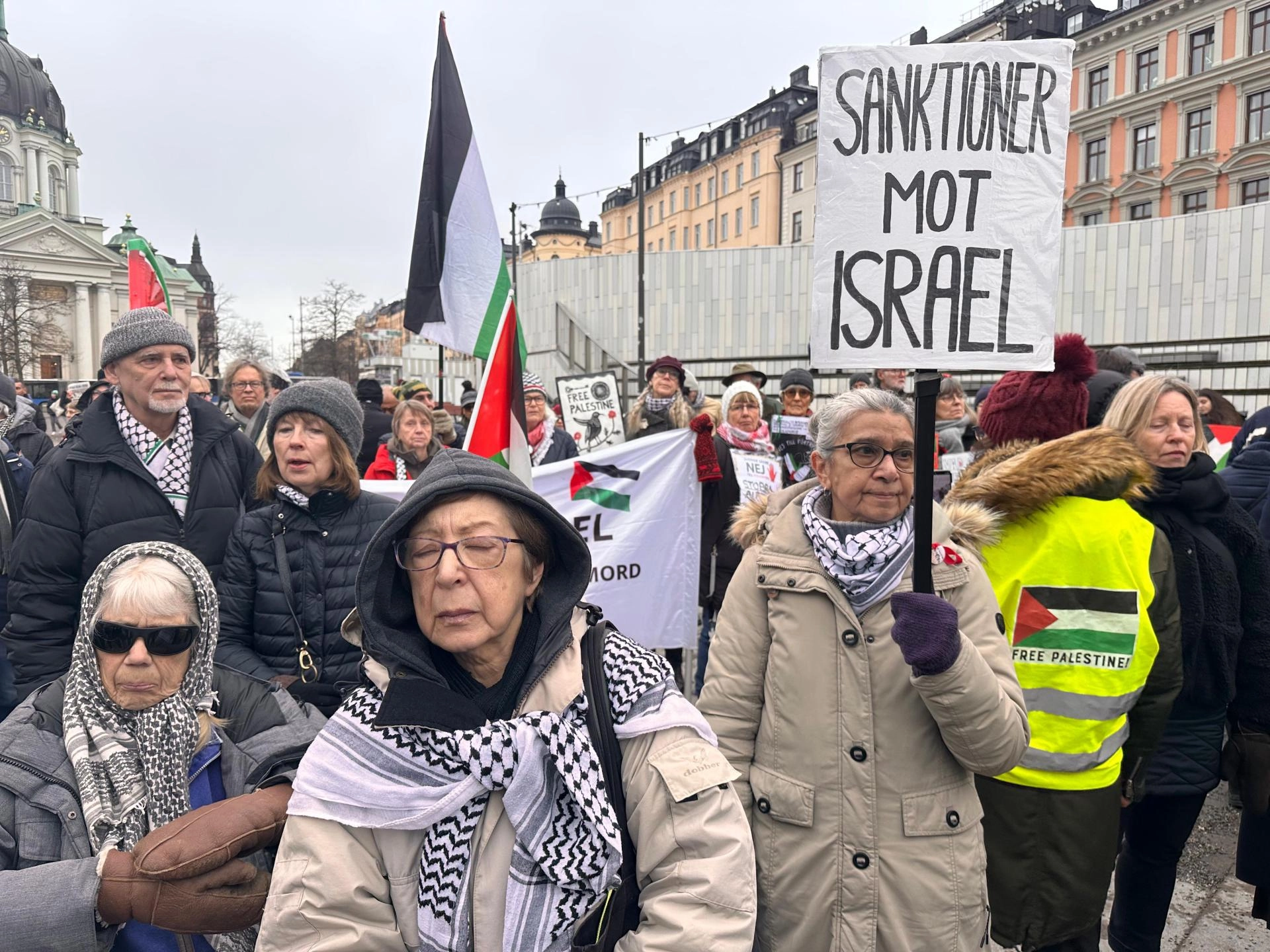Eylemde, "Gazze'de çocuklar öldürülüyor", "Soykırımı durdurun" ve "Sonsuza kadar Filistin" yazılı pankartlar taşıyan göstericiler, İsveç Parlamentosu ve Dışişleri Bakanlığı binalarının önlerine kadar yürüdü.