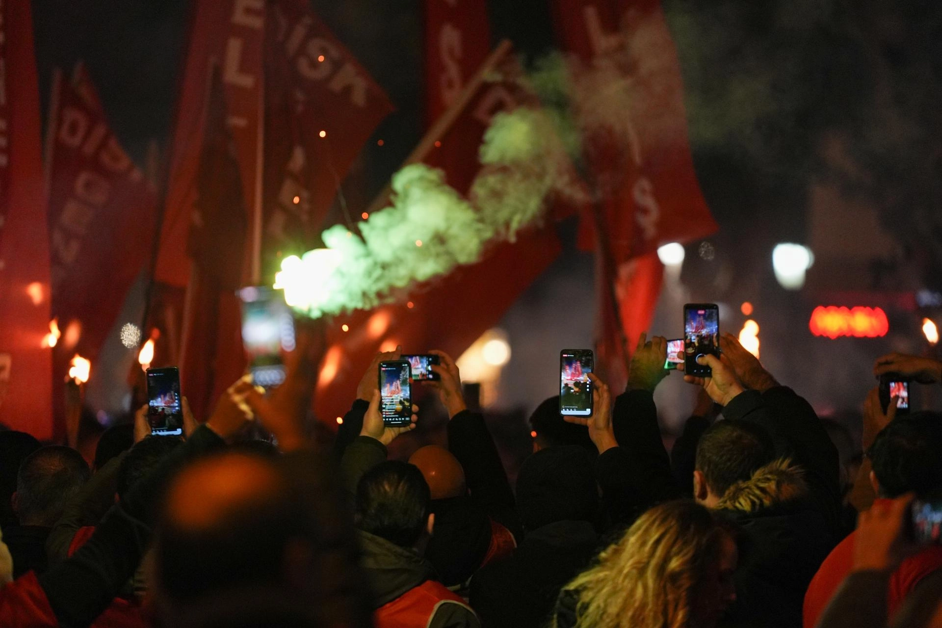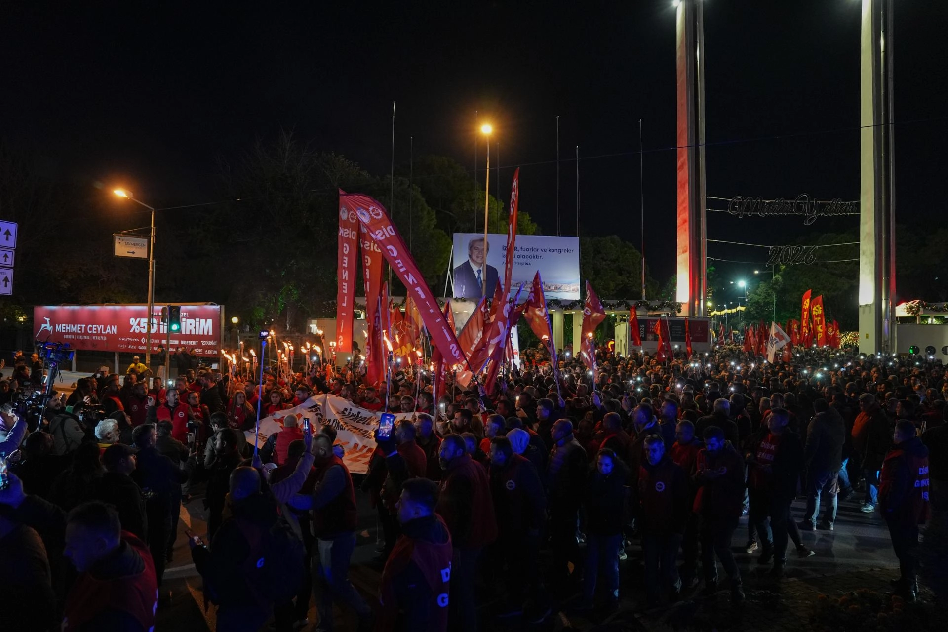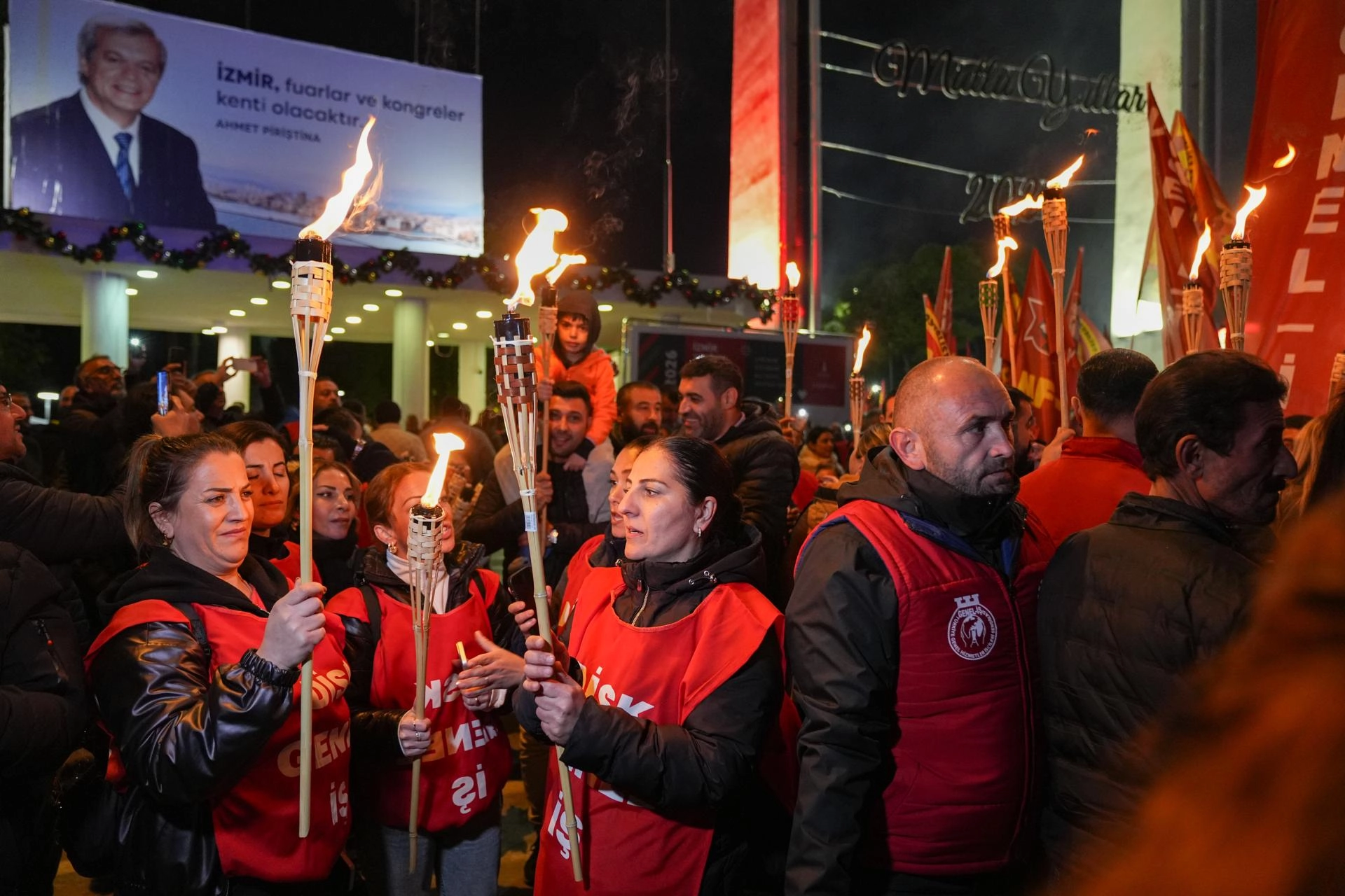 İZMİR (AA) - İzmir'de, maaş ve sosyal haklarında eksiklik olduğunu belirten Büyükşehir Belediyesi iştiraki şirketlerinden İZELMAN, İZNERJİ, İZFAŞ, İZTEK ve EGEŞEHİR çalışanları ile temmuz ayında ücretsiz izne çıkarıldıktan sonra işbaşı yaptırılmayan işçiler, meşaleli eylem yaptı.