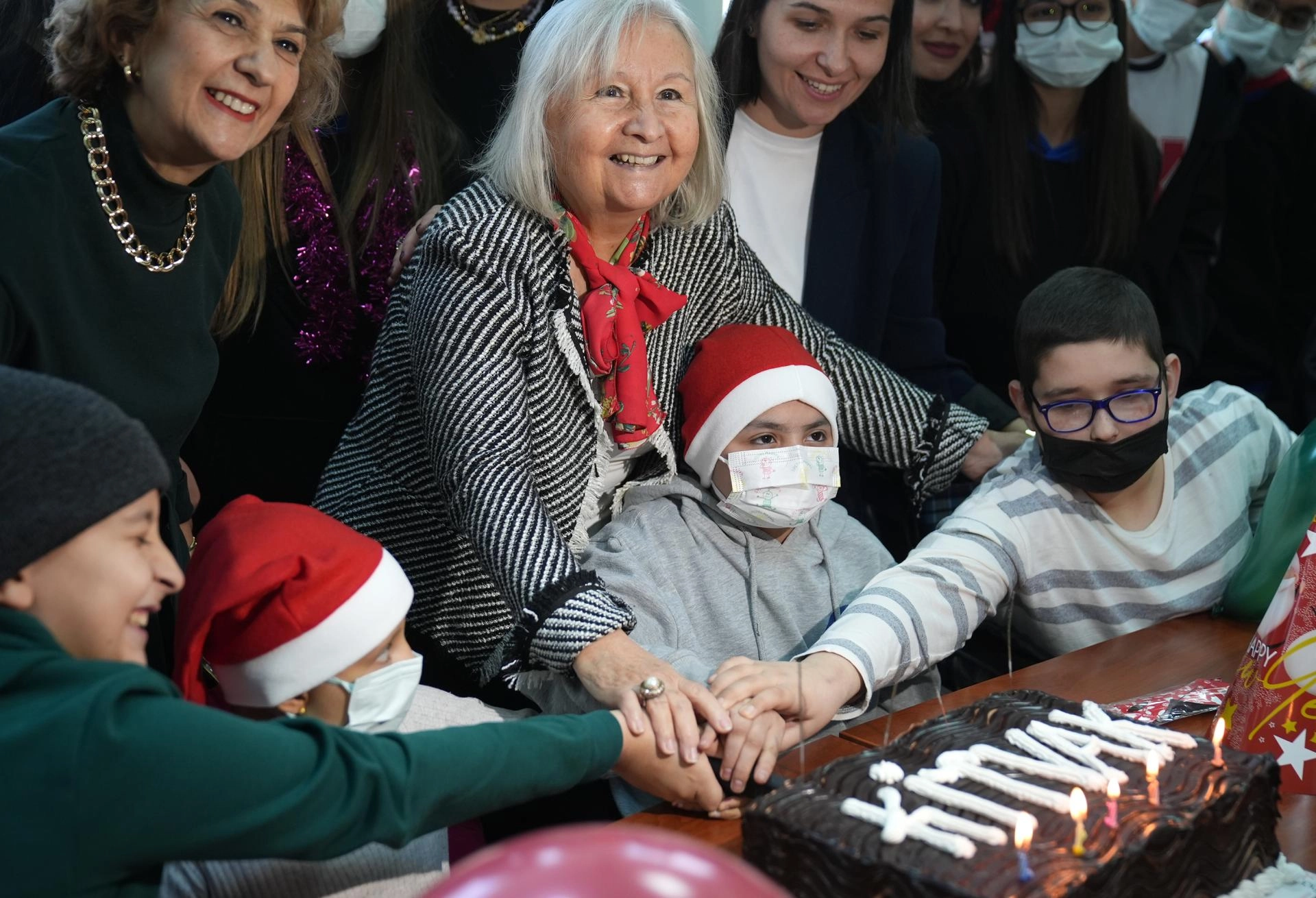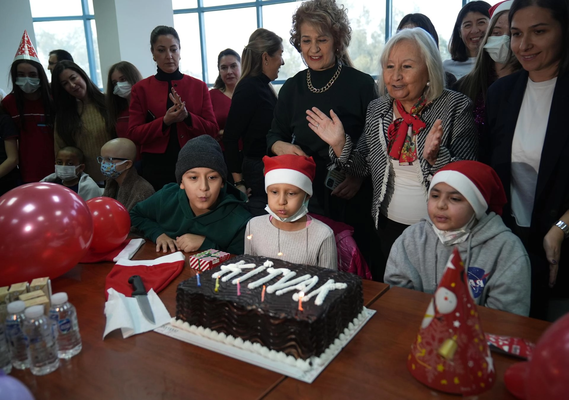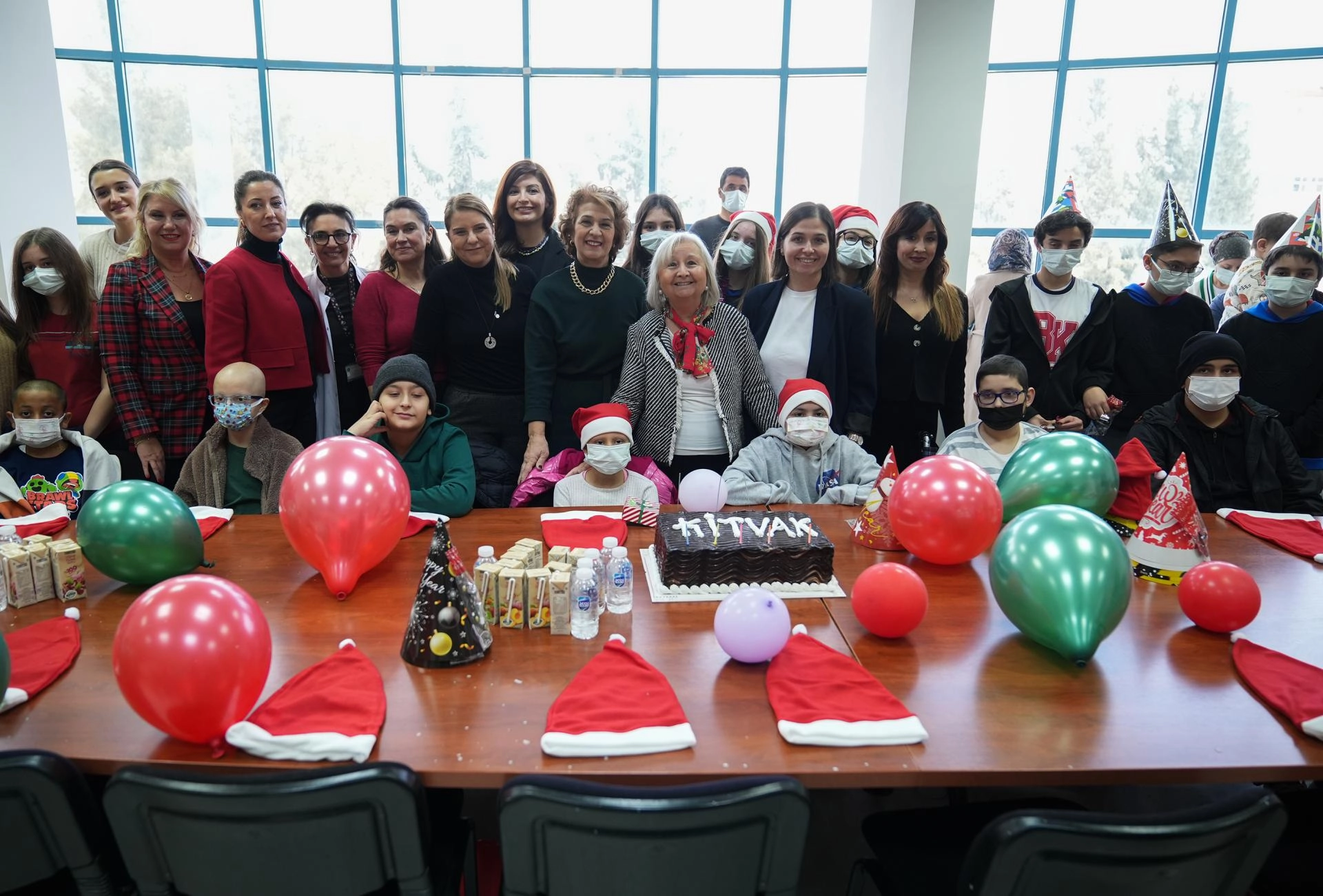 Sağlık çalışanları, vakıf üyeleri, çocuklar ve aileleri yeni yıl pastasını birlikte kesti.