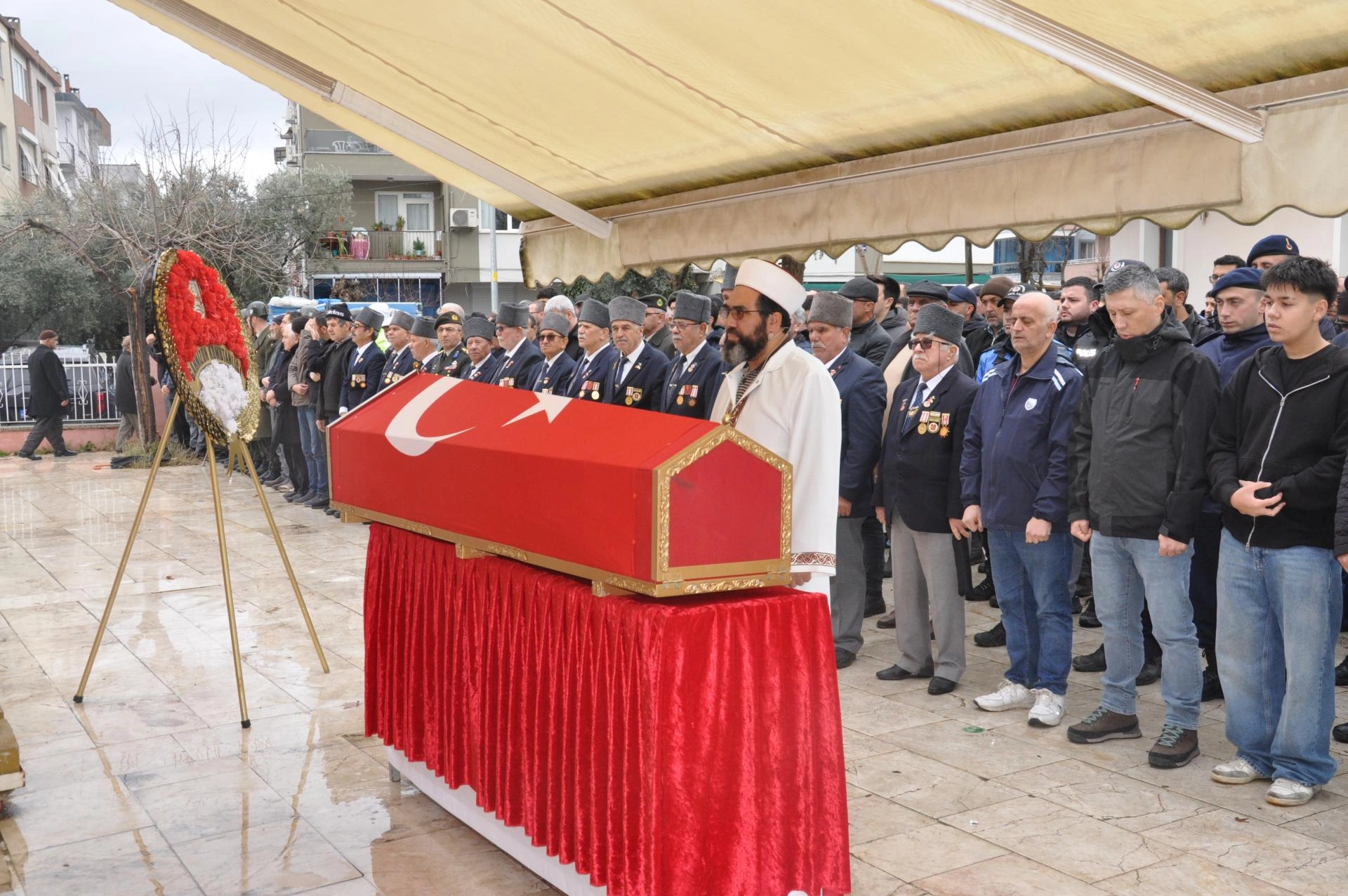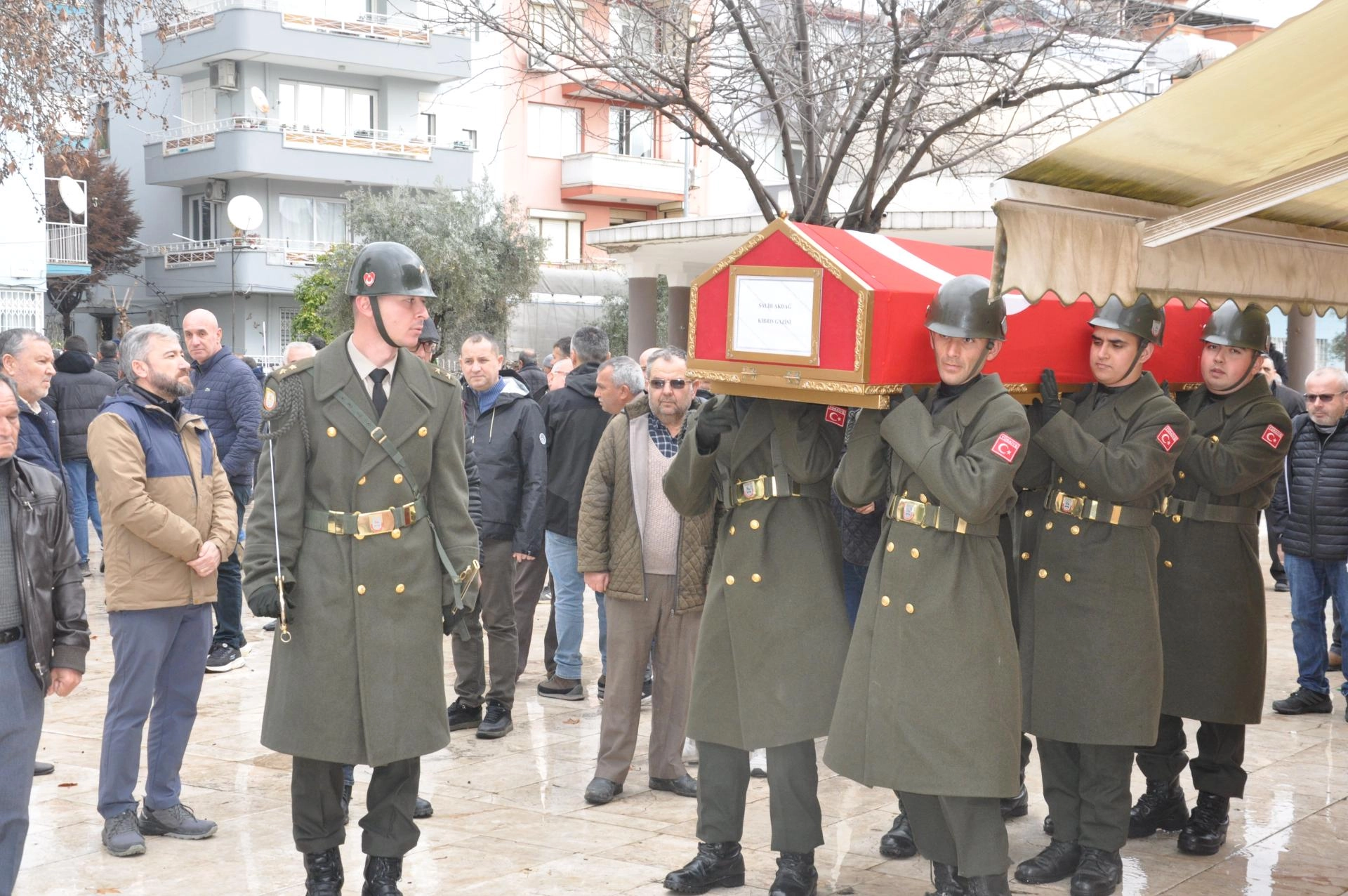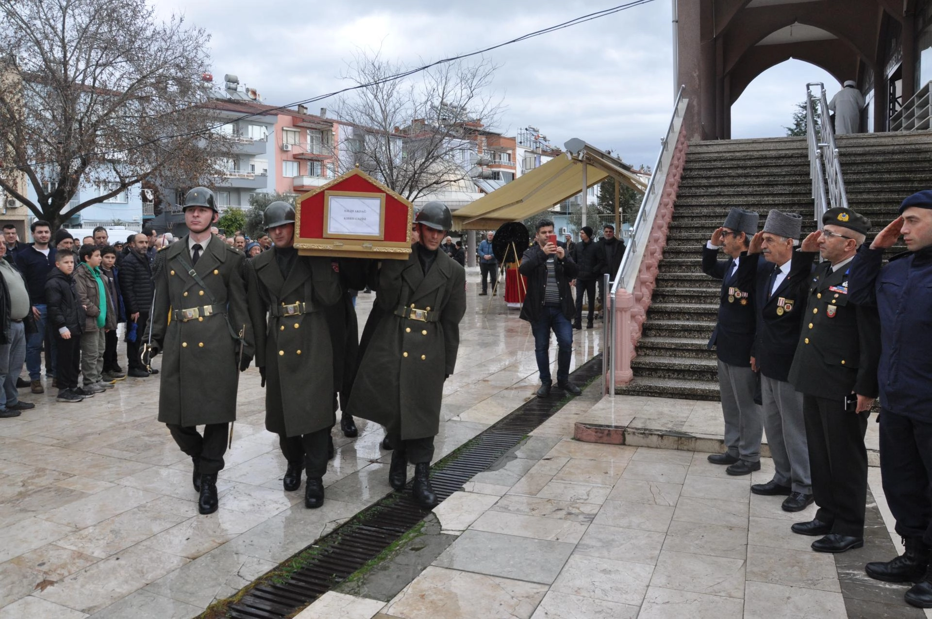 Kıbrıs gazisinin Türk bayrağına sarılı cenazesi, askerlerin omzunda Hamdibey Camisi'ne getirildi.