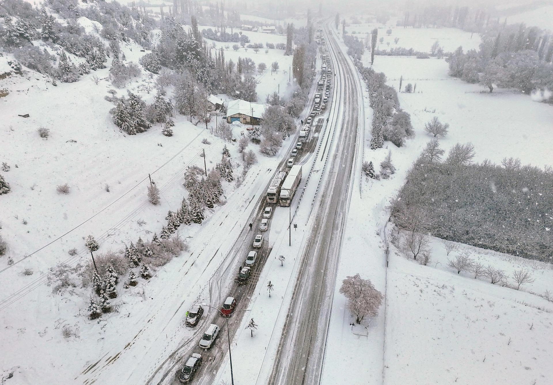 Bazı tır ve araçların yolda kalmasının ardından kara yolu ulaşıma kapandı ve uzun araç kuyrukları oluştu.