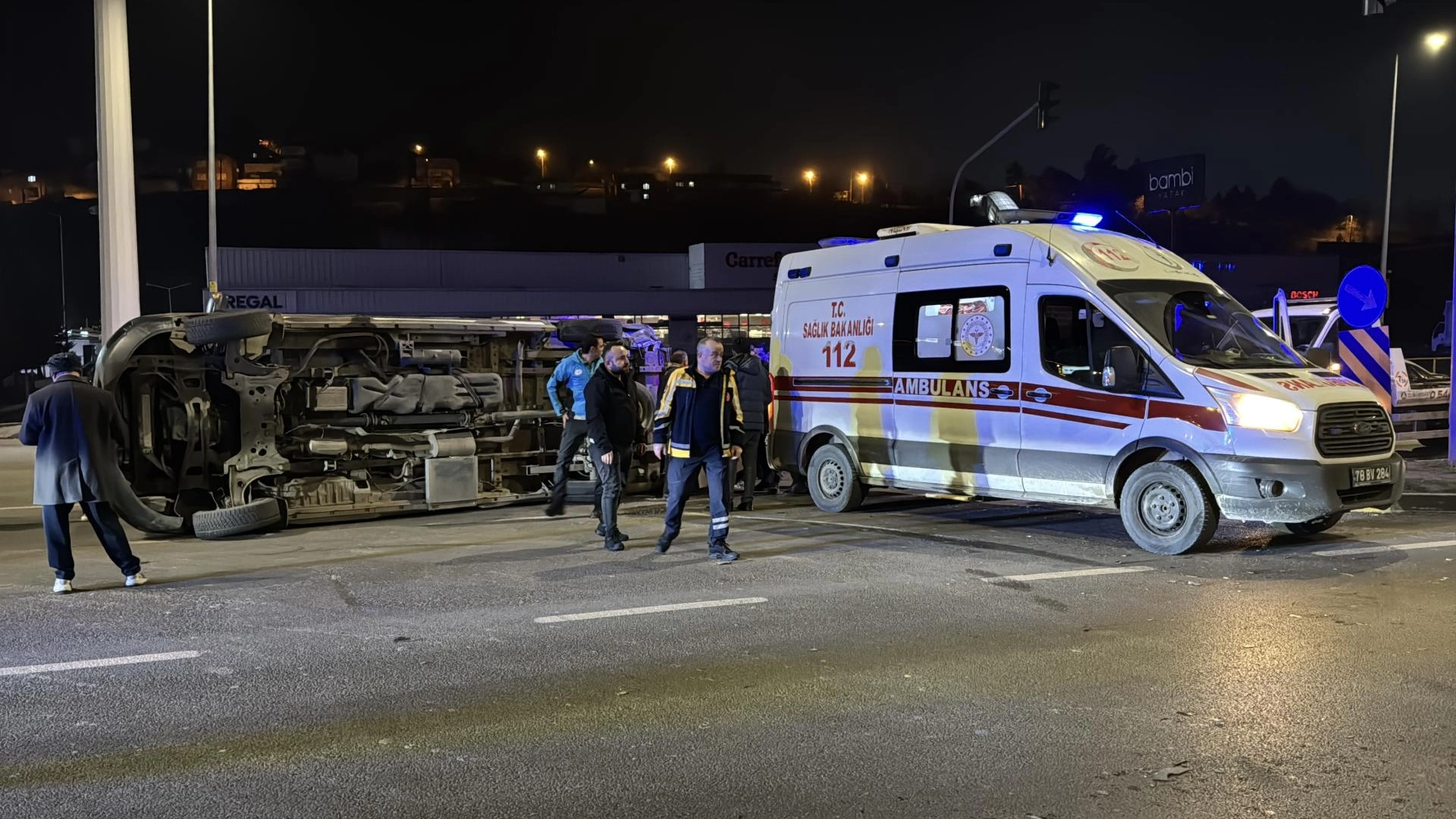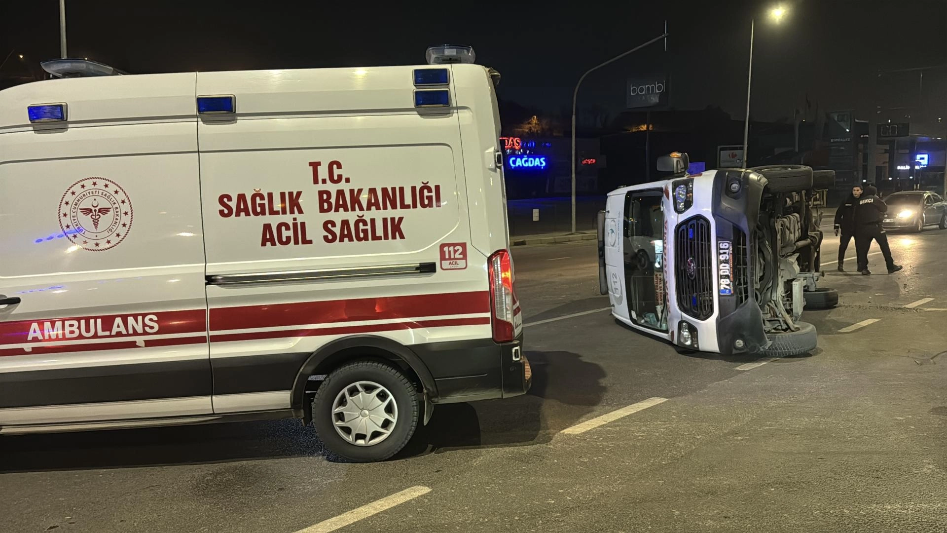 Çarpışmanın şiddetiyle devrilen ambulansın şoförü E.G. ile yanındaki acil tıp teknisyeni H.G.A. ve paramedik S.K. yaralandı.