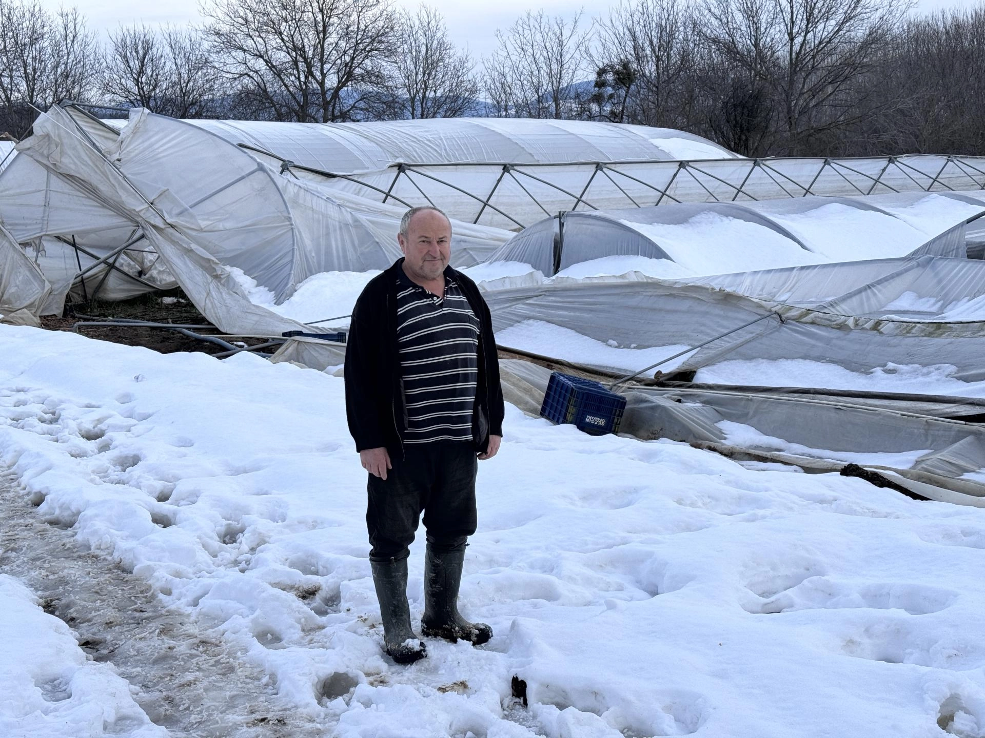 Görüntülerde, kar yüküne dayanamayan seraların aniden çökmesi ve çökme anında serada bulunan Çelik'in komşuları tarafından kurtarılması yer alıyor.