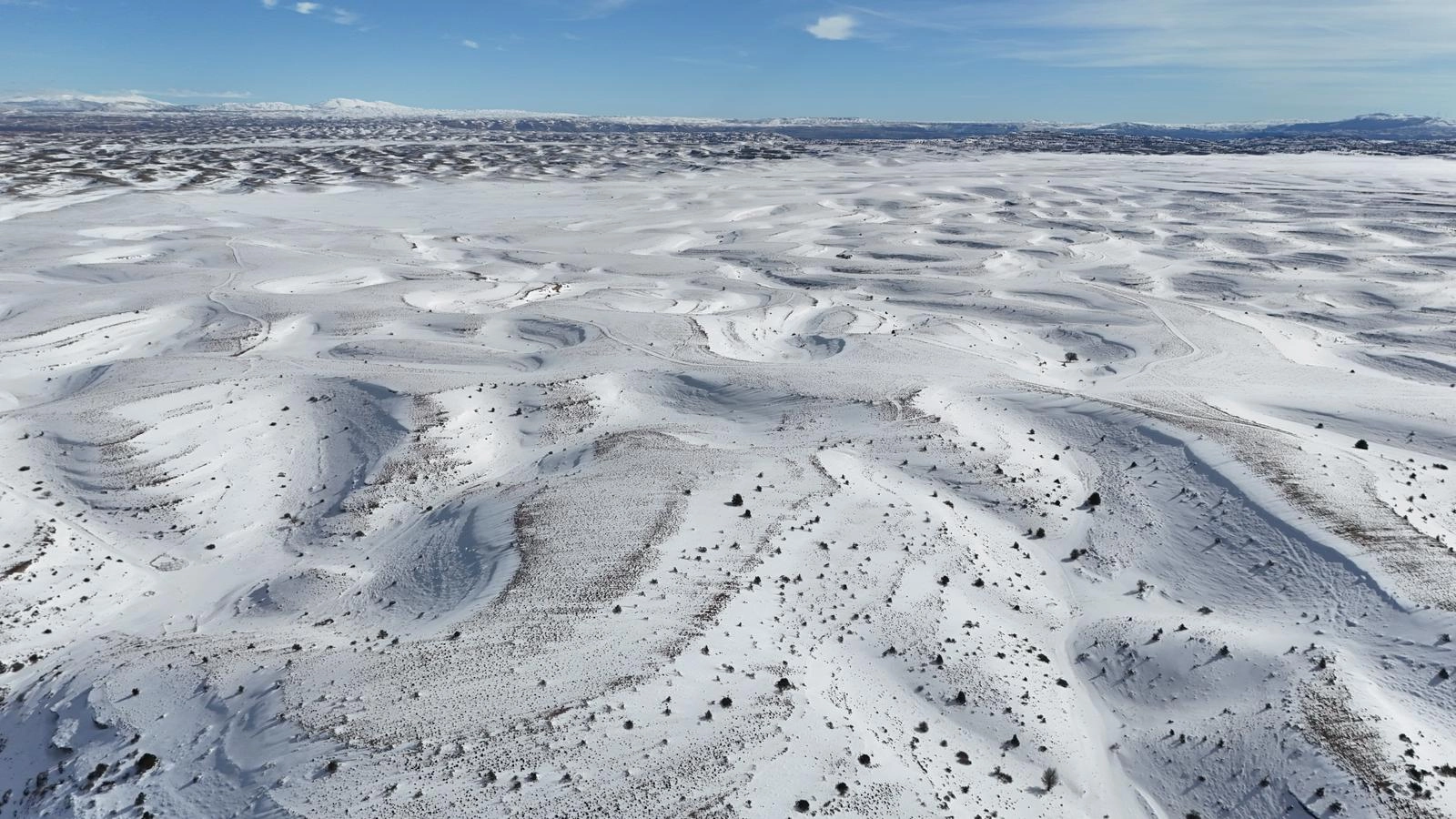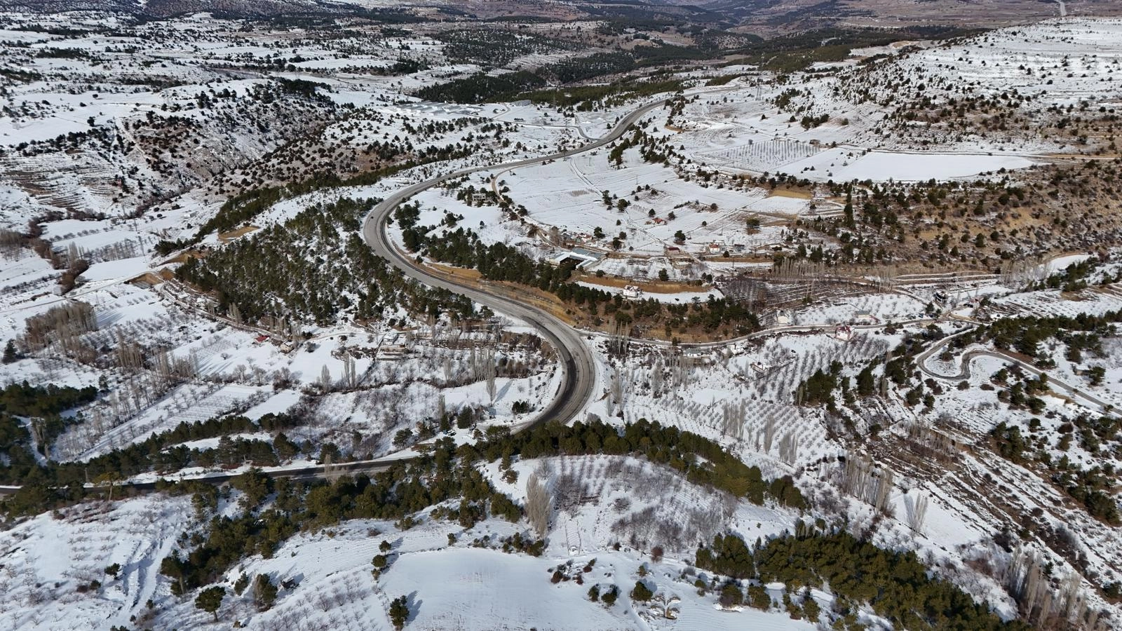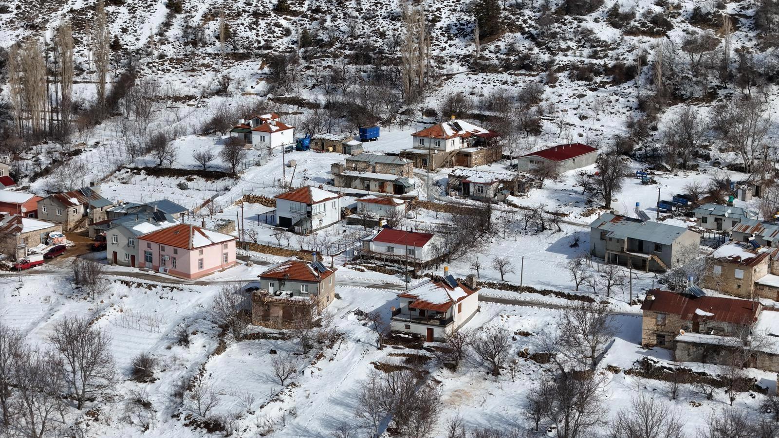 Karla kaplanan köy, havadan görüntülendi.