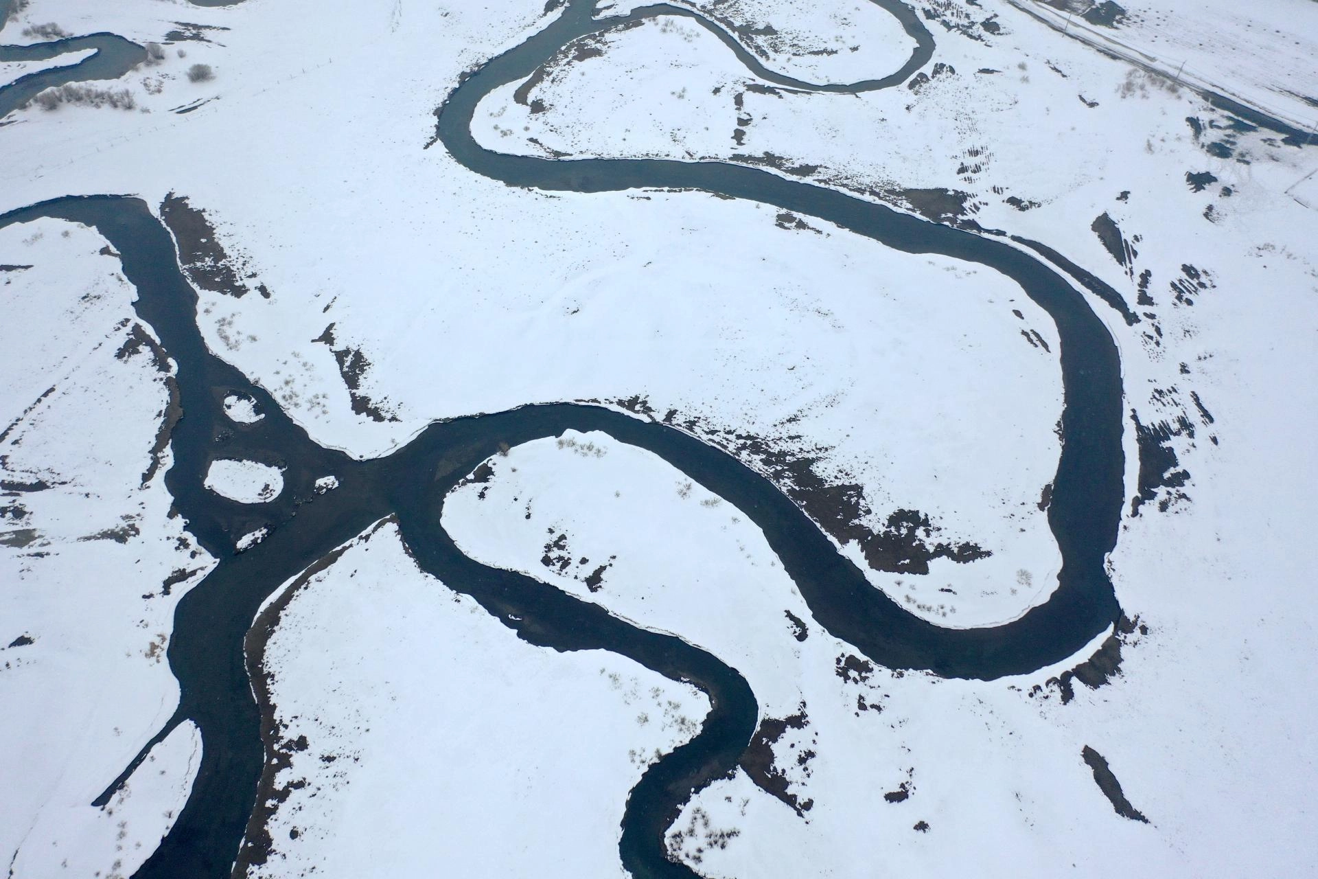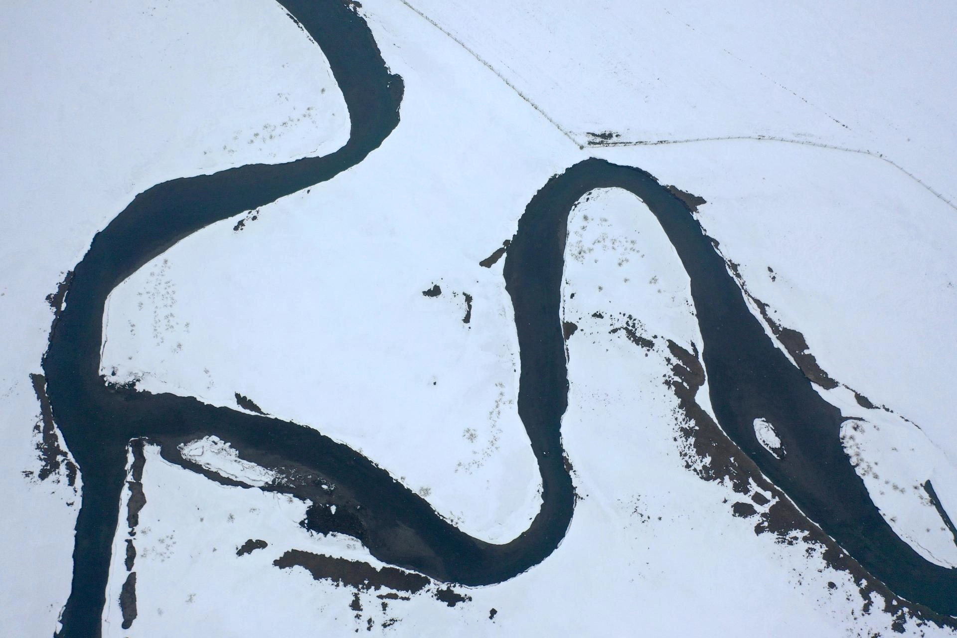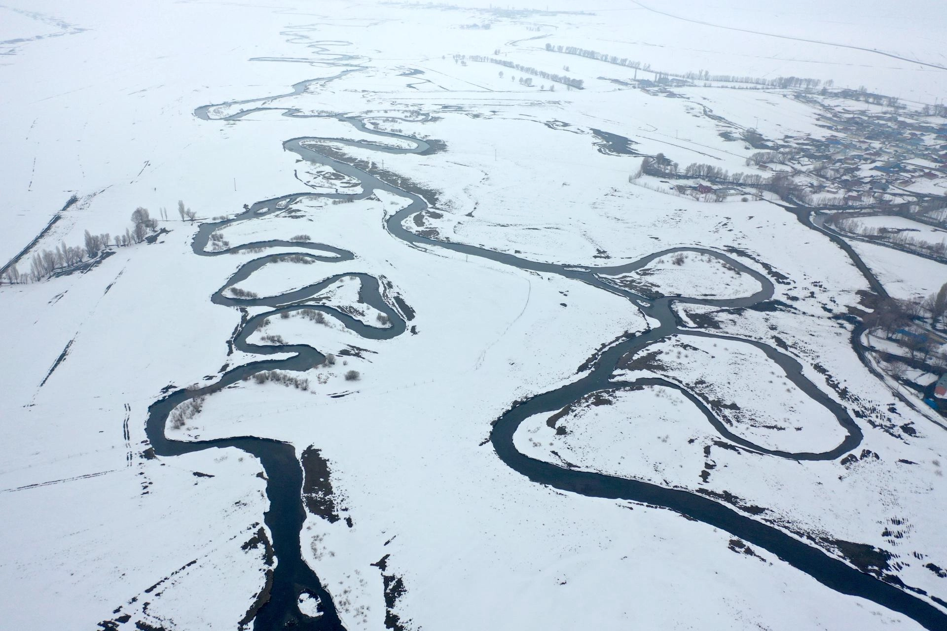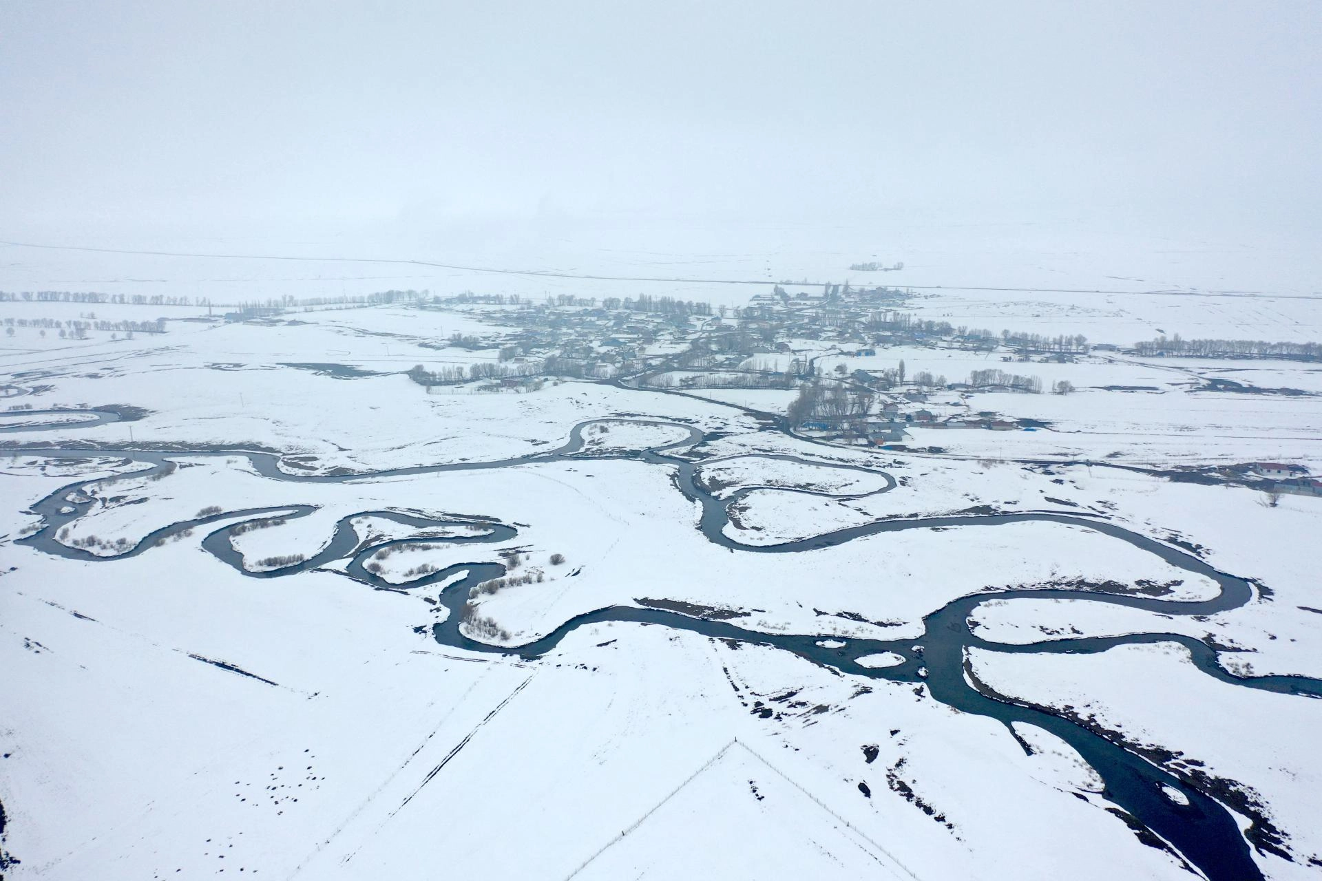 KARS (AA) - Kars'ın Arpaçay ilçesinde kıvrım kıvrım akan Telek Suyu'nun karla kaplı hali dronla görüntülendi.