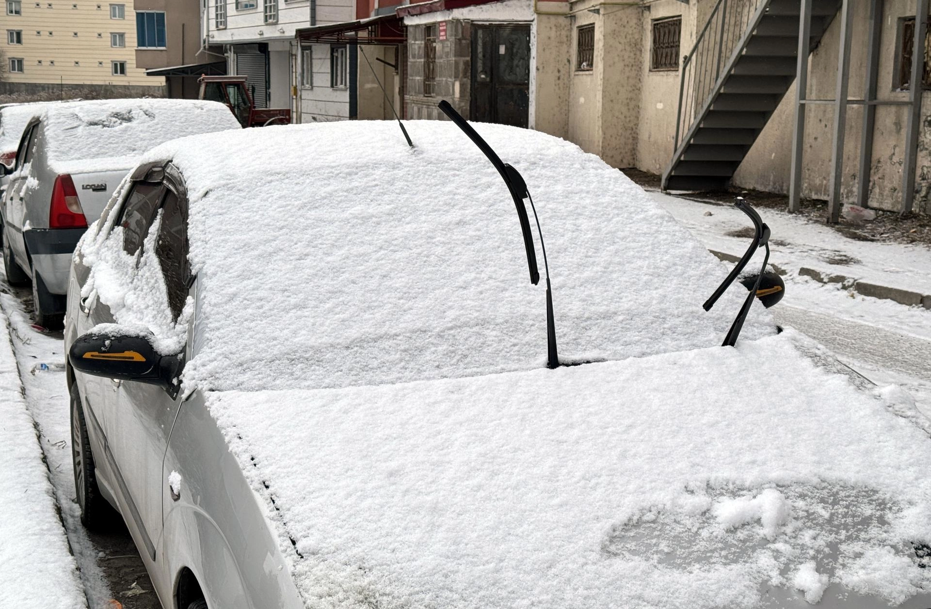 Aralıklarla devam eden yağış nedeniyle yollar ve park halindeki araçlar karla kaplandı.
