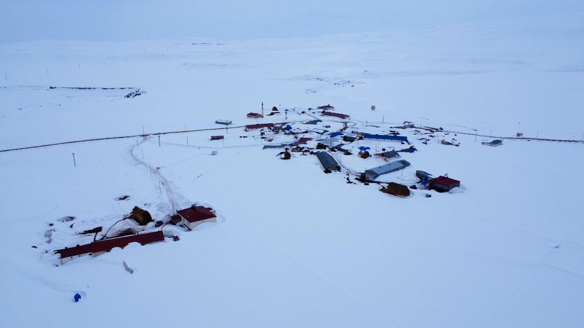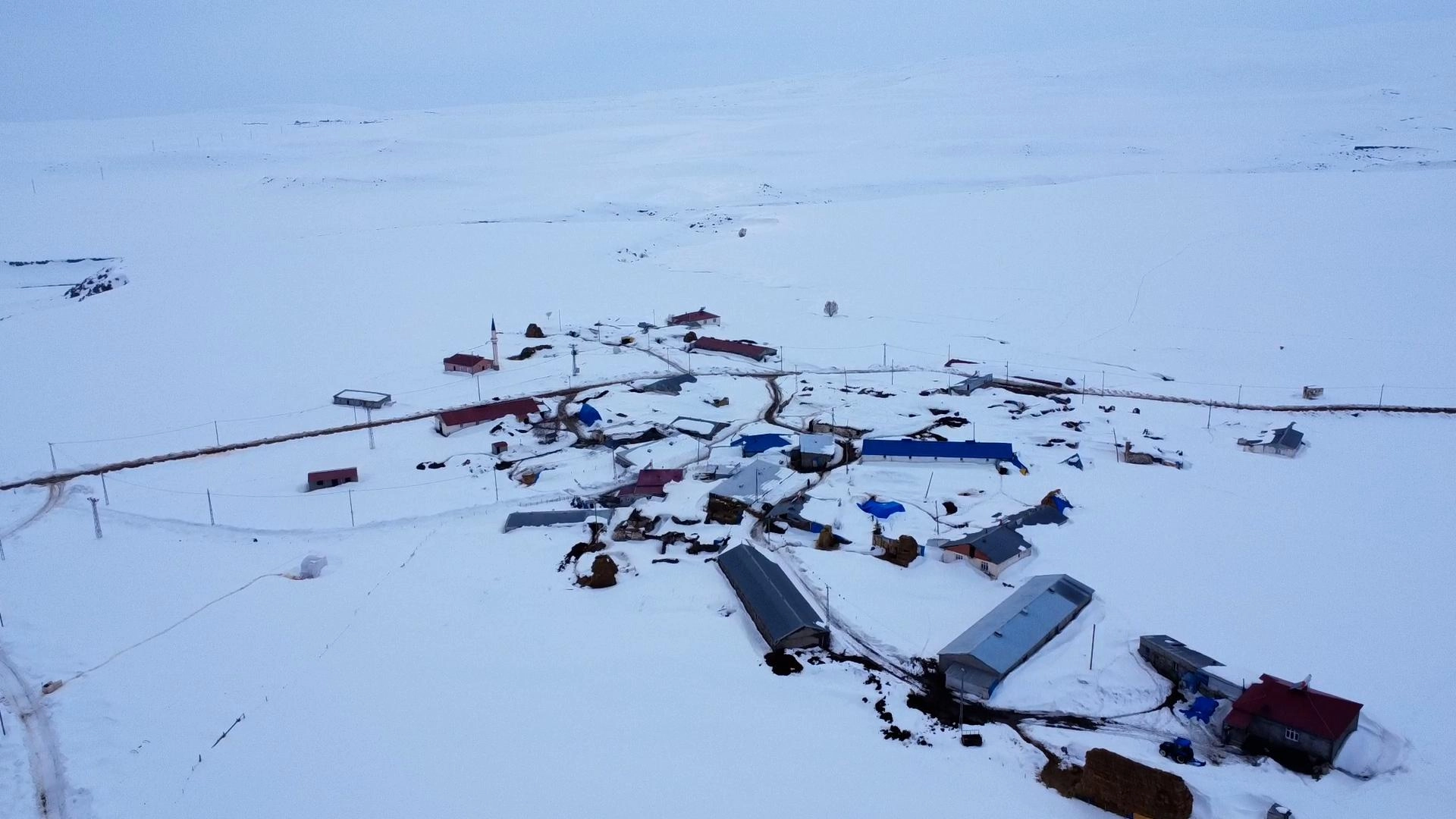 Köydeki evler, ahırlar ve araçlar karla kaplanırken, bazı yapılar ise neredeyse tamamen kar örtüsünün altında kaldı.