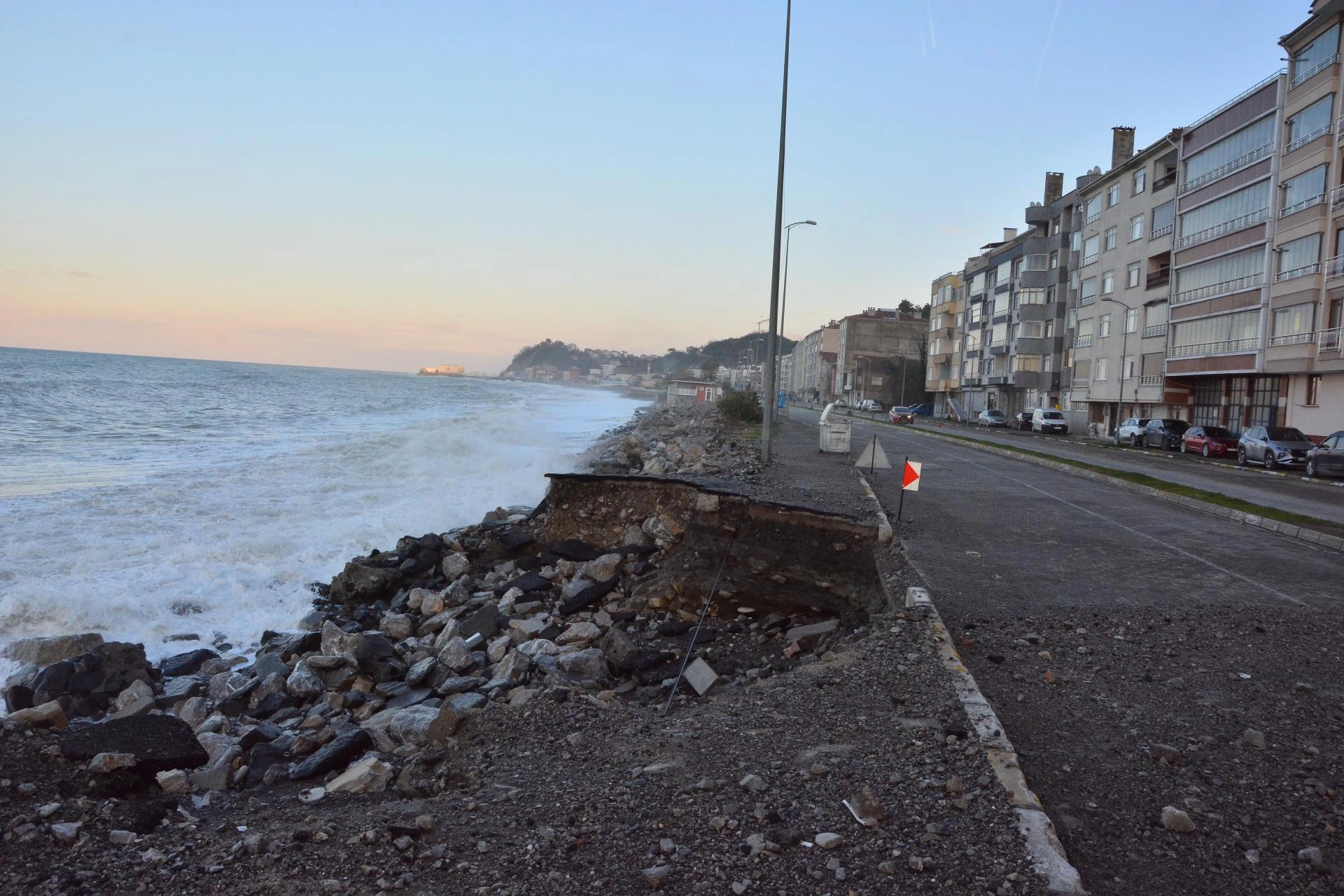 Dalgaların yola taşıdığı taş ve molozlar nedeniyle caddenin bir şeridi ulaşıma kapatılırken, trafik diğer şeritten kontrollü sağlandı.