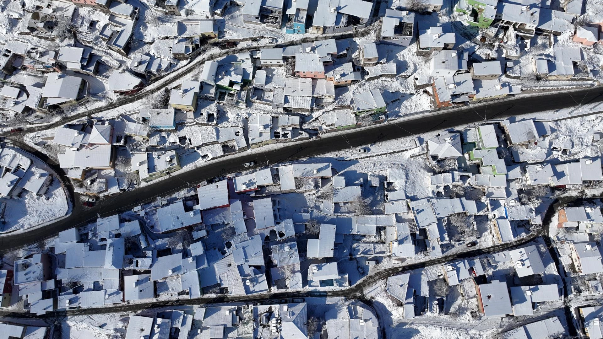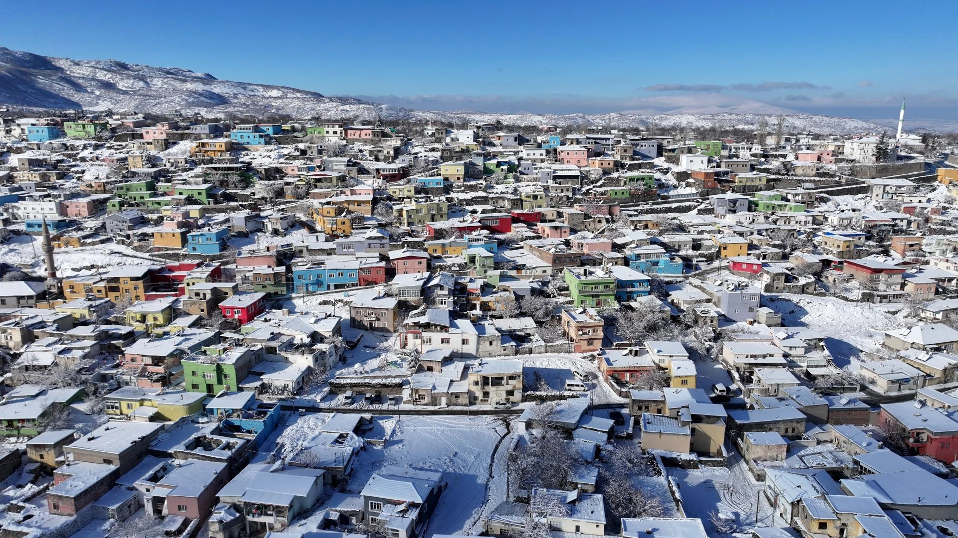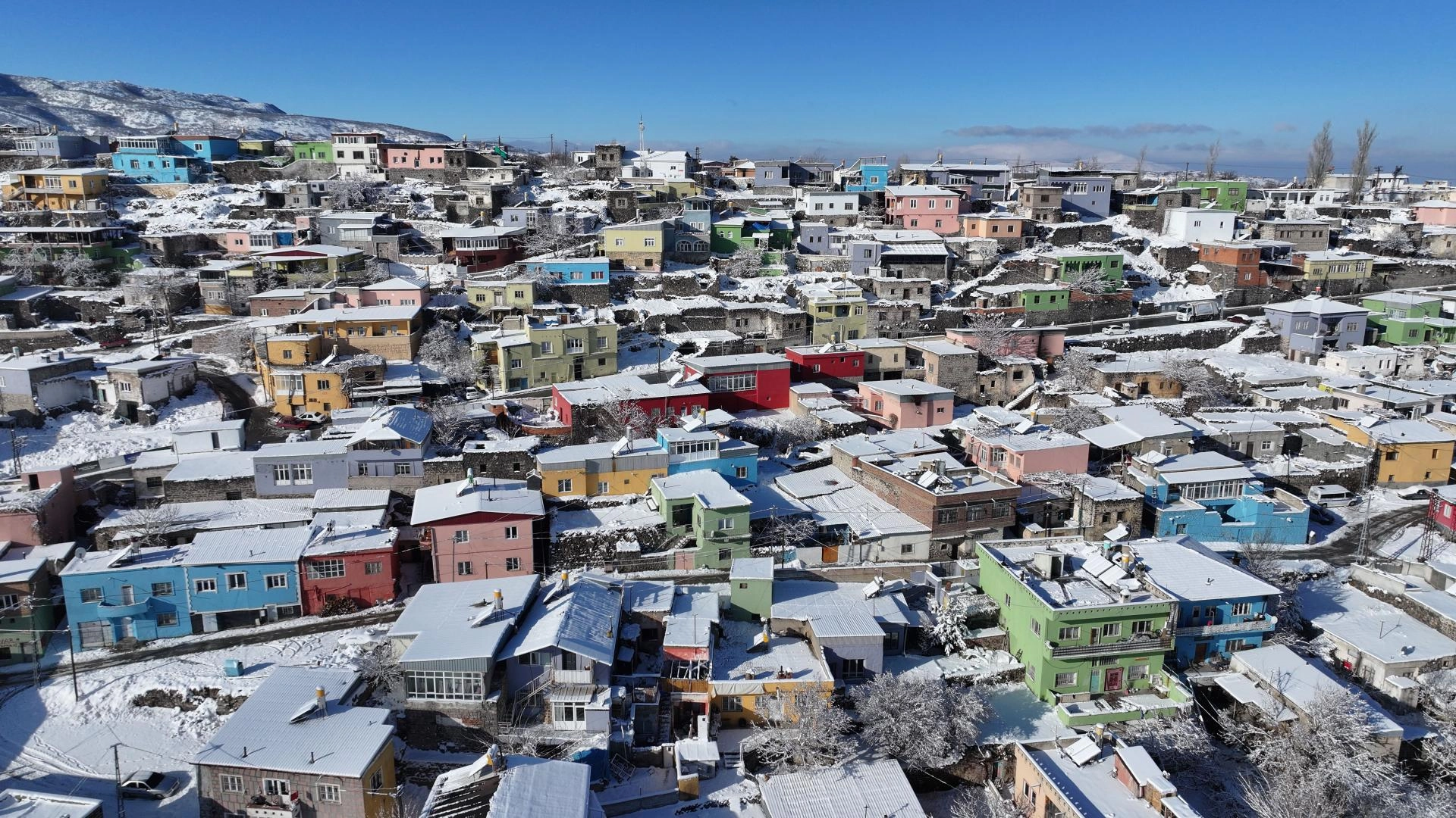 Rengarenk evlerin karla iç içe geçmesi, AA muhabiri tarafından dronla görüntülendi.